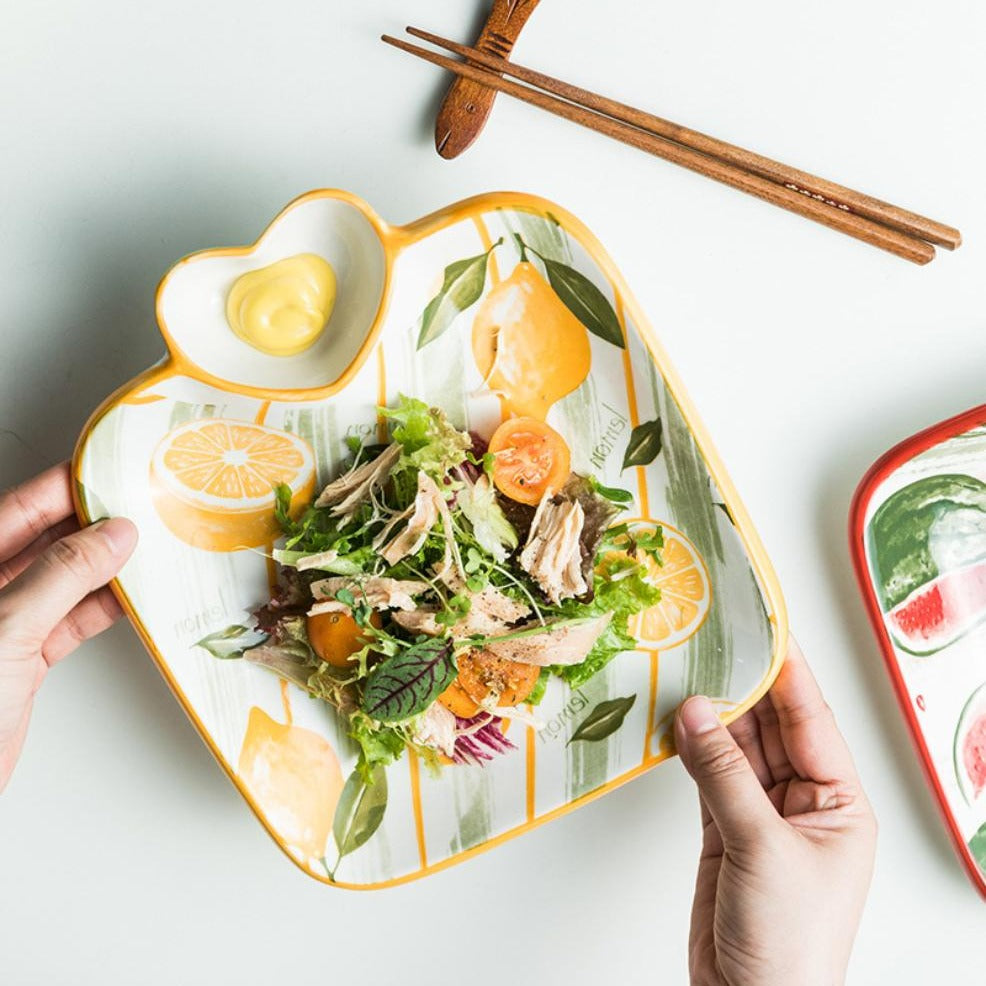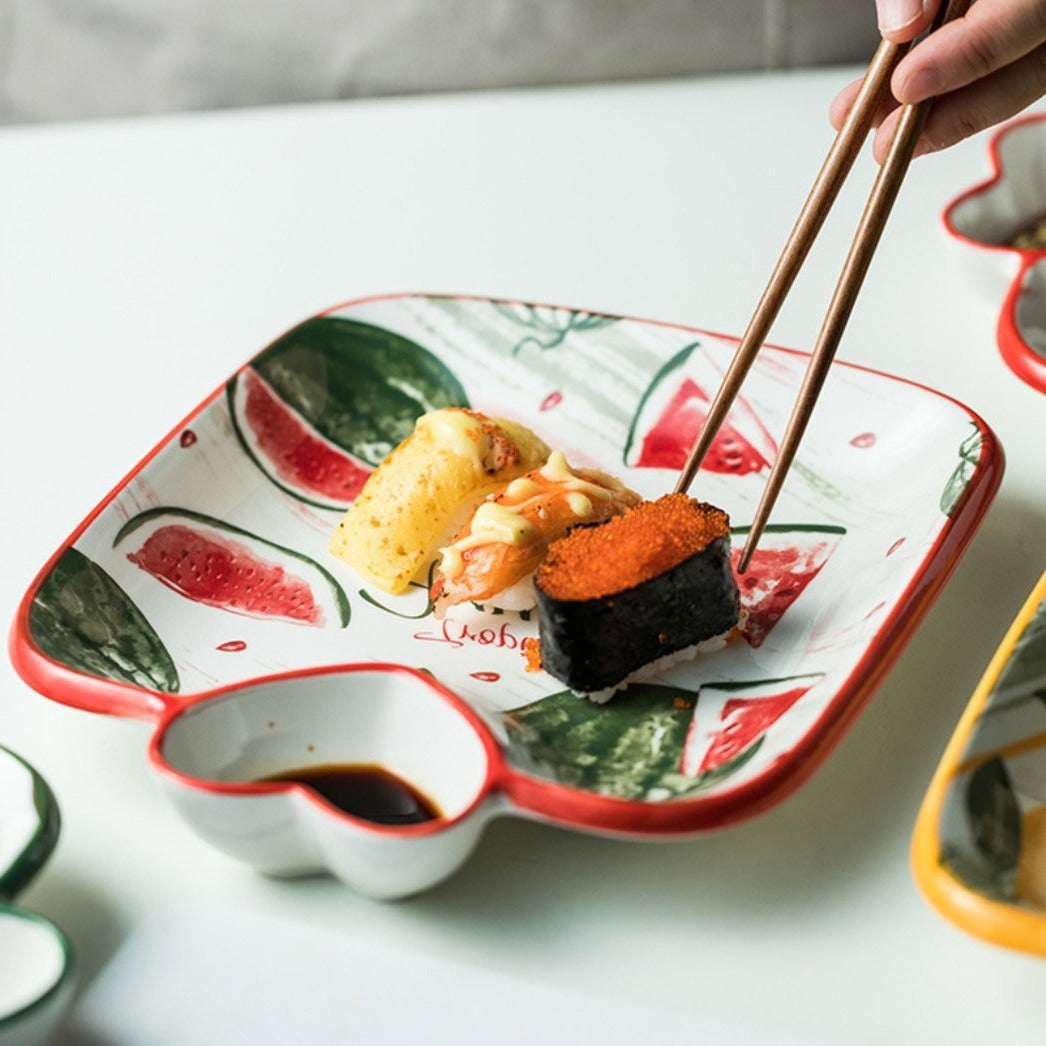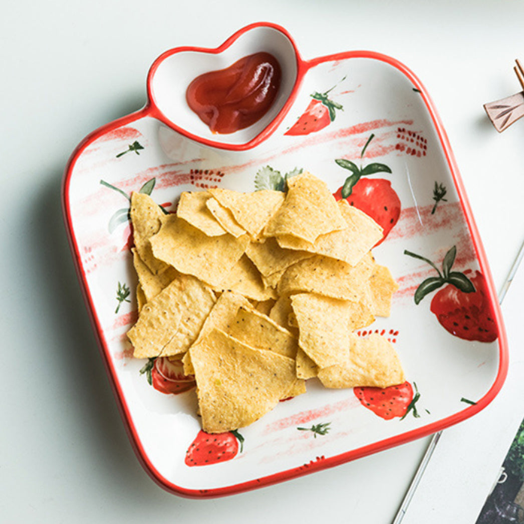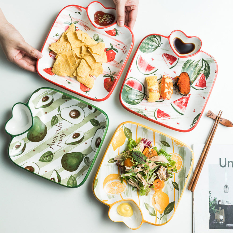 Chip and dip plate that comes in 4 modern day fruit prints and can double up as a platter. The sectioned plate with a mini heart section in white can be used as a starter plate or an appetizer plate for serving snacks like kebabs, fries, veggies, sushis, momos, tofu and more with accompaniments like dips, mayonnaise, sauces, oils, wasabi or seasonings like chilli flakes, rosemary and oregano.
