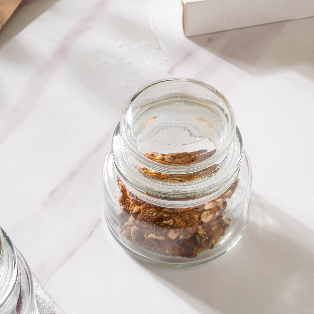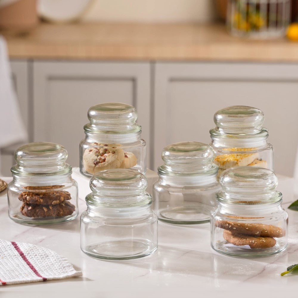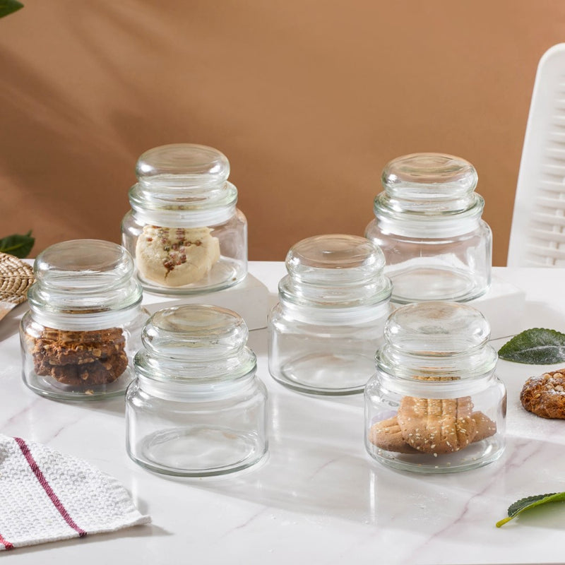 The set of 6 glass jars for kitchen storage makes for a utilitarian as well as a stylish addition to the kitchen shelf and dining table. The cylindrical glass jars feature a stylish lid with a silicon gasket that makes the lids airtight. The glass jar can be used as dry fruit containers for storage, pickle jars, airtight containers for fridge, chutney jars, or airtight containers for snacks. The easy-to-use jar set keeps the components fresh and healthy for consumption.