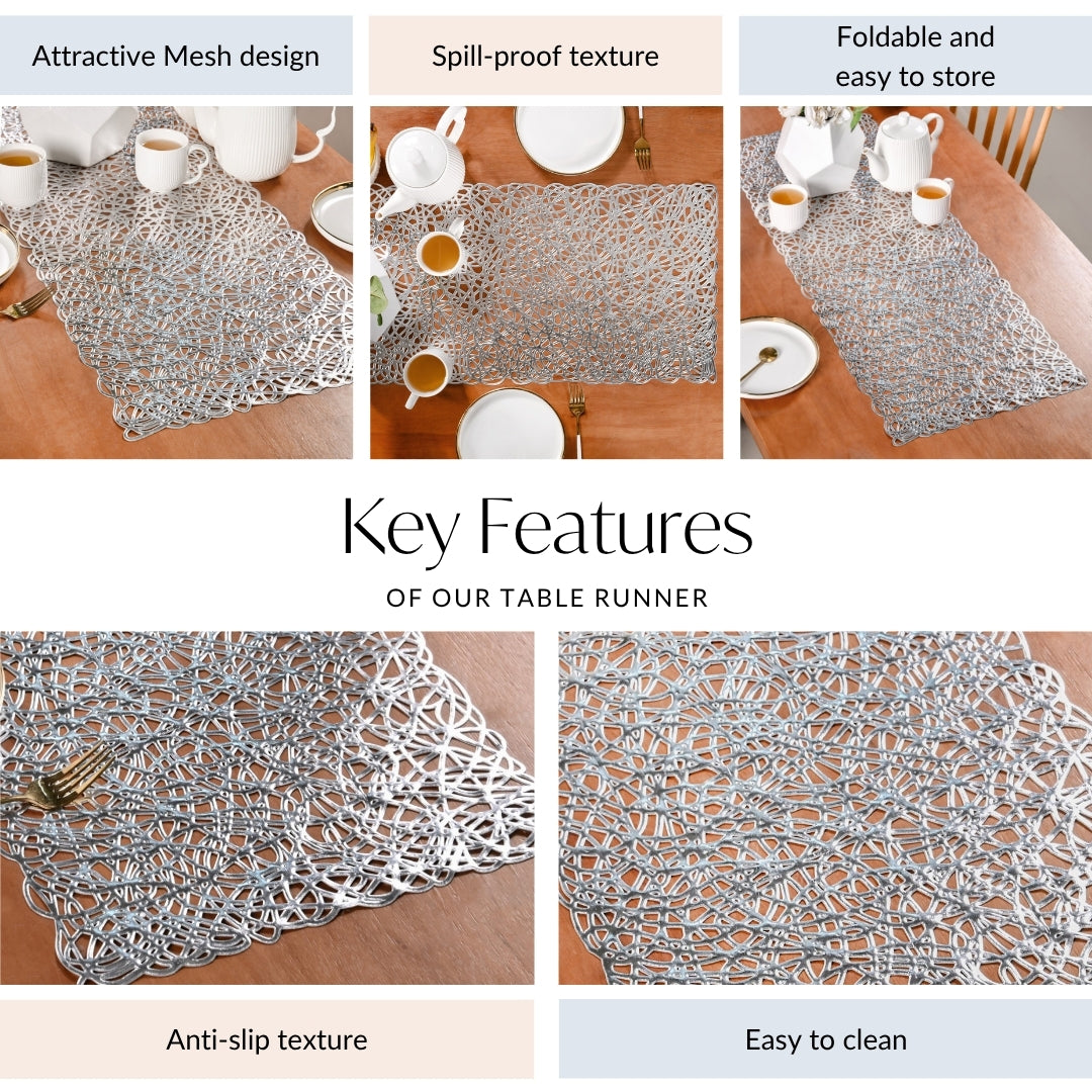 Benefits: Made of premium-quality PVC, the runner is sturdy, heat-resistant, and waterproof, designed to withstand daily wear and tear. This runner doubles as décor and table protection. It is resistant to heat, stains, and spills. Its anti-skid and crease-proof construction ensures ease of storage and use. A quick wipe restores its shine, making it a beautiful yet low-maintenance addition to your dining routine.