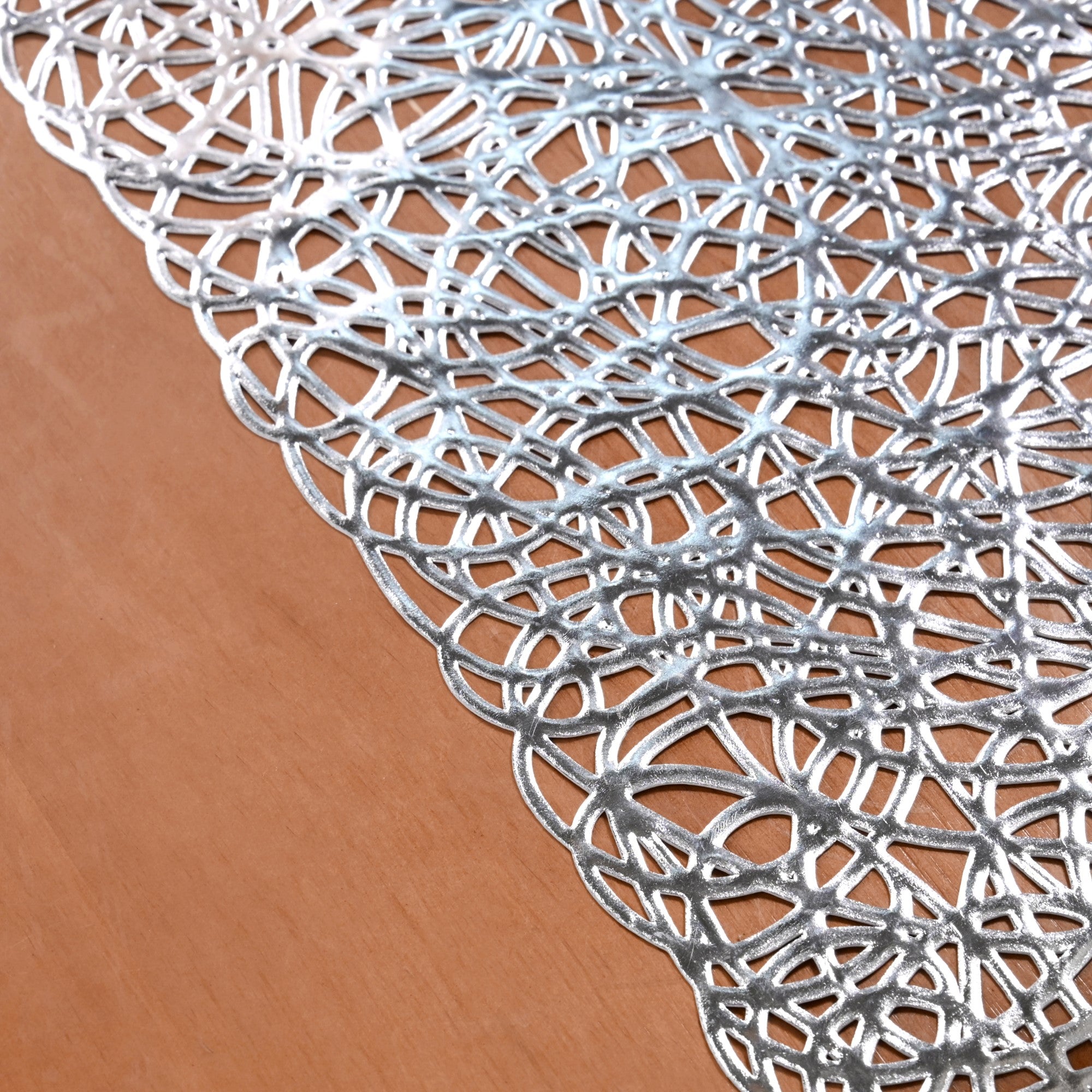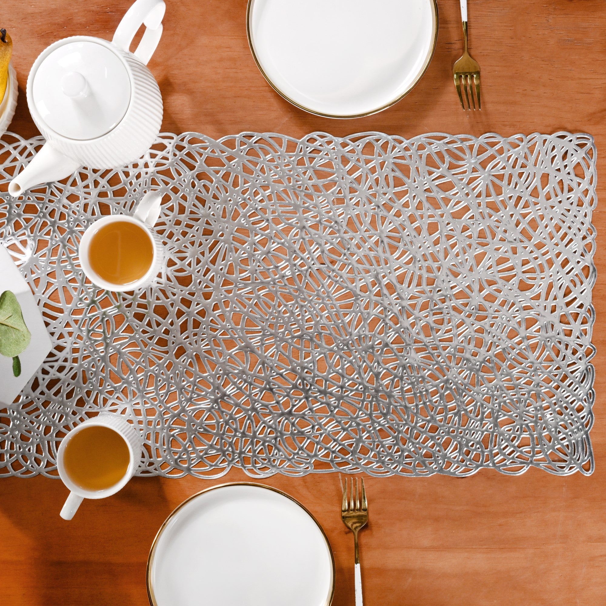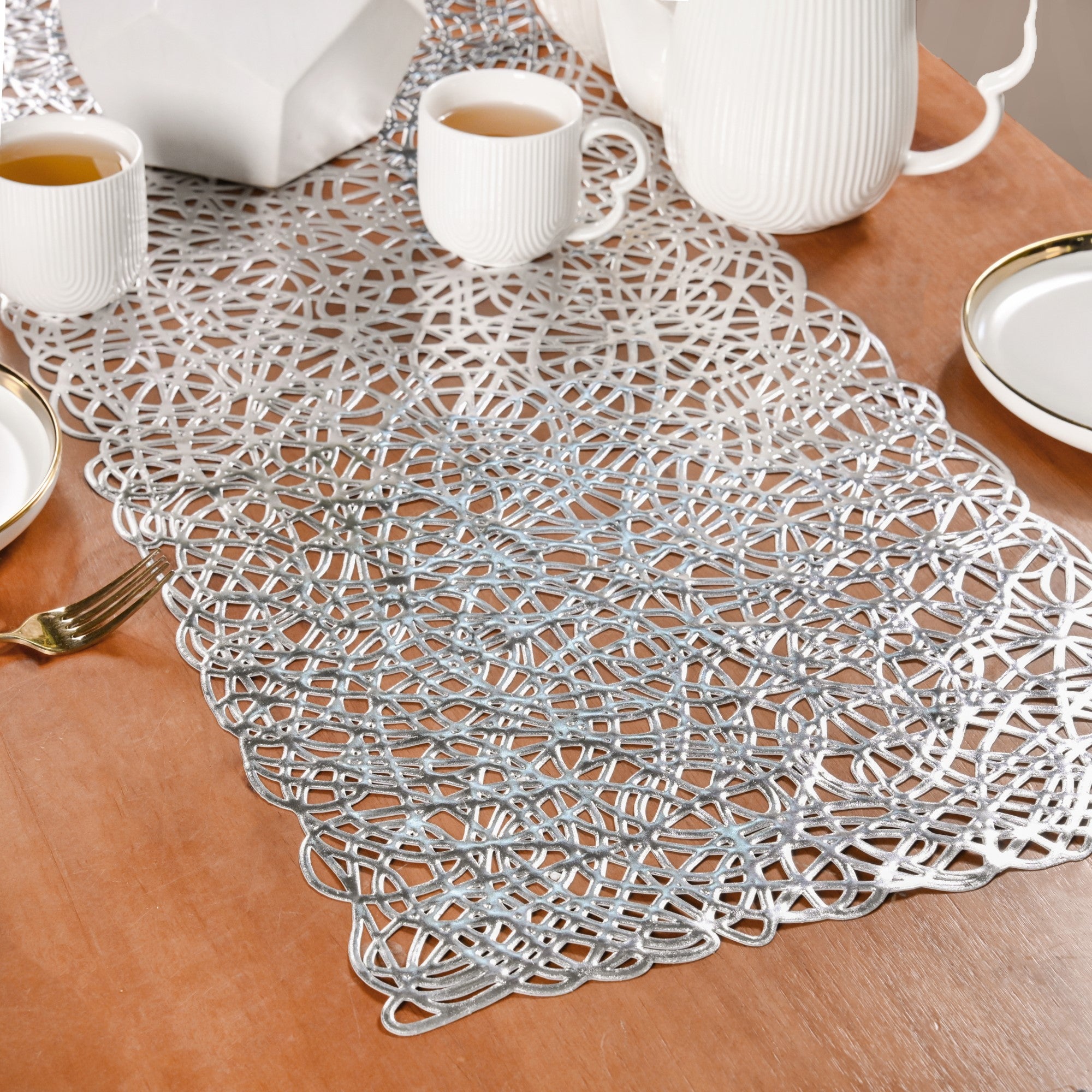 Design: Crafted for those who appreciate contemporary allure, this runner adds an eye-catching yet refined touch to everyday or festive tablescapes. Its standout feature is an intricate design, resembling a beautifully woven tapestry of abstract, interconnected loops and organic shapes. The continuous, interwoven pattern gives it a unique, unconventional edge, with fine line detailing that enhances its metallic sheen and visual depth.