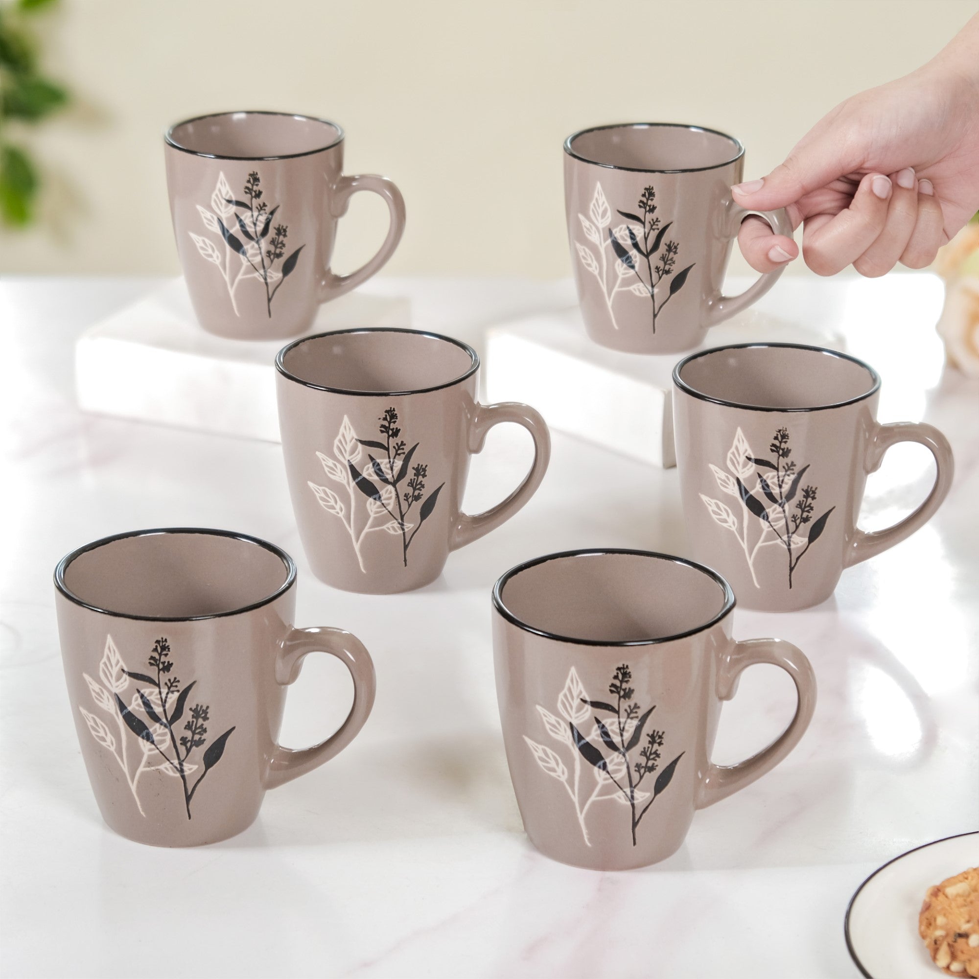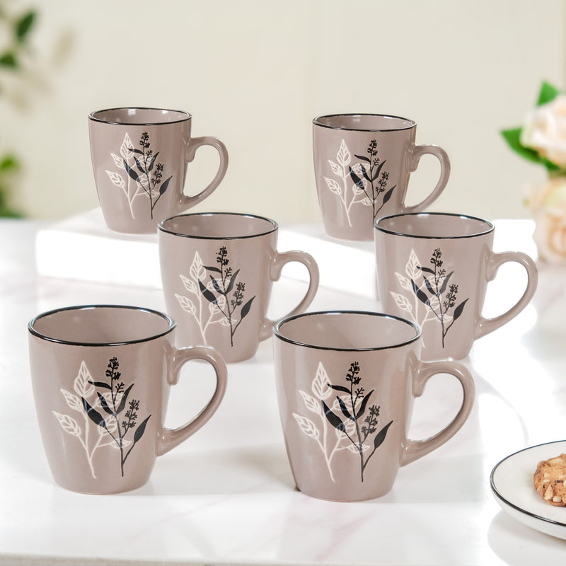 Elevate your morning ritual with our light green black and white leaves design coffee mug set of 6. Meticulously crafted from premium ceramic, these mugs are a masterpiece of precision, boasting an enchanting leaves design—one in bold black and the other in crisp white, silk-screen printed onto the cups. Not only do they add an artistic touch to your coffee time, but their black rims, and chip-resistant build guarantee longevity. You can sip your favorite brew with confidence, thanks to the comfortable non-slip grip. Plus, these mugs are a breeze to maintain, as they are both microwave and dishwasher-safe.