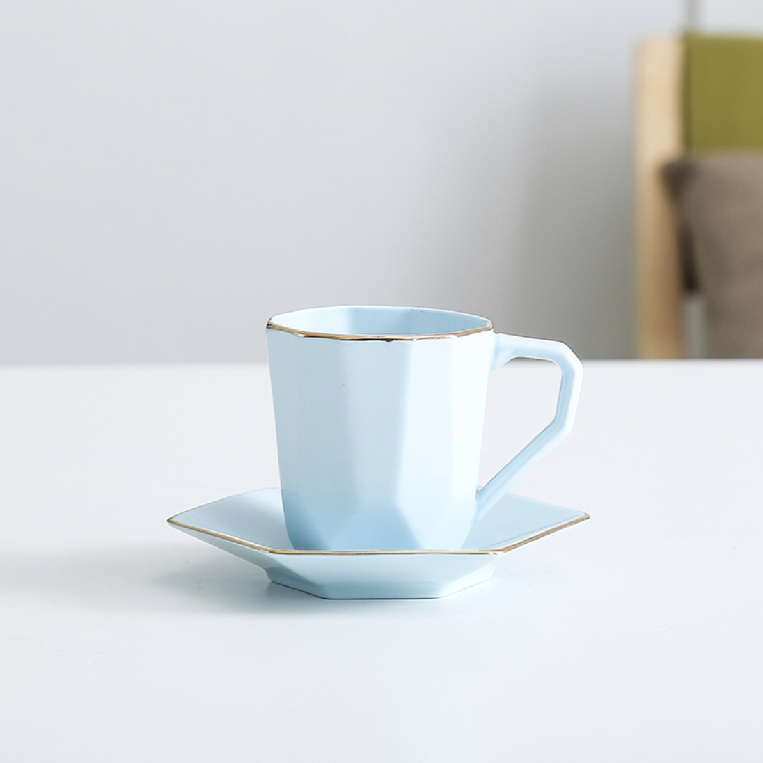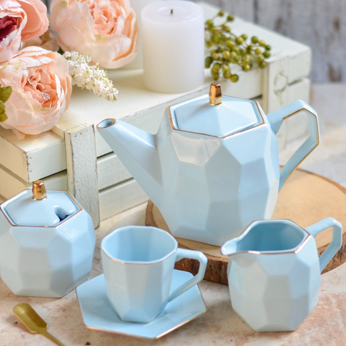 Pastel blue modern tea set with a sugar container, a milk pot, 4 tea cups with saucers and a tea pot that comes with a touch of gold along the rims. The ceramic sugar containers can be used for serving sugar or sugar cubes with the milk creamer that can be used to serve milk with a tea or coffee serving or can be used to serve cream or molten chocolate with dessert. The tea cup and teapot with lid can be used to serve tea, coffee or hot milk at any time of the day or at an afternoon tea party or high tea party. The ceramic tea set is reflective of the serving etiquettes of a host that can leave a lasting impression and elevate the tea serving. Tea cups can also be bought individually and the teaspoons are not included.