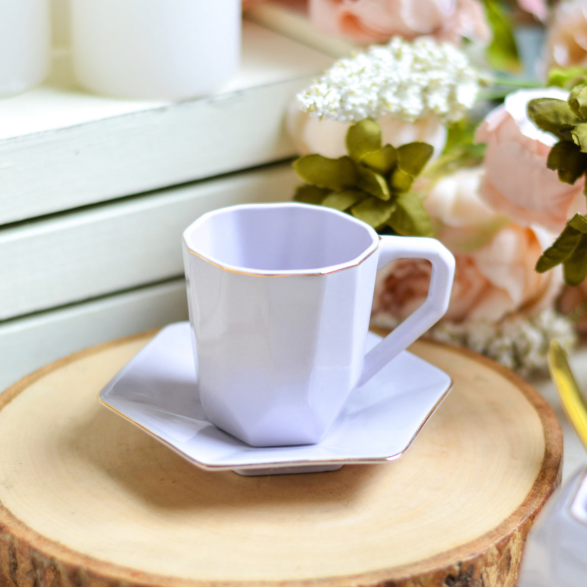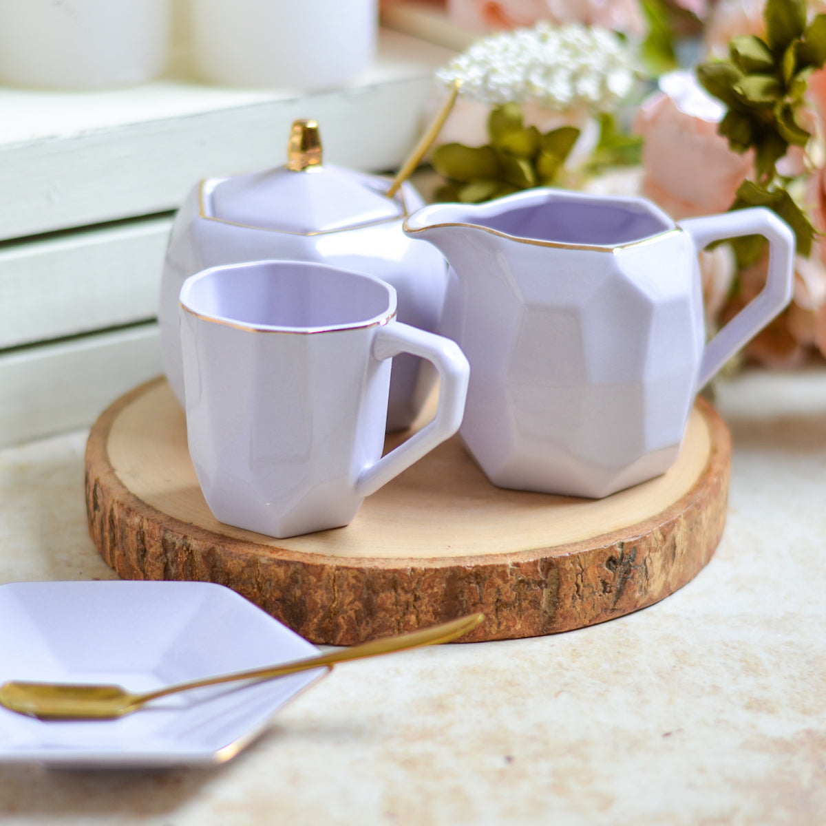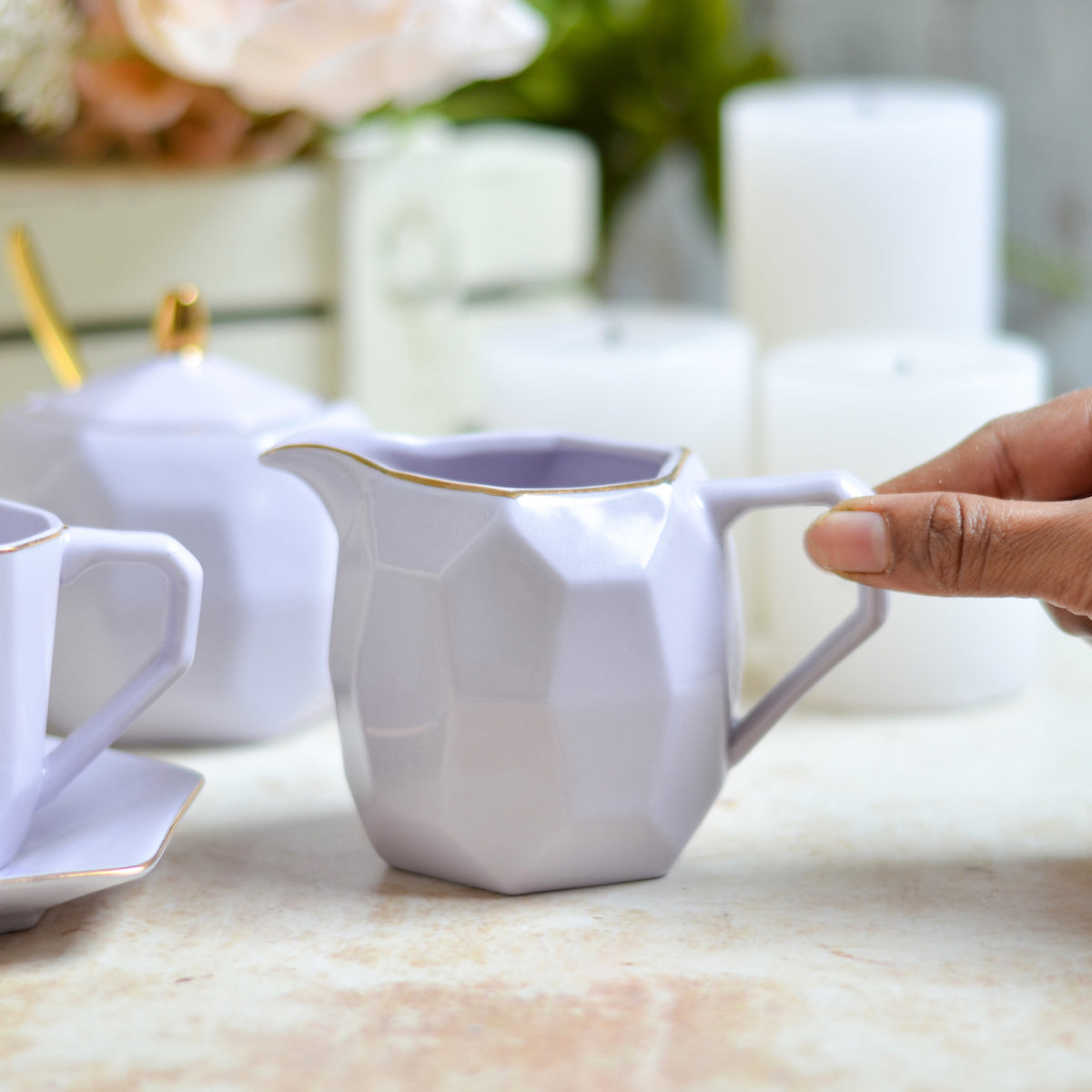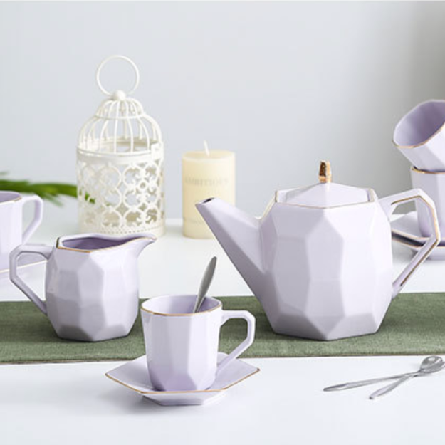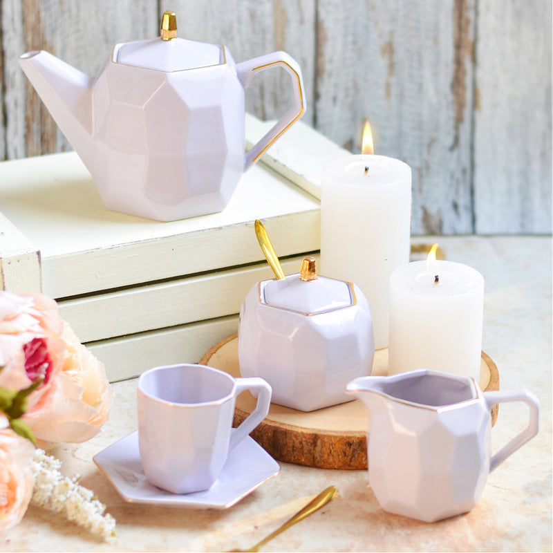 Purple modern tea set with a sugar container, milk pot, 4 tea cups and tea pot that comes in a pastel shade. The ceramic sugar containers can be used for serving sugar or sugar cubes with the milk creamer that can be used to serve milk with a tea or coffee serving or can be used to serve cream or molten chocolate with dessert. The modern tea cup and tea pot with lid can be used to serve tea, coffee or hot milk at any time of the day or at an afternoon tea party or high tea party. The ceramic tea set is reflective of the serving etiquettes of a host that can leave a lasting impression. Tea cups can also be bought individually and the teaspoons are not included.
