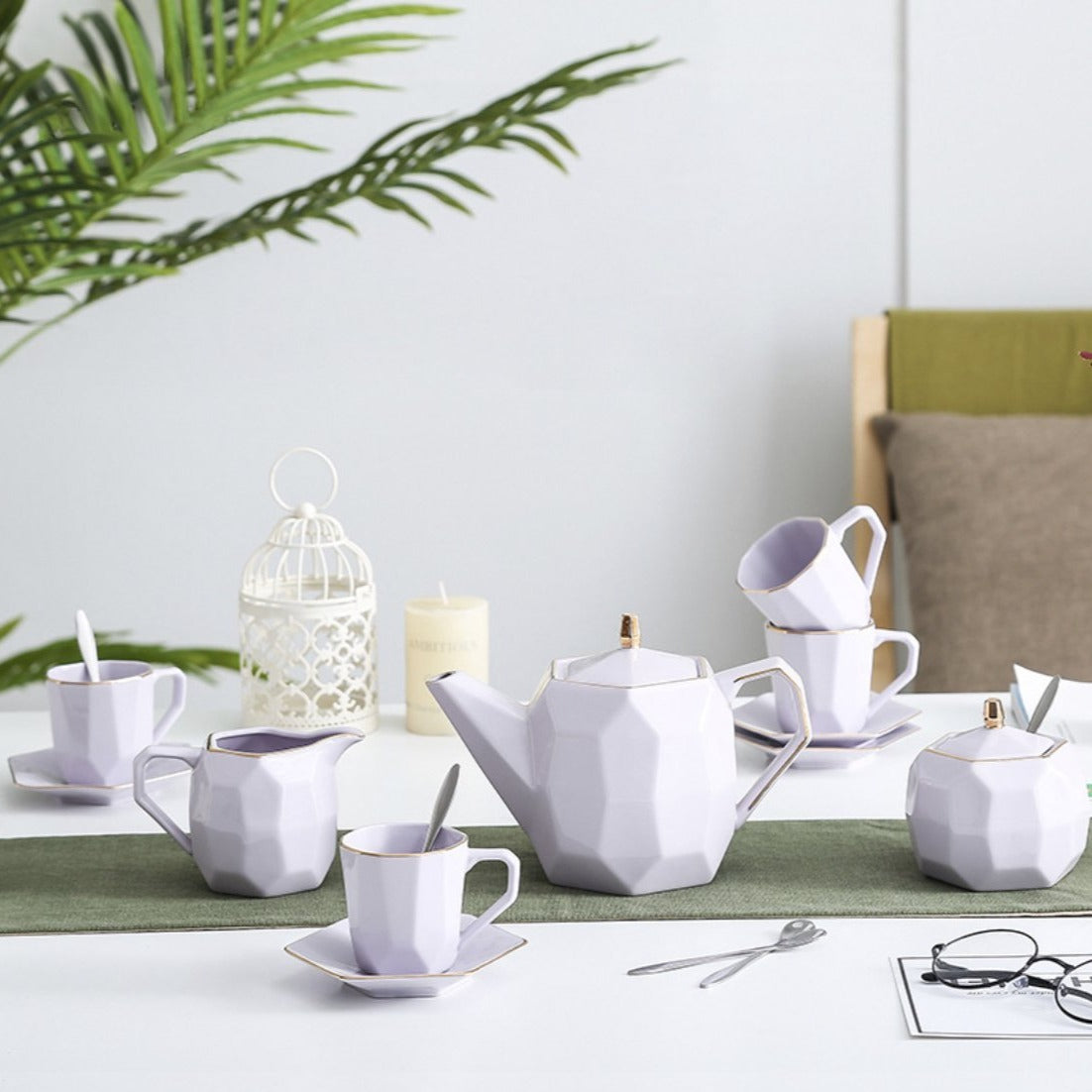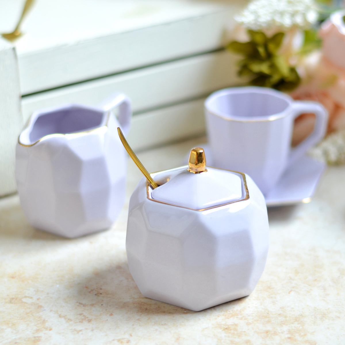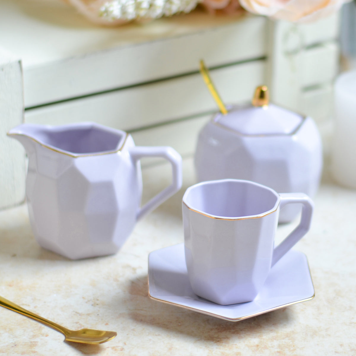 Nestip: The tea pot, tea cup, milk pot and sugar pot can be paired with golden tea spoons for a complete tea set