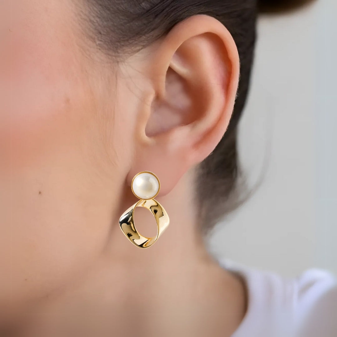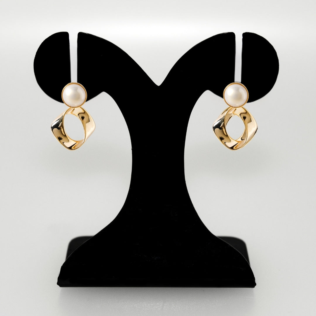 An ode to contemporary elegance, these dangle earrings draw inspiration from the soft, fluid forms seen in minimalist sculpture. The top features a lustrous white hue with a pearly iridescent finish, offering a delicate contrast to golden hues. The twisted design of the dangling element creates a graceful movement, making these earrings the perfect fusion of modern design and timeless sophistication.