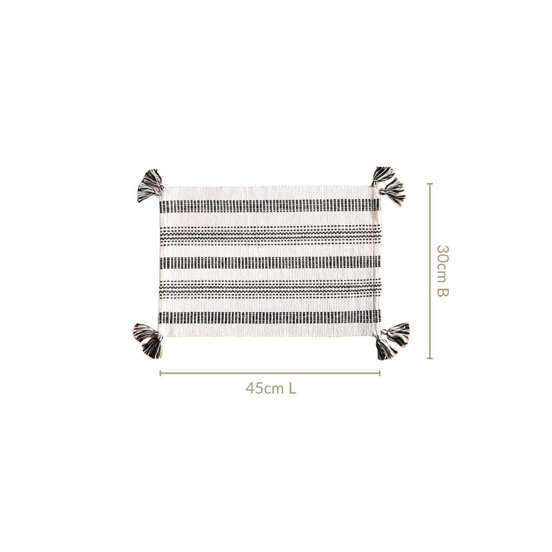 Introduce bold texture and style to your table with this striking monochrome placemat. Its woven patterns and playful tassel details bring a refined touch to every meal.