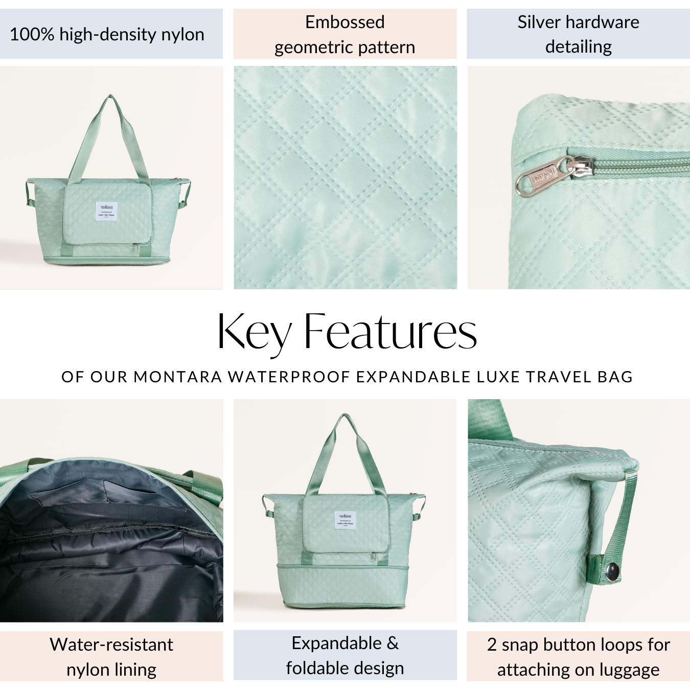 Design: Made from high-density nylon, the Montara travel bag is designed to withstand years of use. Its soothing light mint green exterior features an embossed geometric pattern that adds a touch of sophistication and texture. The silver hardware detailing contrasts beautifully with the mint hue, creating a sleek, modern look. The bag’s standout feature is its expandable and foldable design, allowing you to transition effortlessly from a roomy weekender to a compact, easy-to-store pouch. Equipped with a spacious main compartment, two zippered exterior side pockets, and well-placed interior pockets, this travel tote ensures everything has its place. The waterproof nylon lining keeps your belongings protected, while the short, sturdy handles make for comfortable carrying.