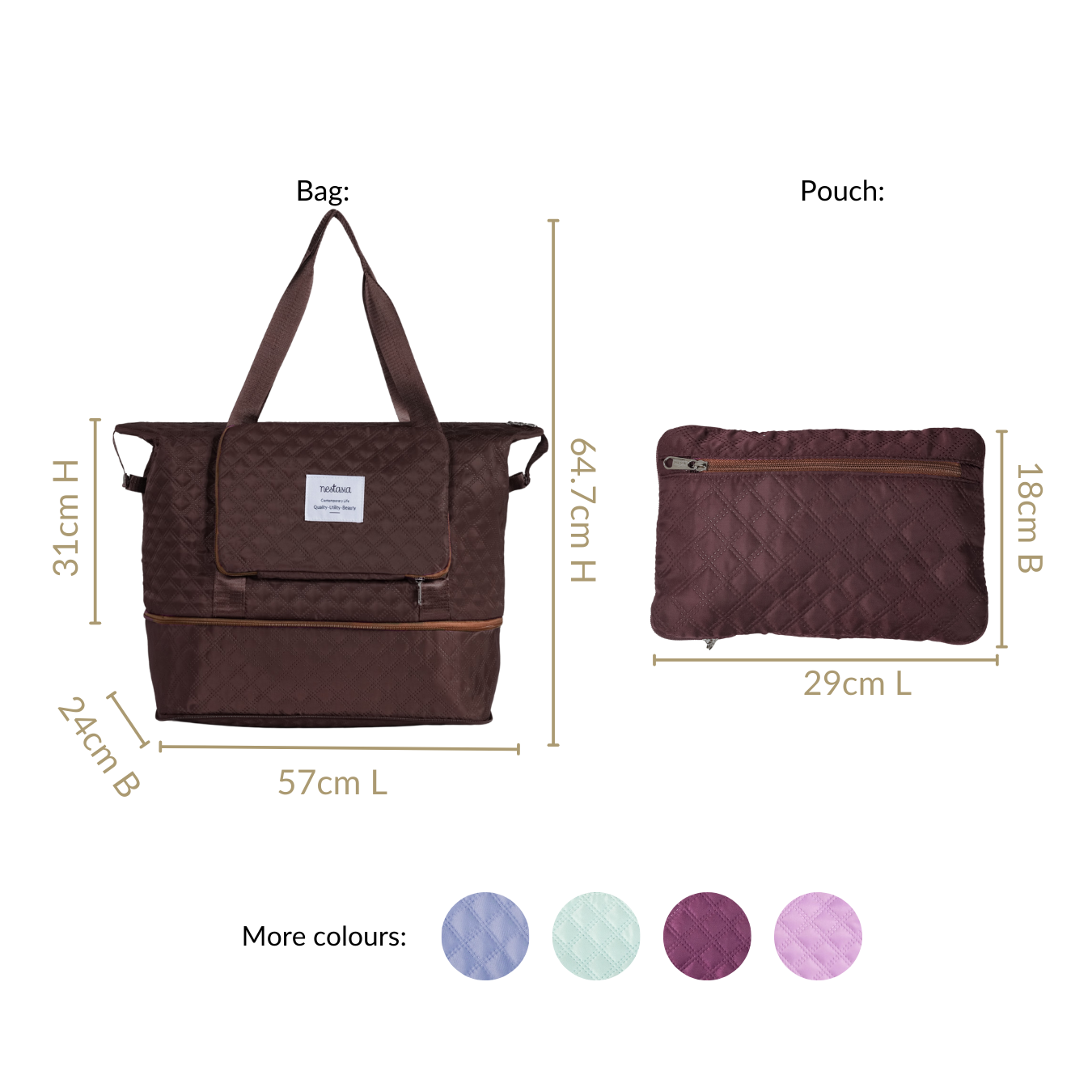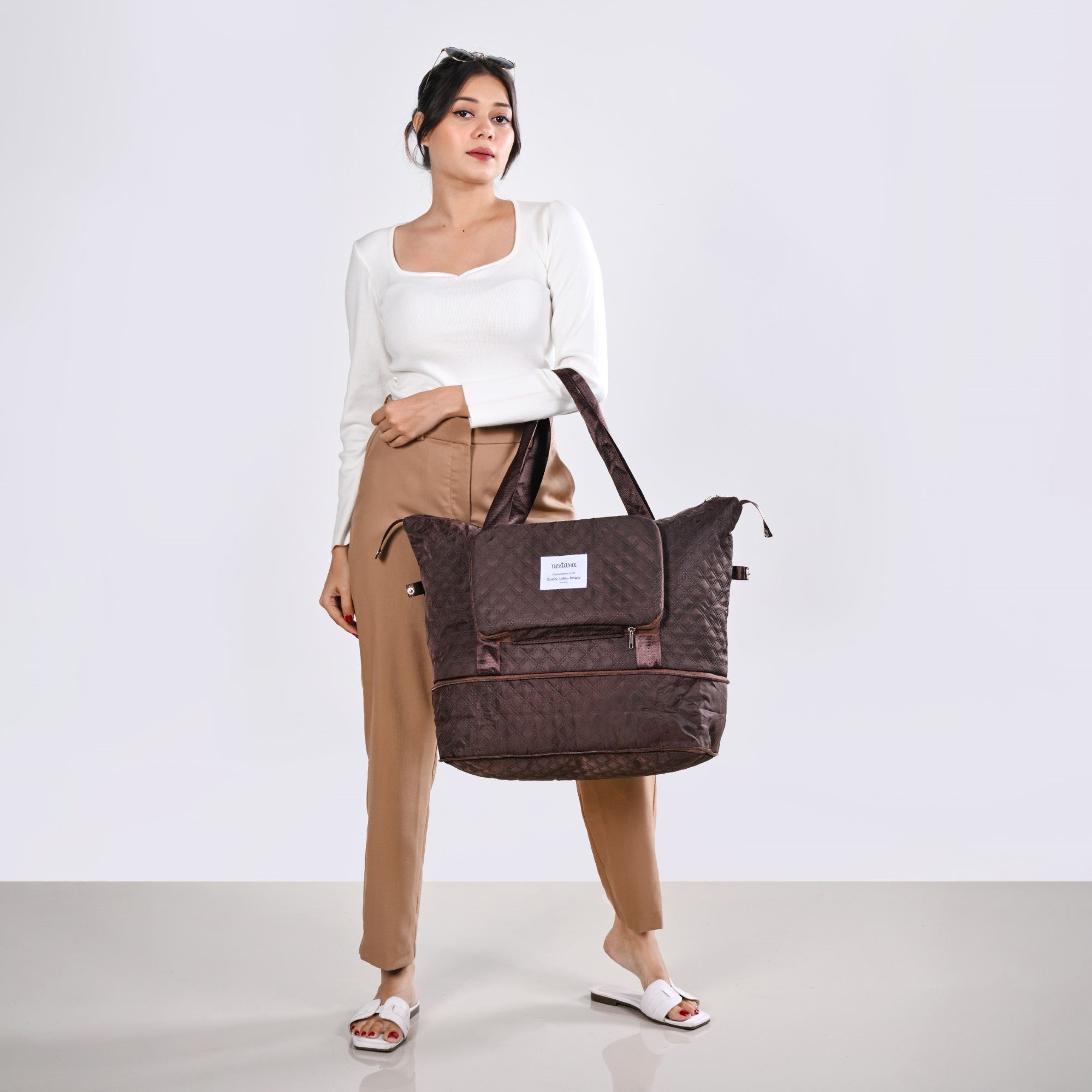 Design: Expertly crafted from high-density nylon, the Montara bag promises durability that withstands years of adventures. Its deep chocolate brown hue exudes elegance and pairs seamlessly with any travel wardrobe. The exterior features an embossed geometric pattern, adding a refined texture that catches the eye. Complemented by silver hardware detailing, the bag has a modern, polished look. The Montara’s expandable and foldable design makes it effortlessly versatile, allowing travellers to adjust its size according to their needs. Equipped with a spacious main compartment, two exterior zippered side pockets, and a thoughtfully organized interior with multiple pockets, it keeps your belongings accessible and secure. The water-resistant lining provides added protection, while short, sturdy handles ensure a comfortable carry.