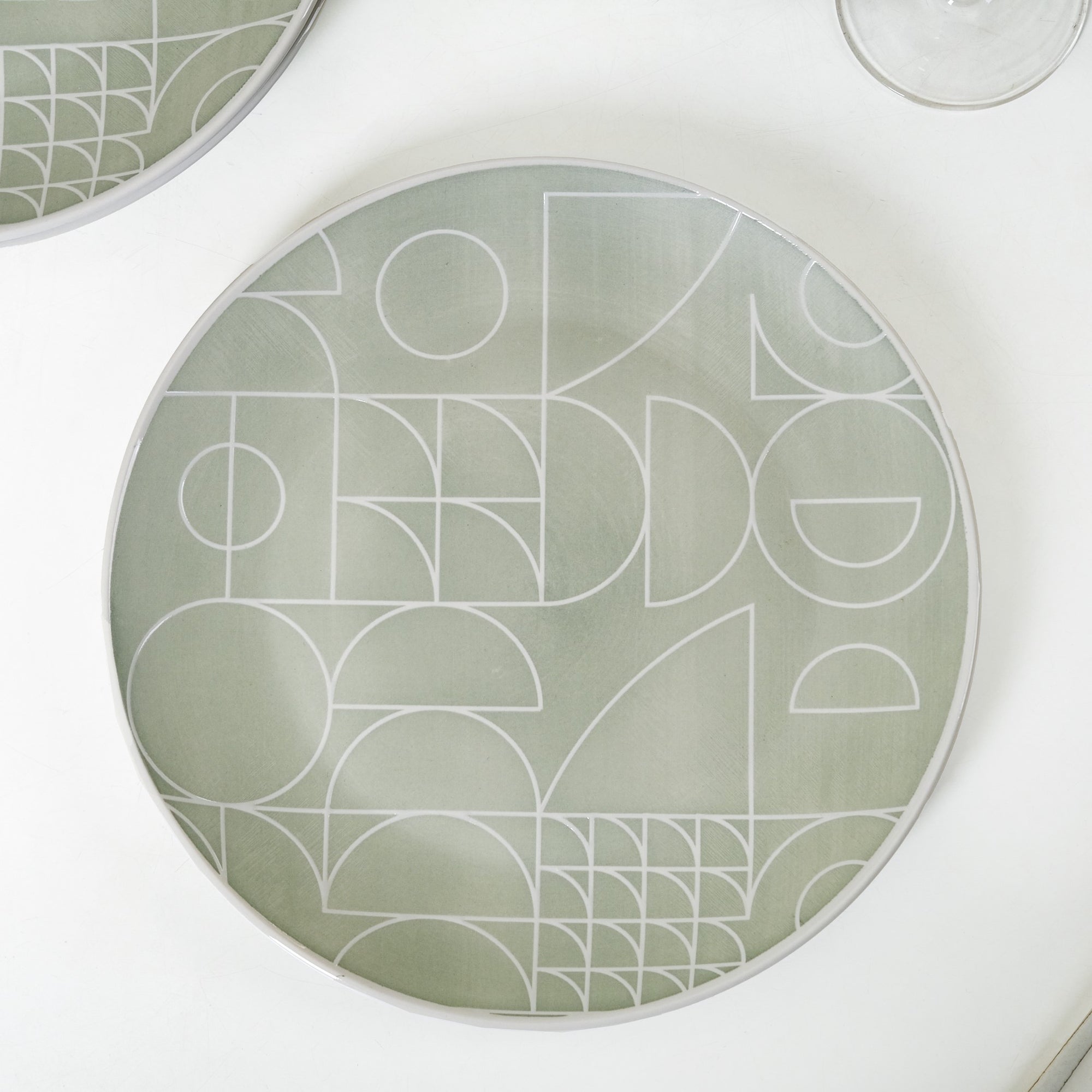 Design: The Monvia dinner plates feature intricate geometric Art Deco patterns, creating a striking visual appeal. With a hand-glazed textured surface and glossy designs, they showcase a harmonious blend of modern and vintage aesthetics. The matte finish base, in a soft mint green hue, adds a subtle touch of sophistication.