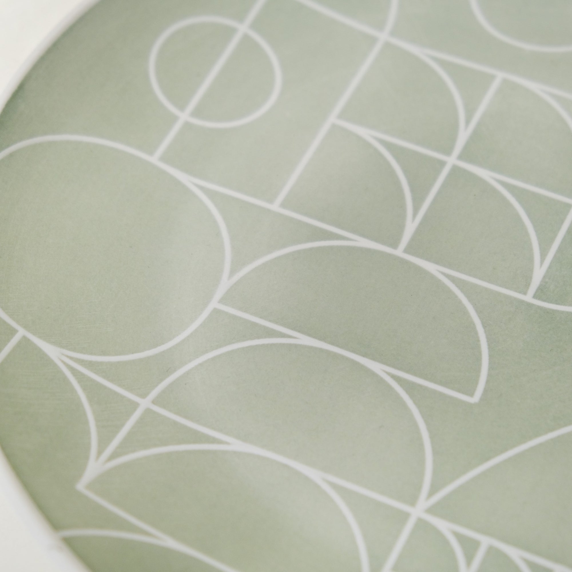 Nestip: Pair the soft mint green base of the ceramic plates with contrasting colours like deep blues, golds, or whites to create a visually dynamic aesthetic and make the geometric Art Deco patterns stand out.