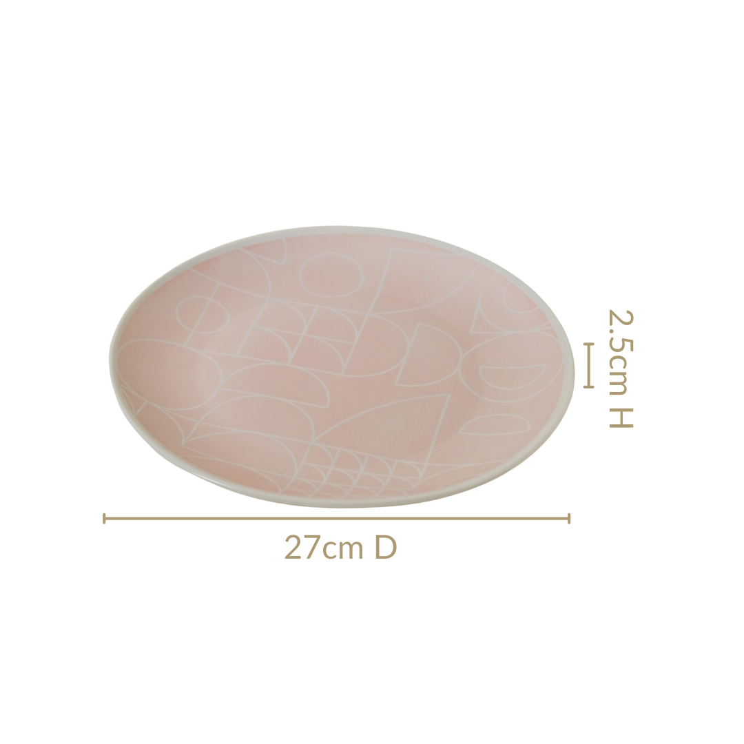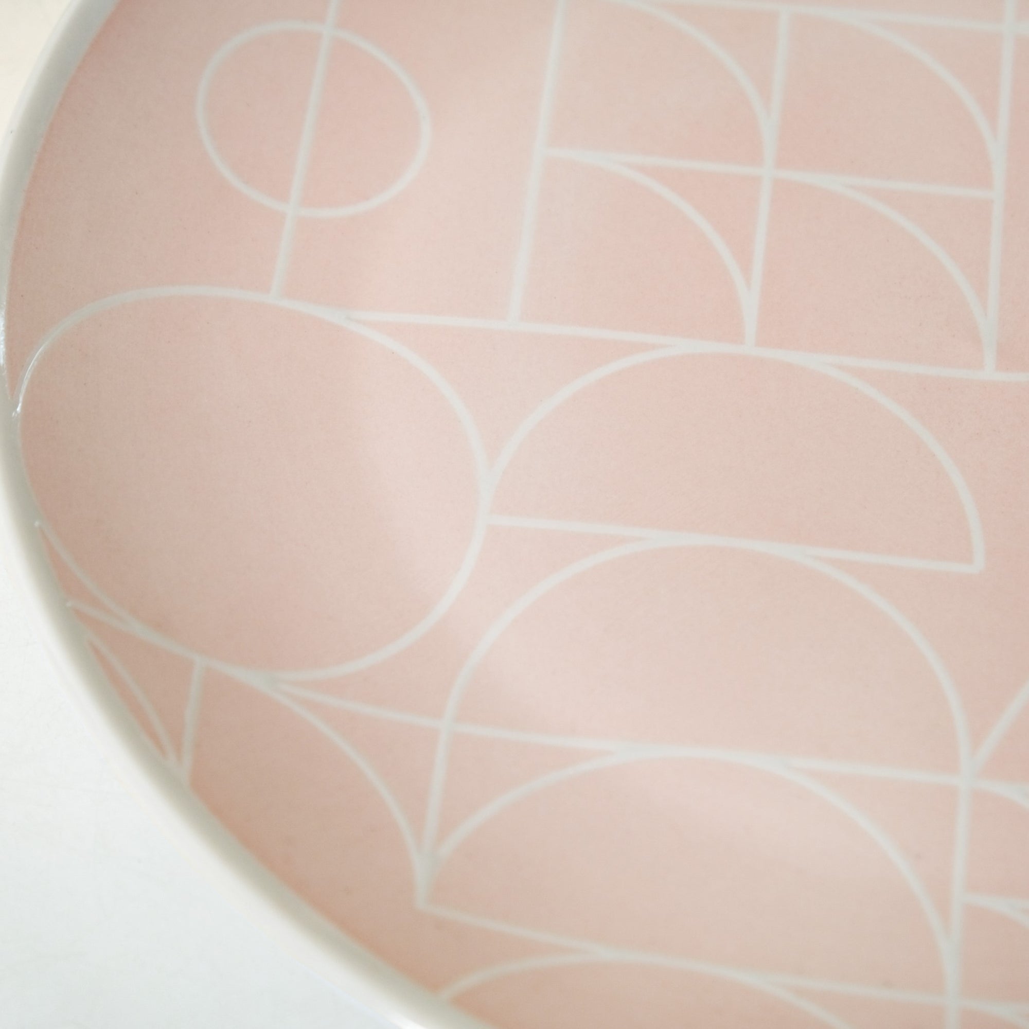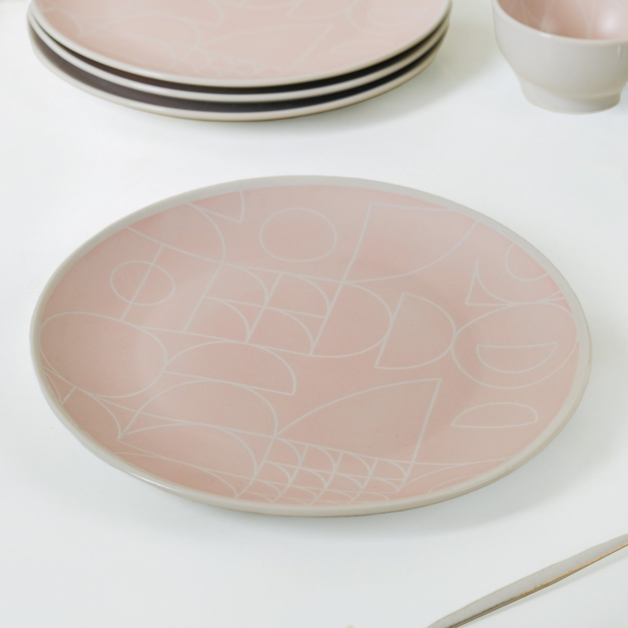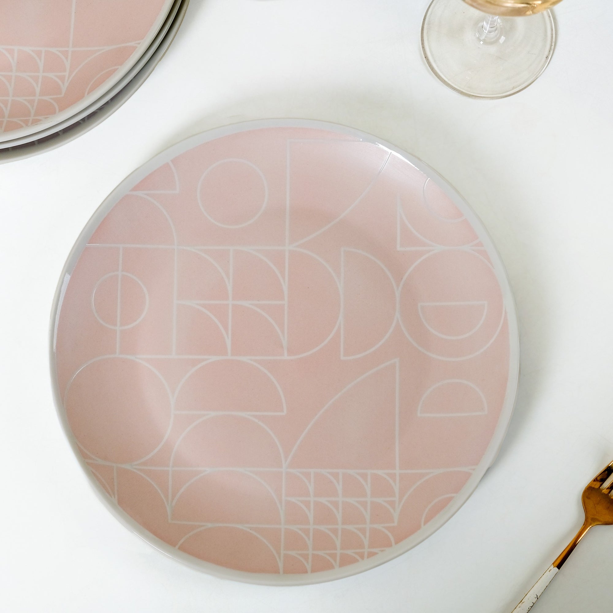 Design: Inspired by the bold geometric patterns of Art Deco, the Monvia ceramic plates feature intricate designs that capture attention with their dynamic symmetry. The matte pastel pink base contrasts beautifully with the glossy accents, creating a visually captivating set that elevates any meal.