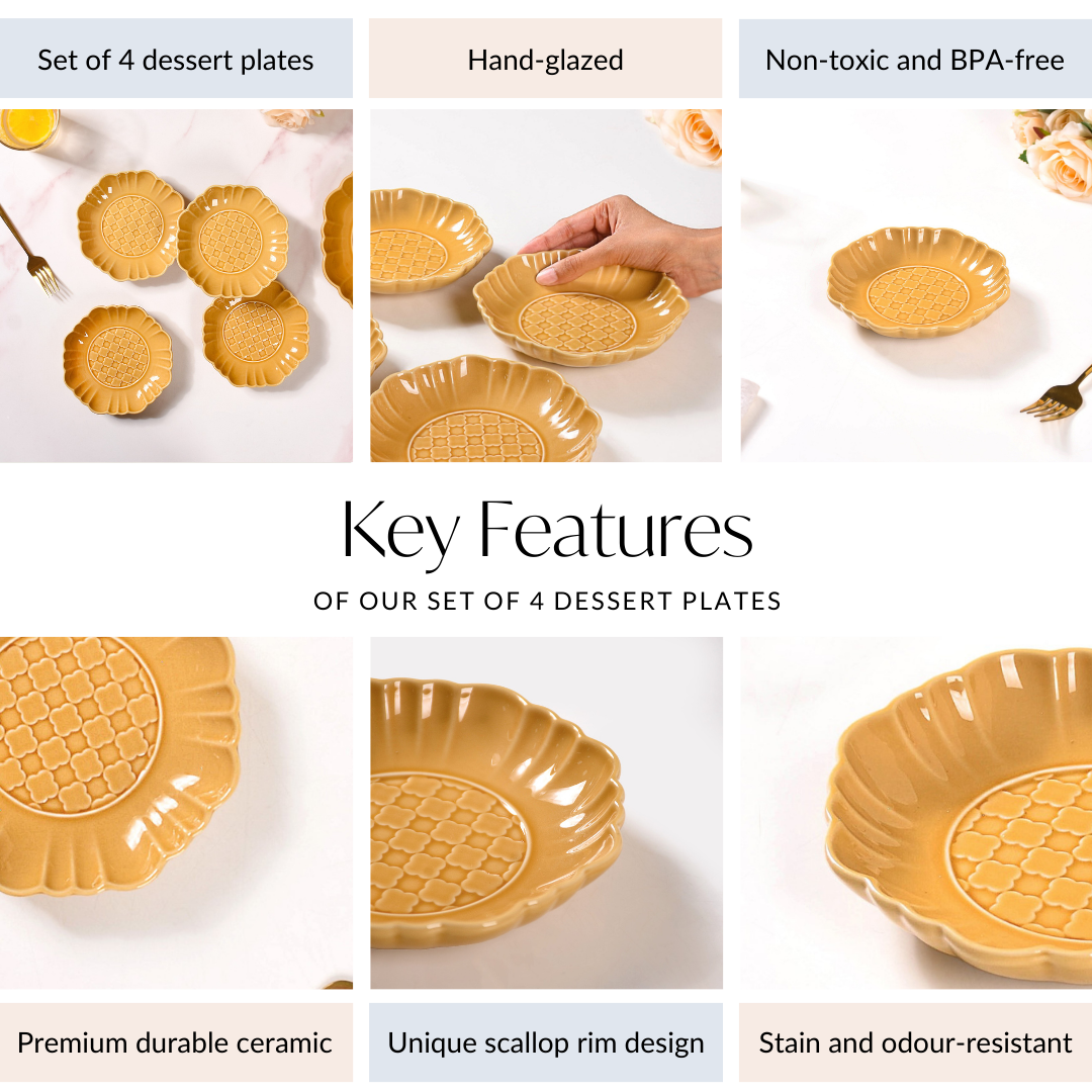 Set of 4 dessert plates 100% food safe (international food grade standards) Non-toxic and BPA-free Hand-glazed Premium durable ceramic Dishwasher safe Microwave safe Stain and odour-resistant Unique scallop rim design Intricate Moroccan art motif pattern Ideal for serving dessert, fruit, and single serve meals