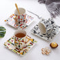 Tea mugs with saucer that have a mosaic pattern and come in three colour variants. The tea cups have a fine handle along with a square saucer that makes the cup set look sleek and elegant. The coffee cups and saucers are ideal for a regular caffeine fix or can also be used for serving flavoured tea, milk or immunity booster drinks.