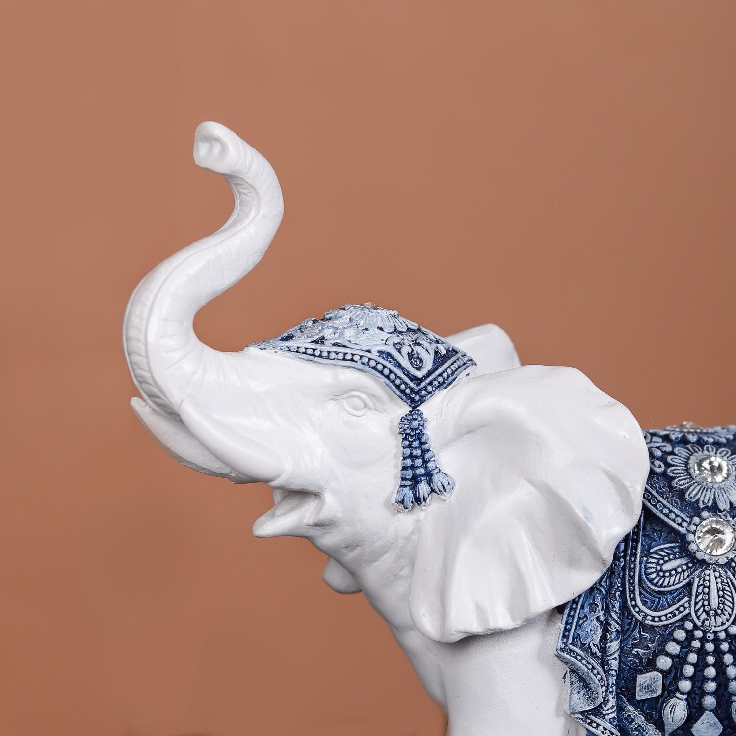 While the showpiece is designed with high-quality materials and is quite sturdy and durable, it is best if you use it for indoor use. This is because this showpiece showcases intricate blue patterns adorned with exquisite crystals on the body of each elephant. However, you can display this showpiece in covered outdoor areas to prevent exposure to harsh weather conditions.