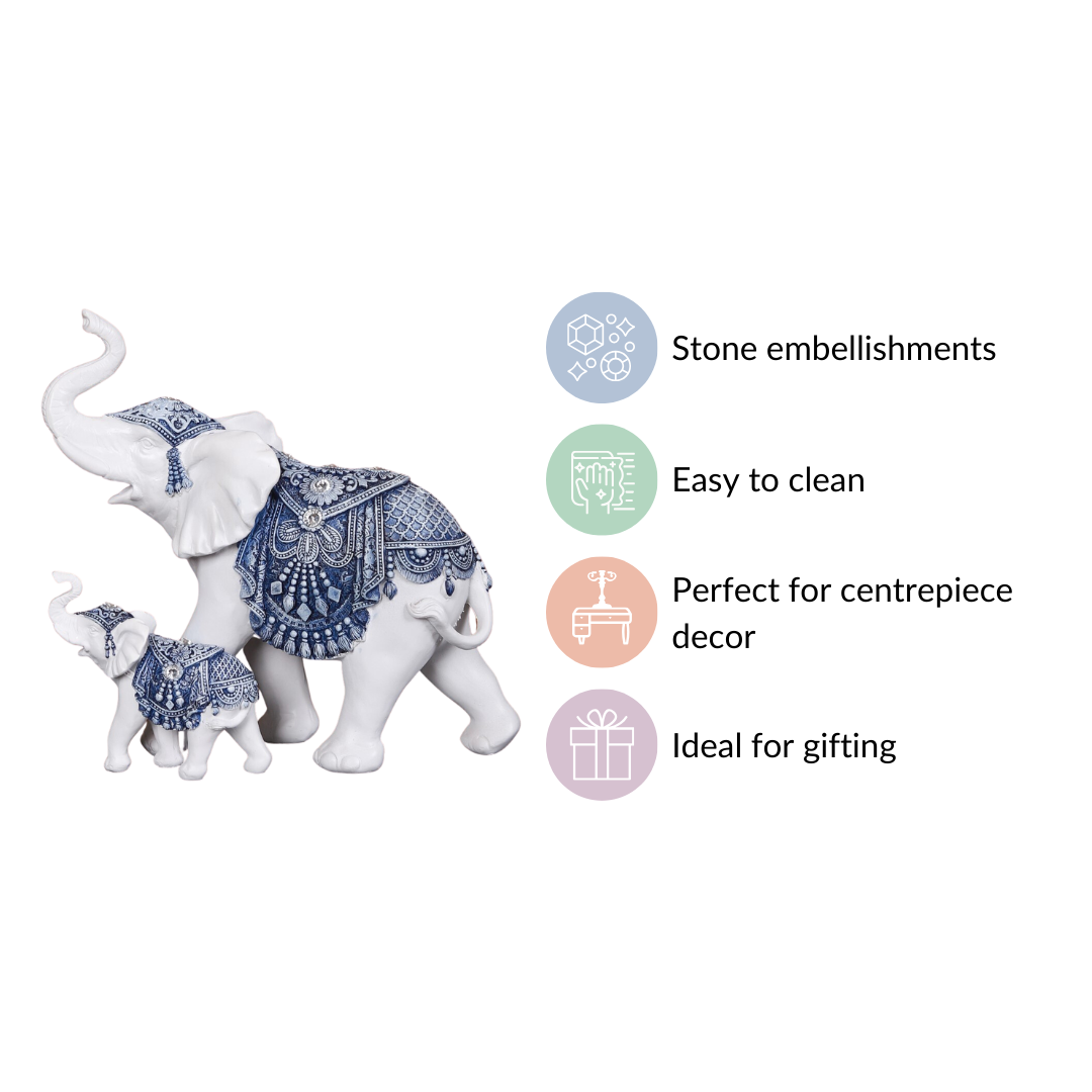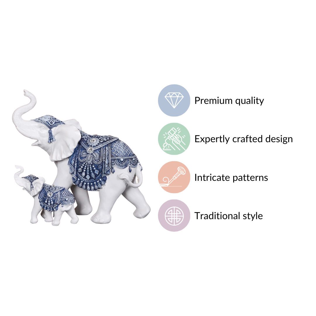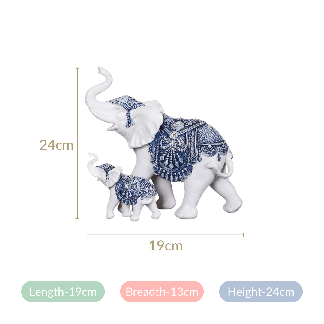 Presenting to you our magnificent Mother & Baby Elephant Family Decor Showpiece, a charming blend of white elegance and delicate blue designs that will adorn your home with unrivalled appeal. Beautifully constructed from high-quality materials, this work of art depicts a touching picture of an adult and baby elephant, their trunks raised in unison. It's an exquisite centrepiece for your home and can even be an excellent present, being a sign of familial unity. Improve the beauty of any space with this elegant decor that can complement many interior decor styles.