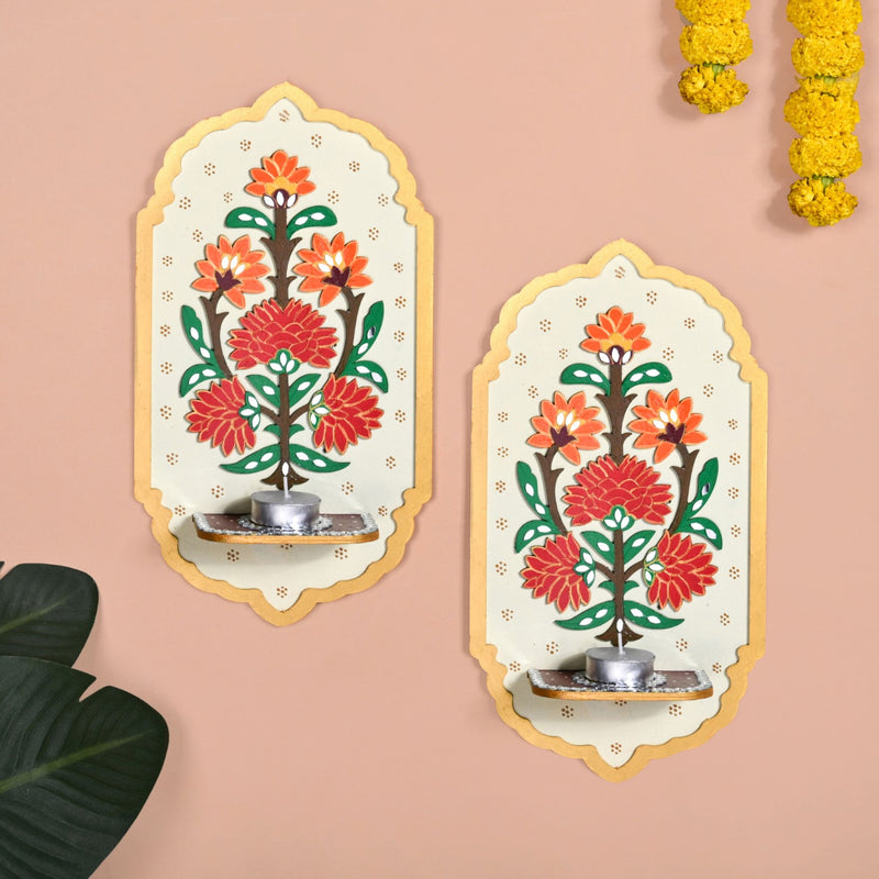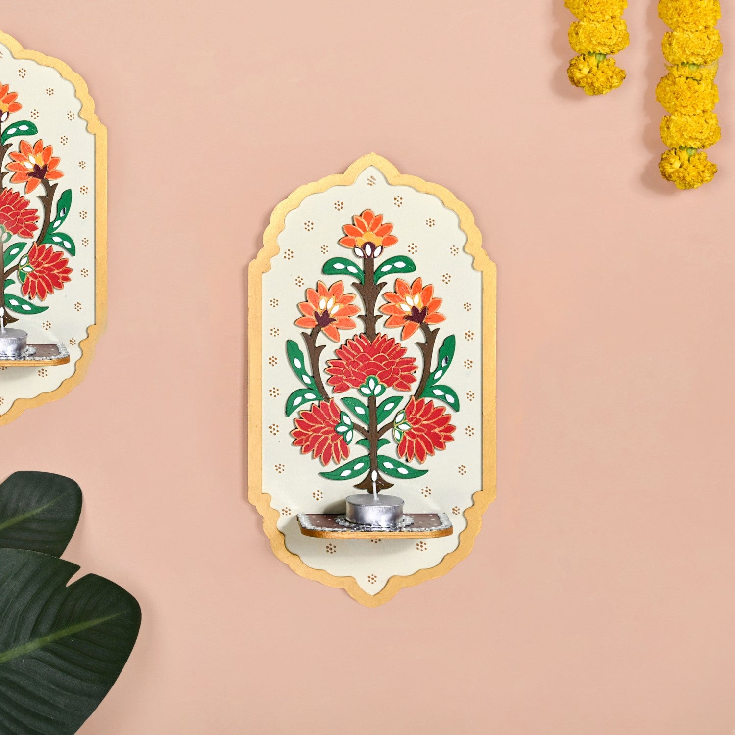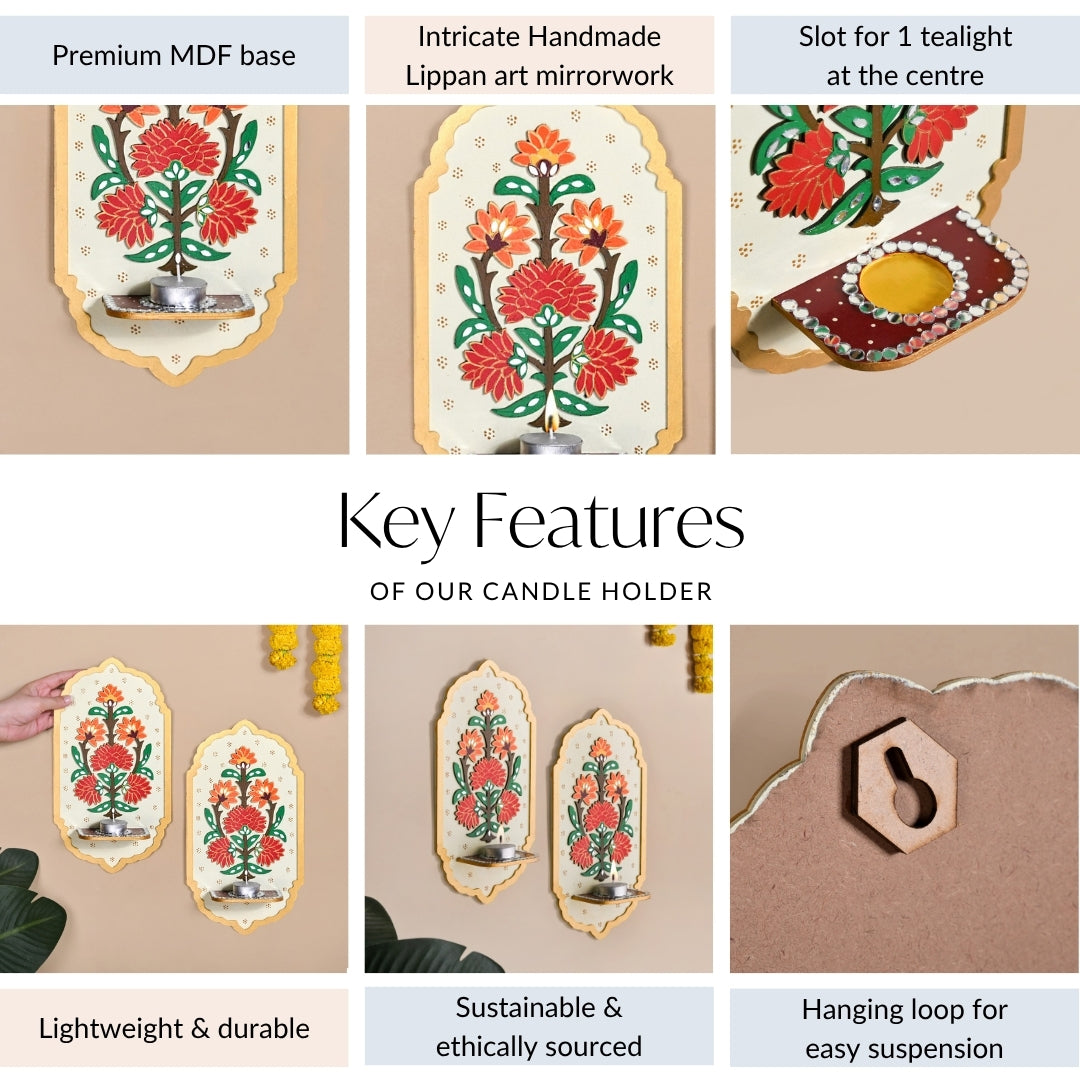 Design: Handcrafted by skilled artisans, the set of 2 brings together utility and tradition with effortless grace. The central slot holds a tealight that reflects softly across the mirror details, creating a warm, inviting glow. The design features layered floral blooms in rich reds, burnt orange, and golden yellow with deep green foliage and shimmering mirror accents. Set against an ivory base and framed by a golden arched border, the candle holder radiates festive charm and intricate detailing, reminiscent of Indian palace frescoes. The tealight also has a hanging hoop at the back for suspension support.