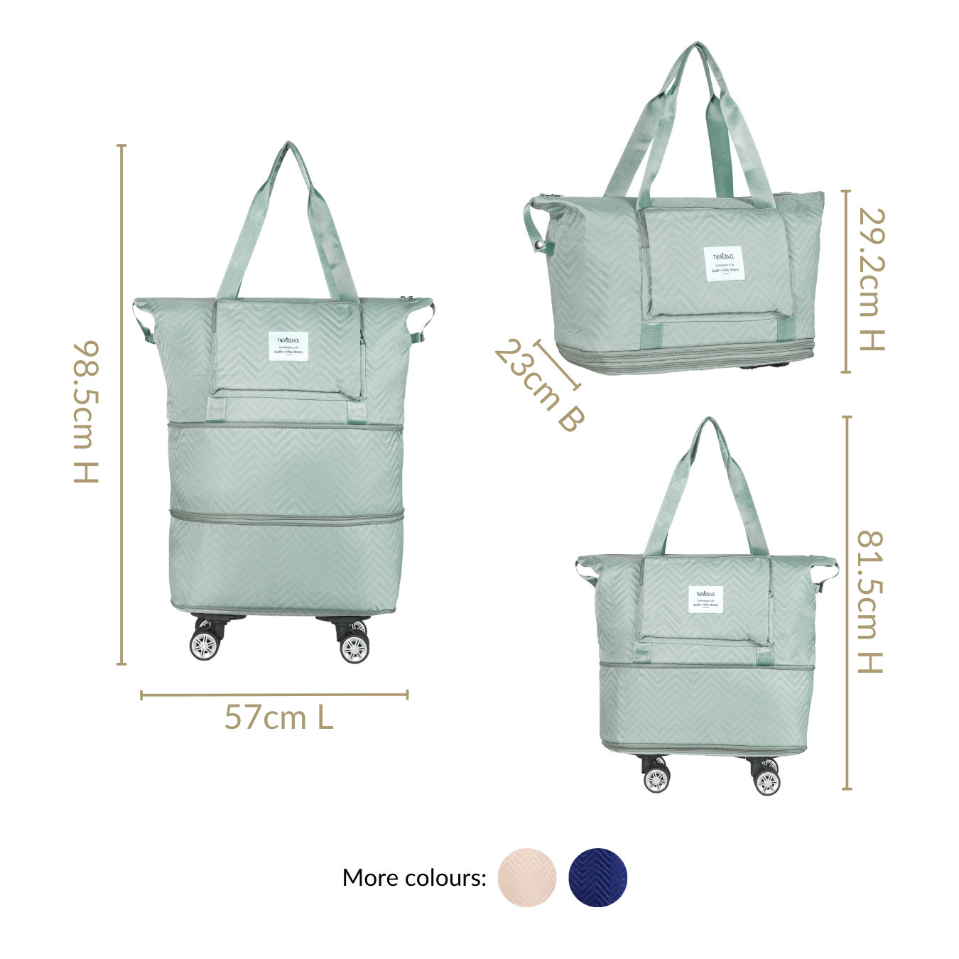 Design: Crafted from high-density nylon, this sleek travel bag features an embossed chevron pattern that adds a touch of texture and style. It’s designed with both functionality and aesthetics in mind, offering smooth silver hardware detailing for a polished look. The interior is lined with water-resistant nylon, ensuring your belongings stay safe and dry at all times. However, the expandable design is what makes this a true transformer bag. It adapts to your needs, offering extra space for those last-minute additions or spontaneous shopping sprees. Perfect for people who can never pack light, it’s ideal for travellers who appreciate practicality without compromising on style. The detachable wheels make navigating busy airports a breeze, while the two handles and convenient exterior snap button loops ensure it’s easy to carry or attach to other luggage. And let’s not forget its versatility; it can be expanded, have wheels added, or be securely placed on top of your suitcase, making it the perfect travel buddy for hoarders and shopaholics.