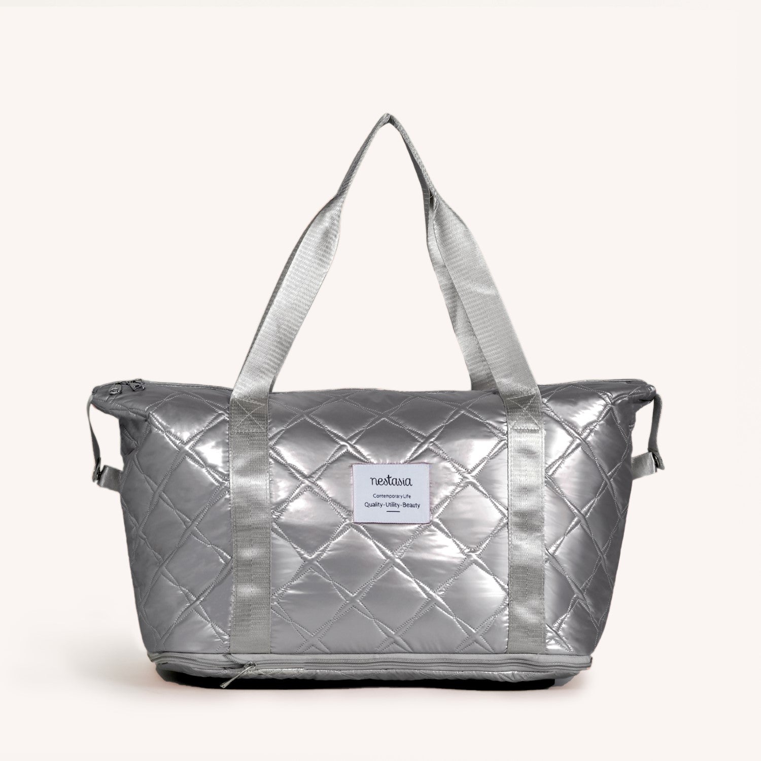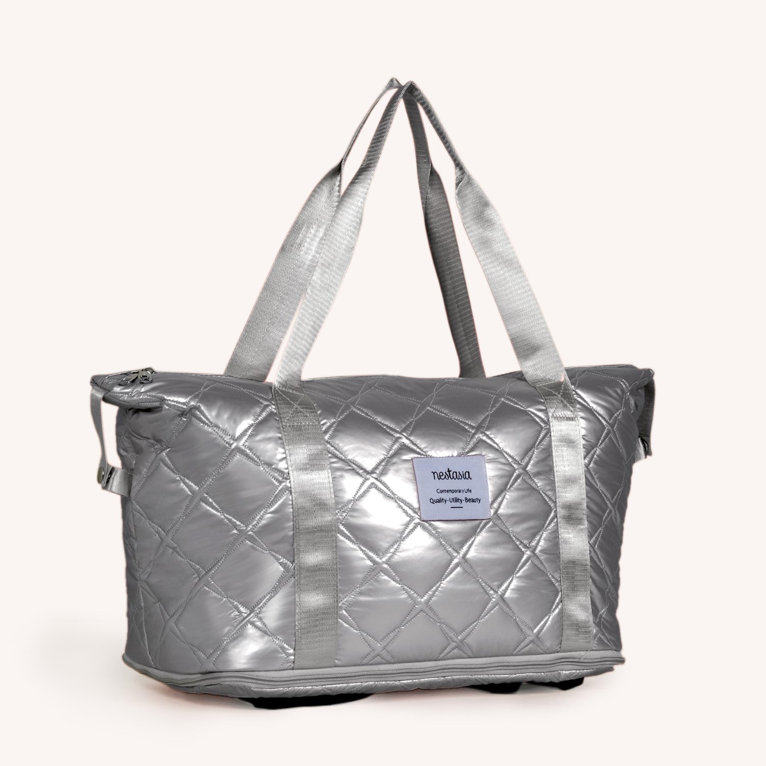 Design: Meticulously crafted with attention to detail, the Movo street-style travel bag is the eye-catching travel essential you need! Featuring a bold, metallic silver hue that gives it a polished, futuristic look and a unique, in-vogue embossed geometric pattern, this strolley bag stands out in any setting. However, this travel bag with wheels is designed to be practical too! With an expandable structure that offers extra room, you can easily pack for longer trips without worrying about space. Multiple smooth zipper systems ensure easy access to your belongings, while the water-resistant nylon lining protects your items from unexpected splashes. The 4 detachable wheels glide effortlessly, making it a breeze to navigate crowded airports or bustling train stations. With a zippered exterior side pocket for quick-access essentials and plenty of interior storage, this travel bag has everything you need for an organised, stress-free journey.