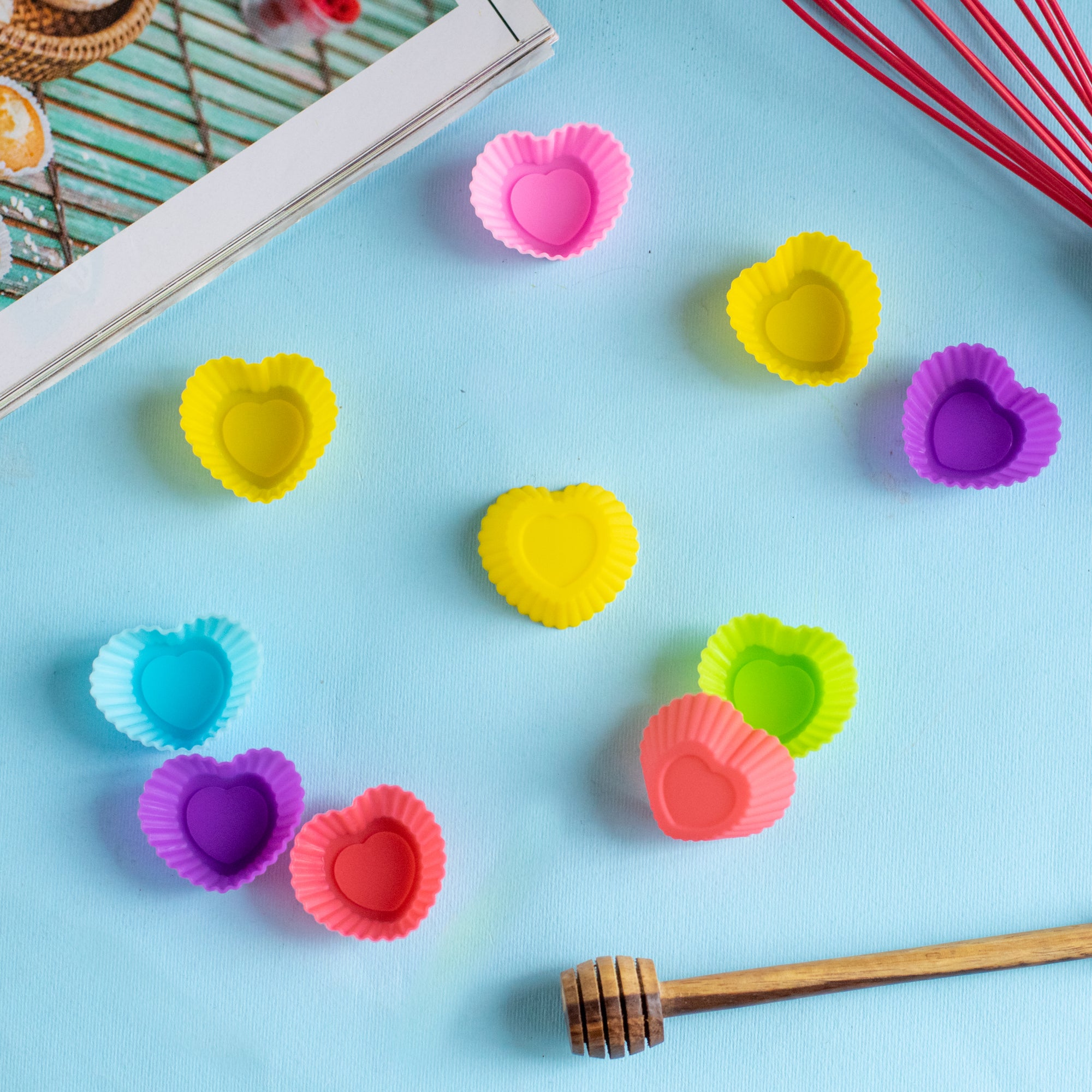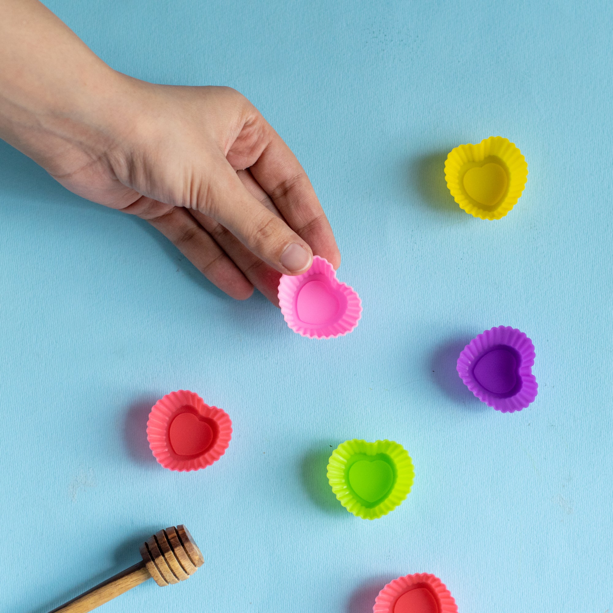 Individual heart shape moulds in pink, yellow, blue, green and purple for making the perfect heart shape cupcakes, candies, and chocolates. One can also also experiment with making heart shape macarons or cream filled creme brulee in these moulds, which are both heat and cold resistant. The moulds are durable and of flexible material which makes it very easy to pop out the baked or frozen product without any hassle.