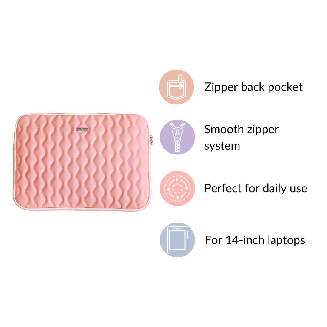 Carry your laptop in style with our very chic laptop sleeve in pink. Made from sustainable vegan leather material, this sleeve will keep your laptop warm and dry. The soft lining keeps it scratch-free. Spacious and sturdy, the sleeve fits a laptop with a 14-inch screen size. The two strong zipper enclosures of the laptop sleeve make it easy to carry around without the fear of dropping your device. This modern and aesthetically pleasing laptop sleeve is ideal for everyday use for the one who loves to be on the go.