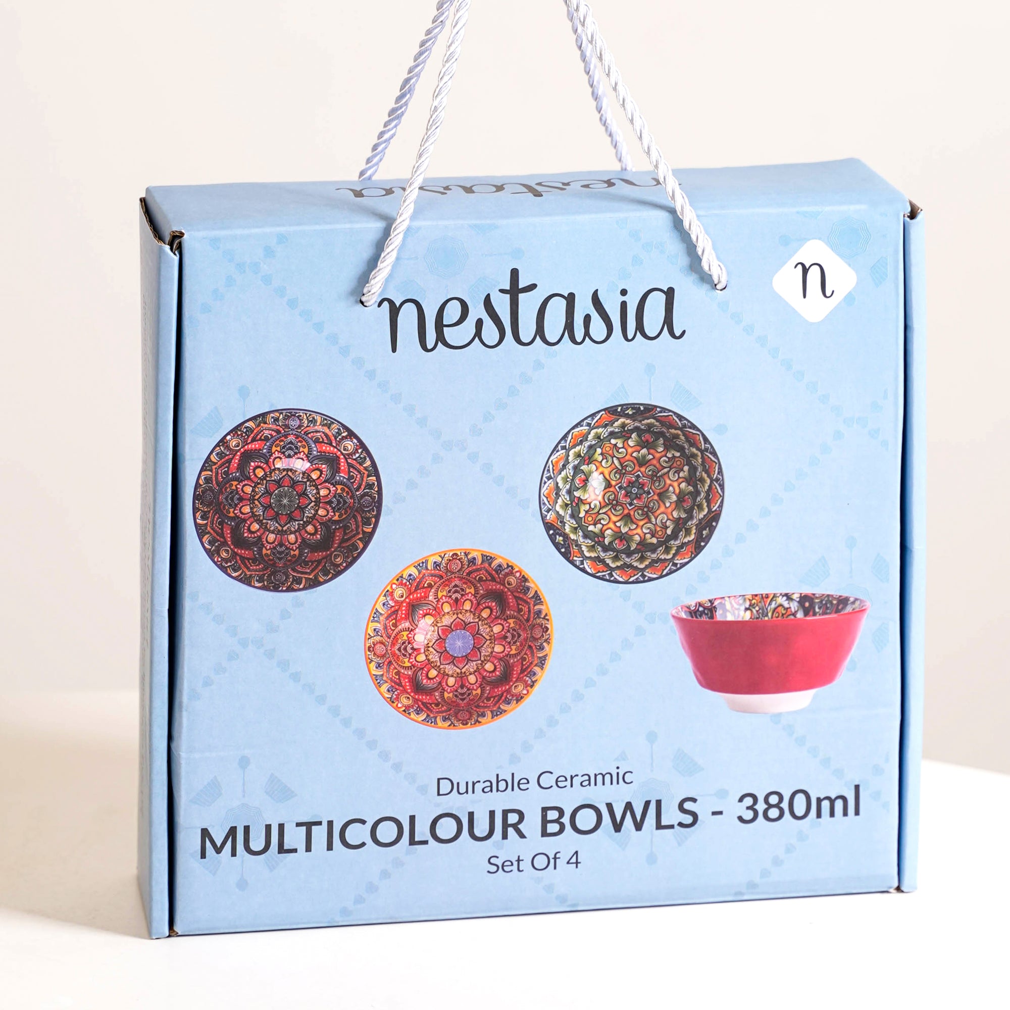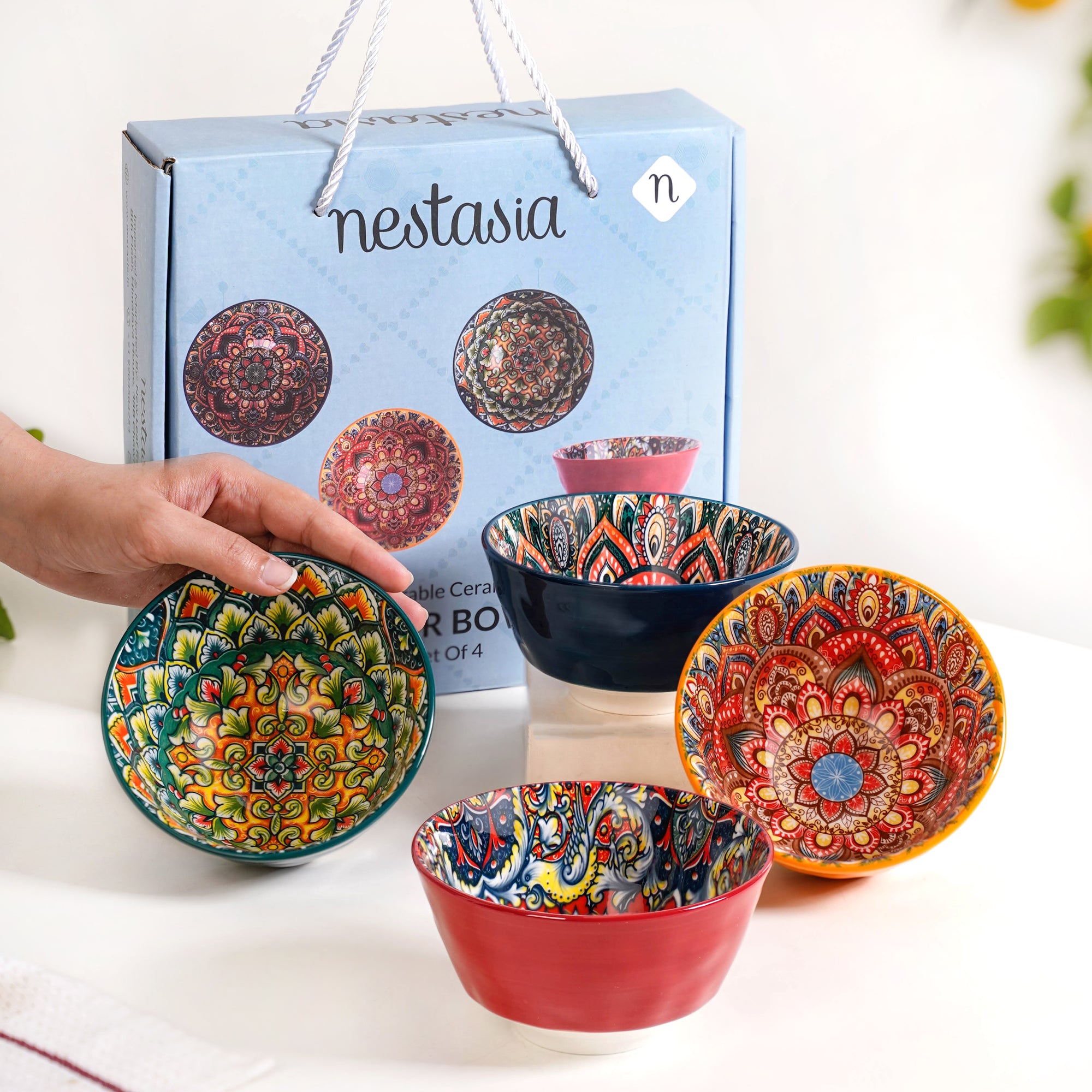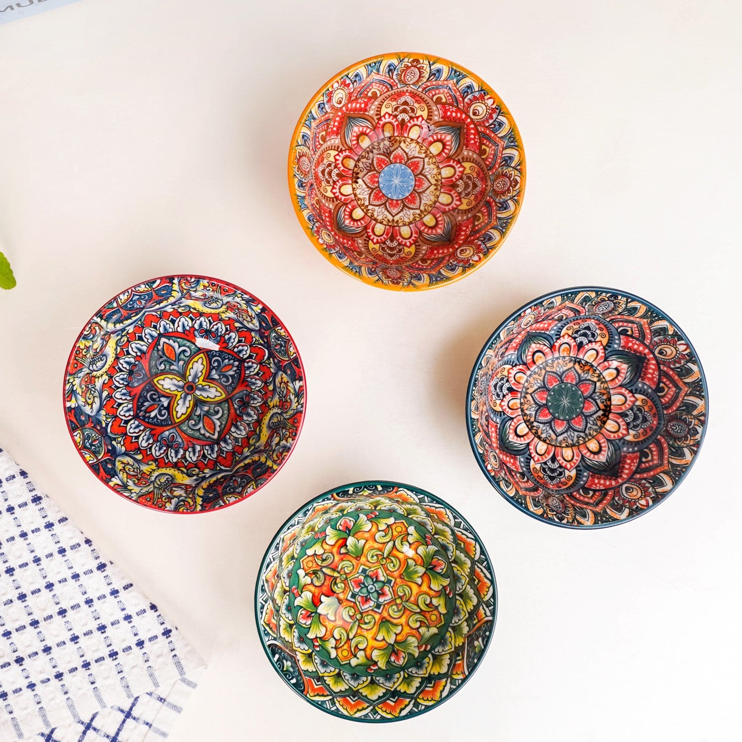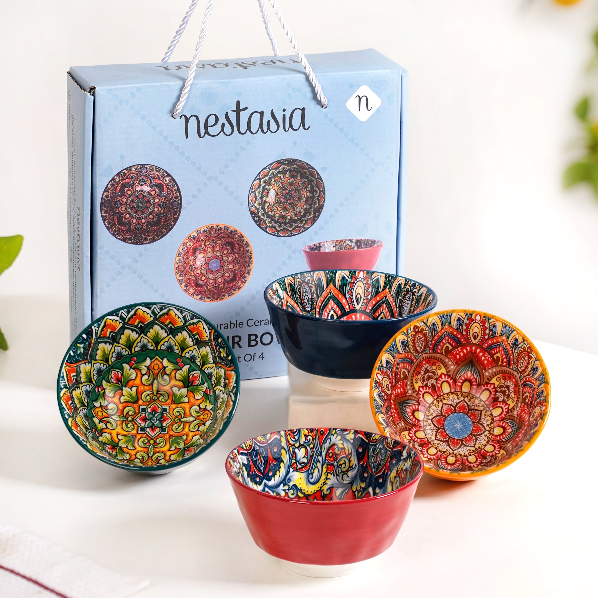 The mandala-inspired floral designs are high-quality printed motifs finished with a food-safe glossy glaze to ensure long-lasting vibrancy.