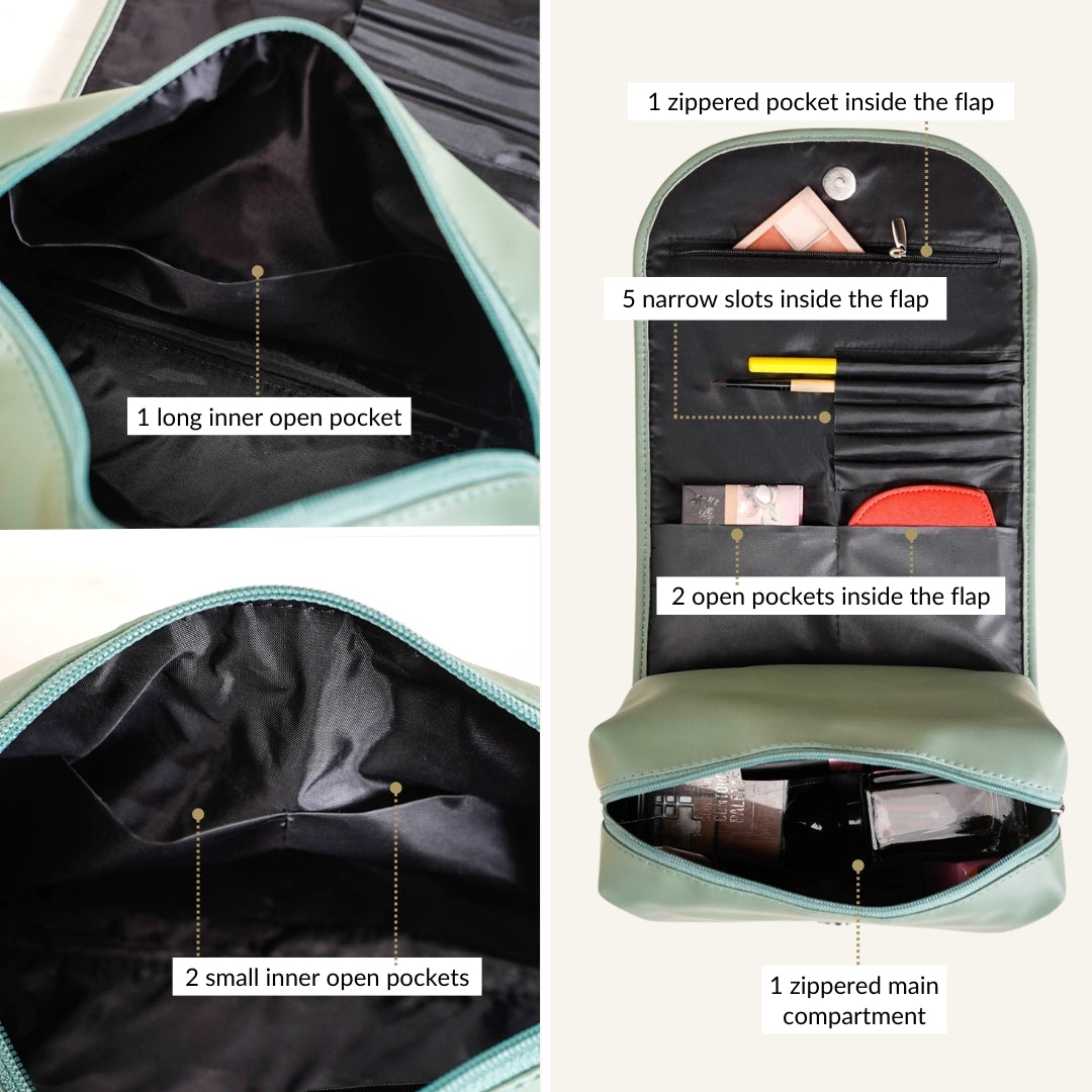 Design: With a sophisticated mint green hue, the pouch features a structured roll-top flap secured by a magnetic button for added convenience. Its stitched, cushiony exterior gives it a plush look, while smooth zipper enclosures ensure seamless access. Inside, multiple compartments - including a zippered pocket, open pockets, and narrow slots - offer dedicated spaces for brushes, lipsticks, and other beauty essentials.