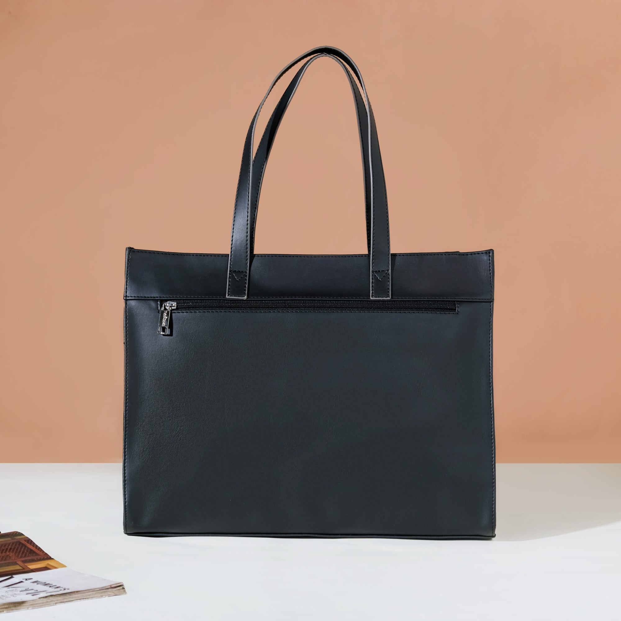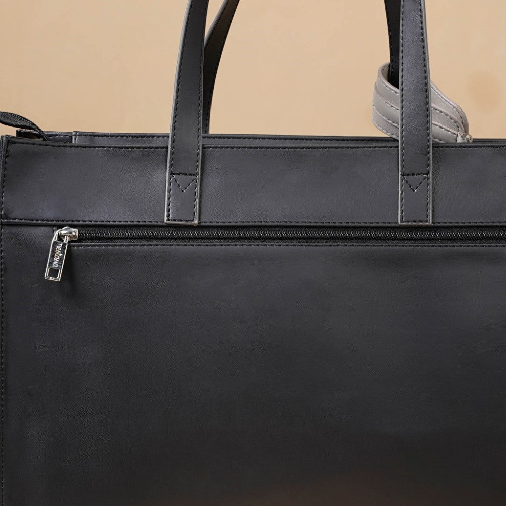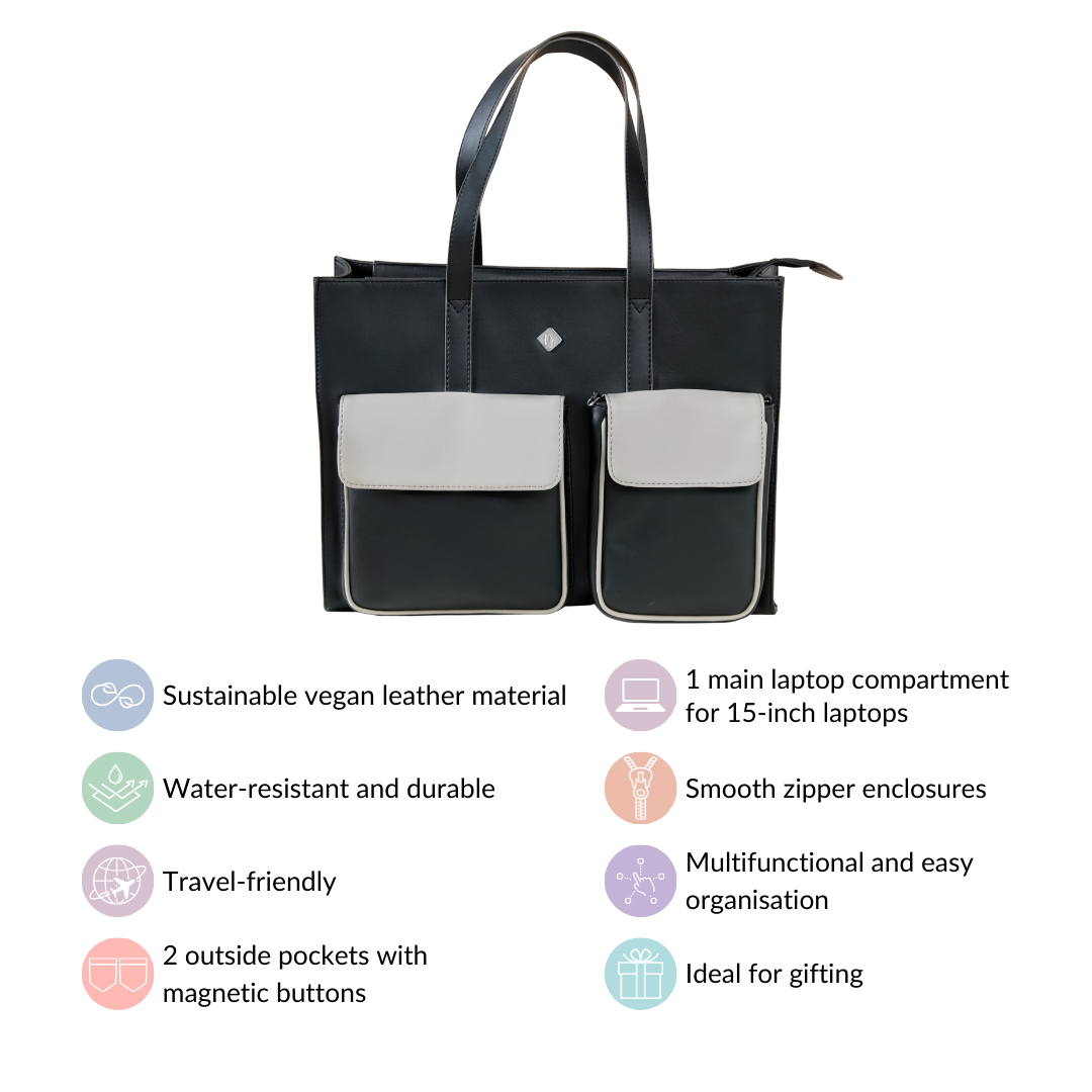 The black and grey tote bag is a stylish and sustainable choice for the modern individual. Crafted from high-quality vegan leather, this bag combines fashion with eco-consciousness. With its water-resistant and durable design, it's perfect for all your daily adventures. The tote features a spacious main compartment tailored to fit 15-inch laptops, alongside two exterior pockets secured with magnetic buttons. Inside, discover an inner zippered pocket for smaller essentials. Additionally, the bag includes a removable external sling pouch with a detachable chain strap and a convenient keychain holder on the sling flap. Its smooth zipper enclosures make it travel-friendly and an excellent gift option for your loved ones. Stay organized, stylish, and eco-friendly with this versatile tote.