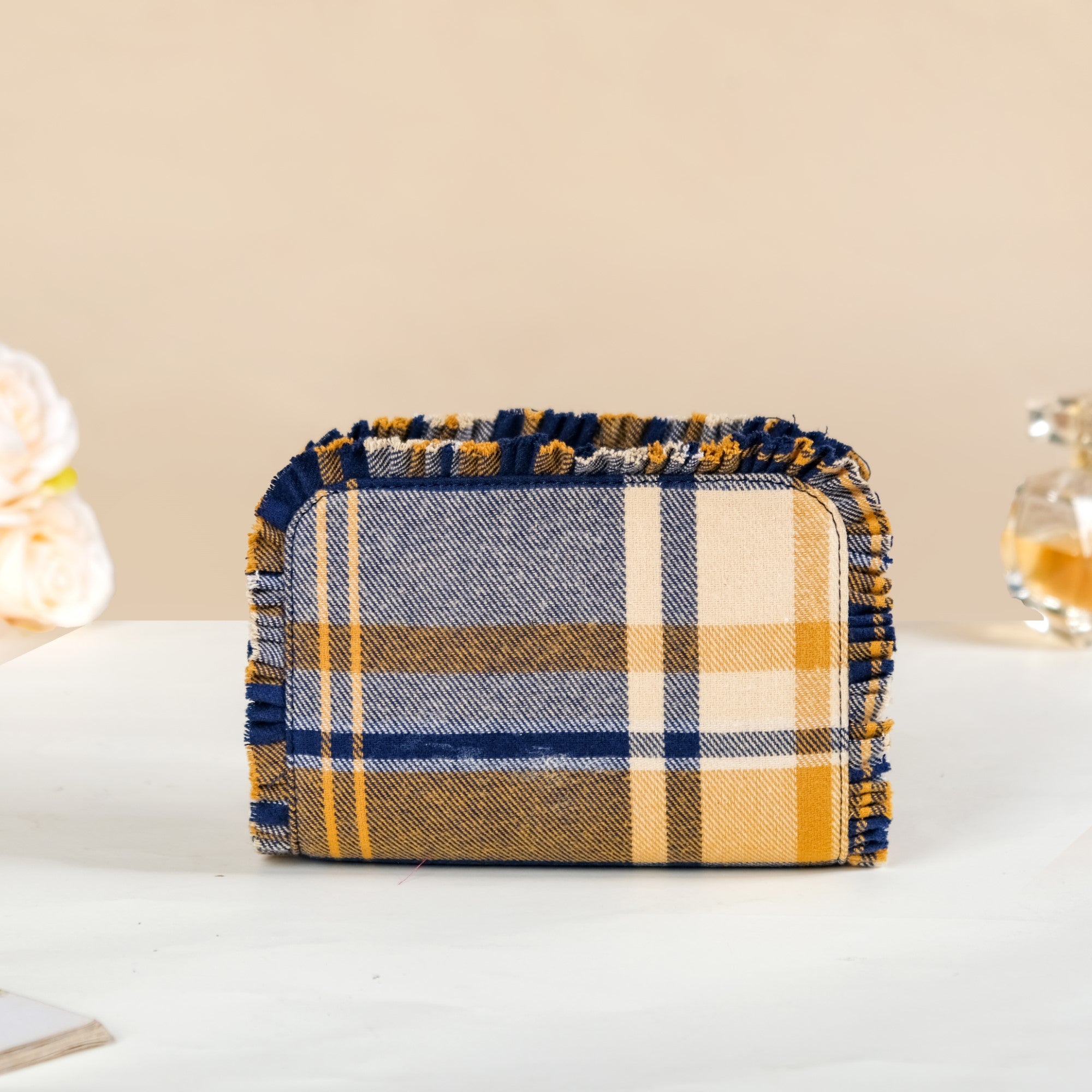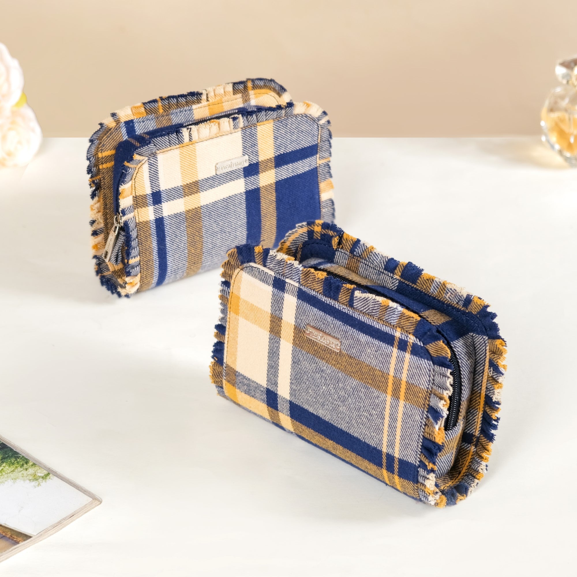 Immerse yourself in a realm of practical elegance with our pair of skillfully fashioned makeup bags, crafted from superior cotton material. The exterior showcases chic checkered patterns and charming frills, adding an enchanting touch that enhances the overall aesthetic appeal. The main compartment, shielded by a water-resistant polyester lining, ensures the secure storage of your beauty essentials, while the additional inner pocket provides a convenient space for trinkets, earrings, and more. This versatile and lightweight makeup organizer set is designed for your on-the-go lifestyle, effortlessly accommodating makeup, toiletries, and more.