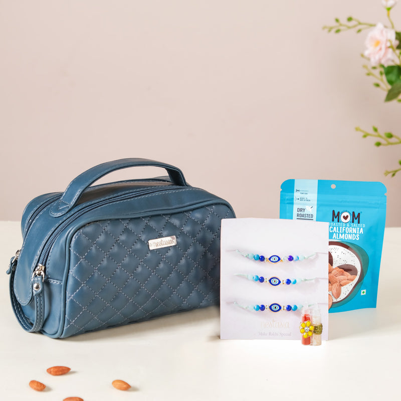 Celebrate the sacred bond of love and siblinghood with our exquisite Rakhi Hamper, designed to add a touch of elegance and joy to your festivities. Embrace the essence of style and functionality with the vegan leather quilted makeup pouch, a perfect accessory for keeping essentials in place.