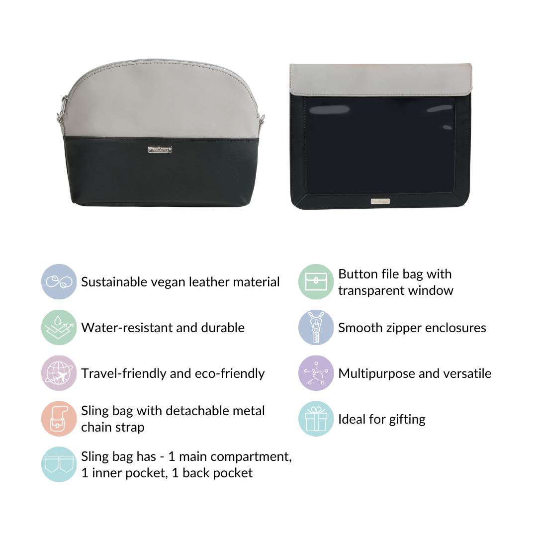 Our sling bag and transparent file cover set can seamlessly transition from casual to formal settings. The sleek design, coupled with the premium vegan leather, imparts an elegant touch suitable for business meetings, conferences, or formal events. Its versatile aesthetic complements various outfits, making it a sophisticated choice for any occasion.