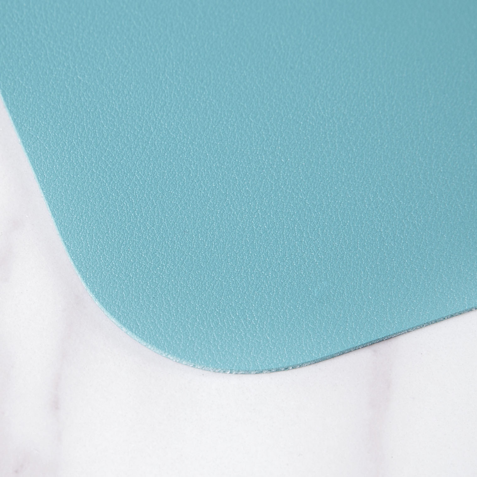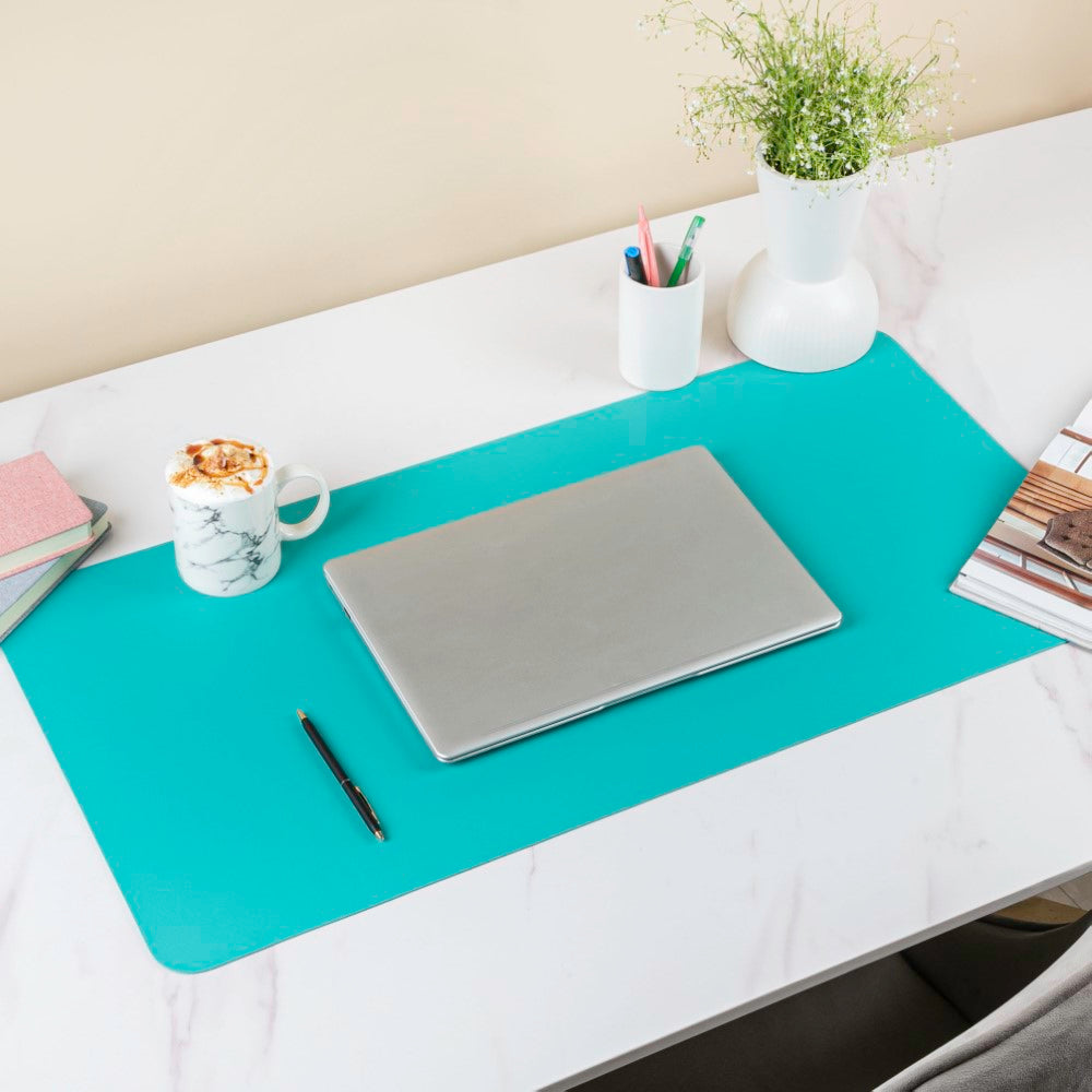 The cyan-toned tabletop mat can comfortably accommodate a laptop or desktop computer, a mouse, and stationery in one spot. The desk mat enables quick mouse movement and provides a pop of colour to the table. The desk mat or table mat may be used as a decorative mat on the dining table to protect the table from heat, scratches, and spills while eating.