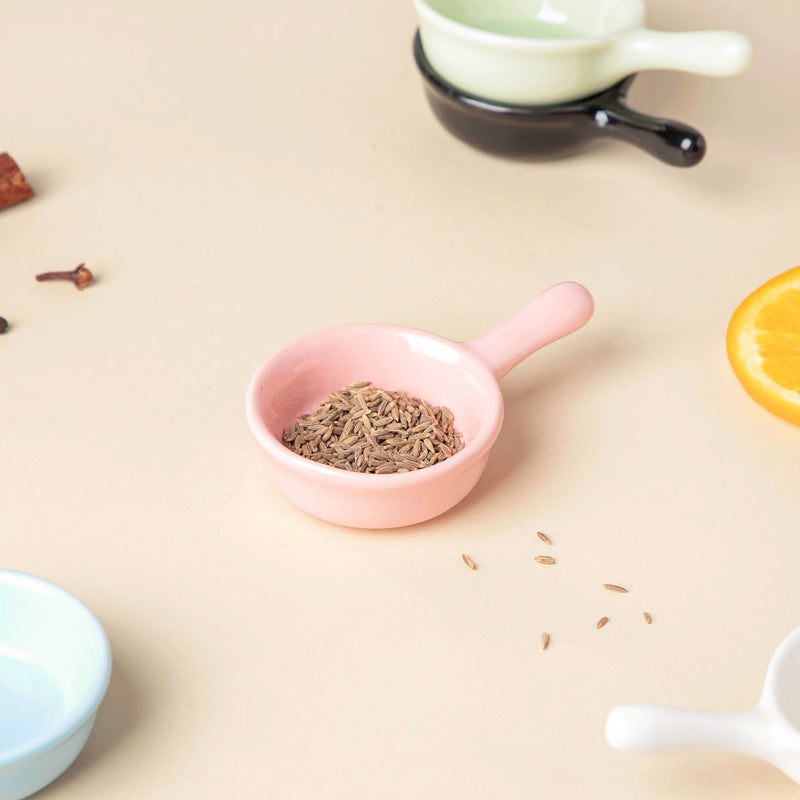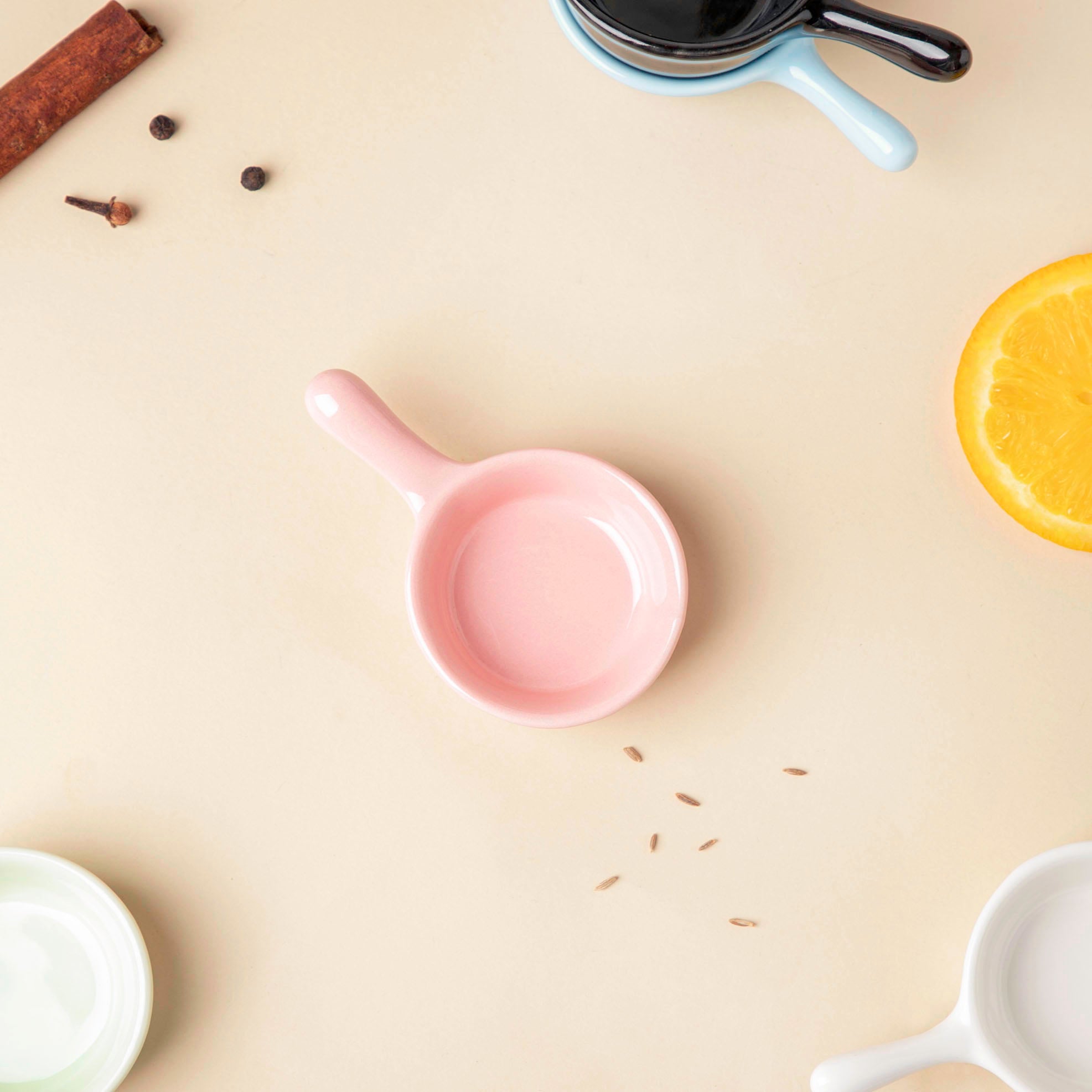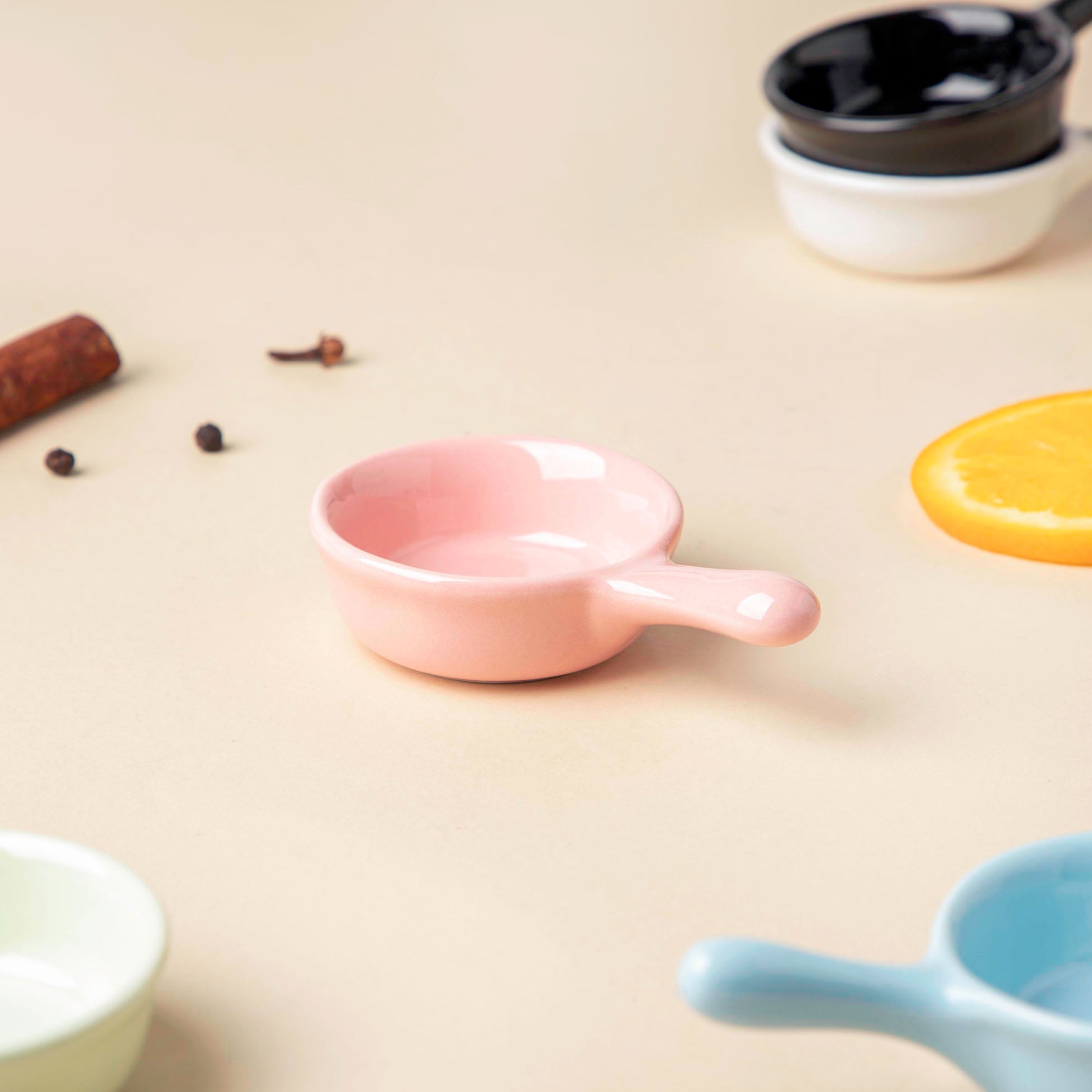 The ceramic dip bowl with handle is a snack-time essential to pair the perfect dip with delicious snacks. The handle provides a stylish look to the bowl and also enables one to carry the dish easily. Use the pink ceramic dip bowl to put ketchup, mayo, salsa, or honey mustard sauce and pair them up with finger foods. Nestip: Pair the dip bowl with other pastel-colored snack plates for a colorful table setup. Size: 10cm L x 4cm D x 2cm H Length with handle - 10cm L Capacity: 30ml Color: Pink Material: Ceramic Products included: 1 bowl with handle Style: CZS58C75