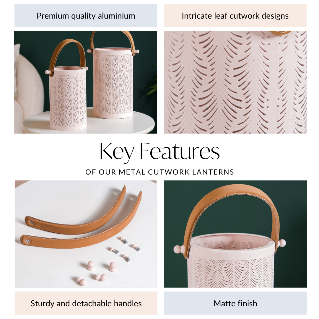 Absolutely! Our metal lanterns showcase excellent craftsmanship and practicality. The set of two lanterns comes in a lovely muted pink colour and features intricate leaf cutwork. It makes for a thoughtful gift that will illuminate the recipient's home with a captivating play of light and shadow.