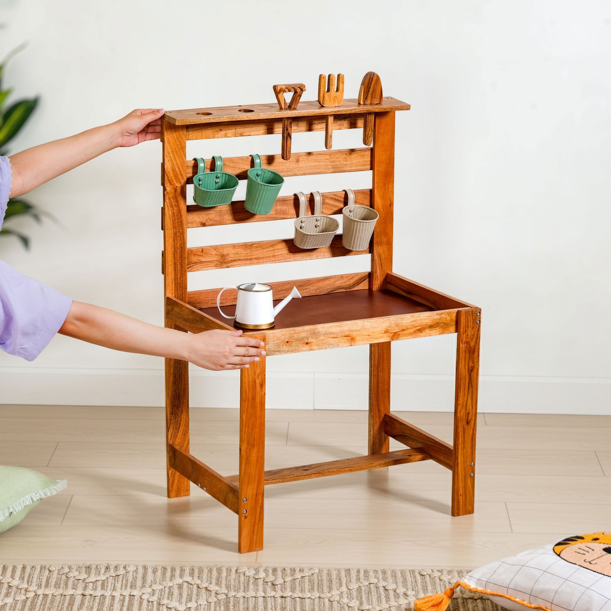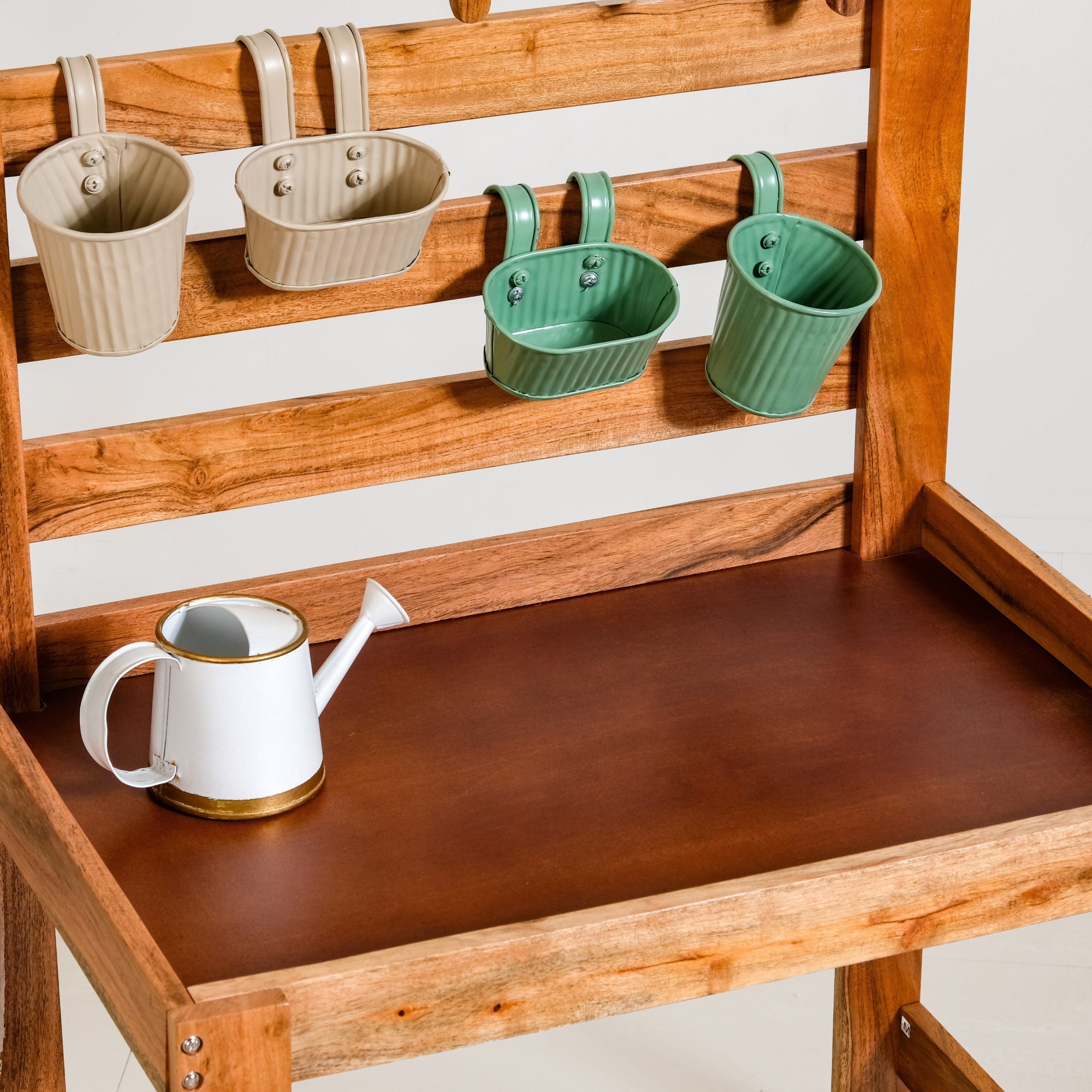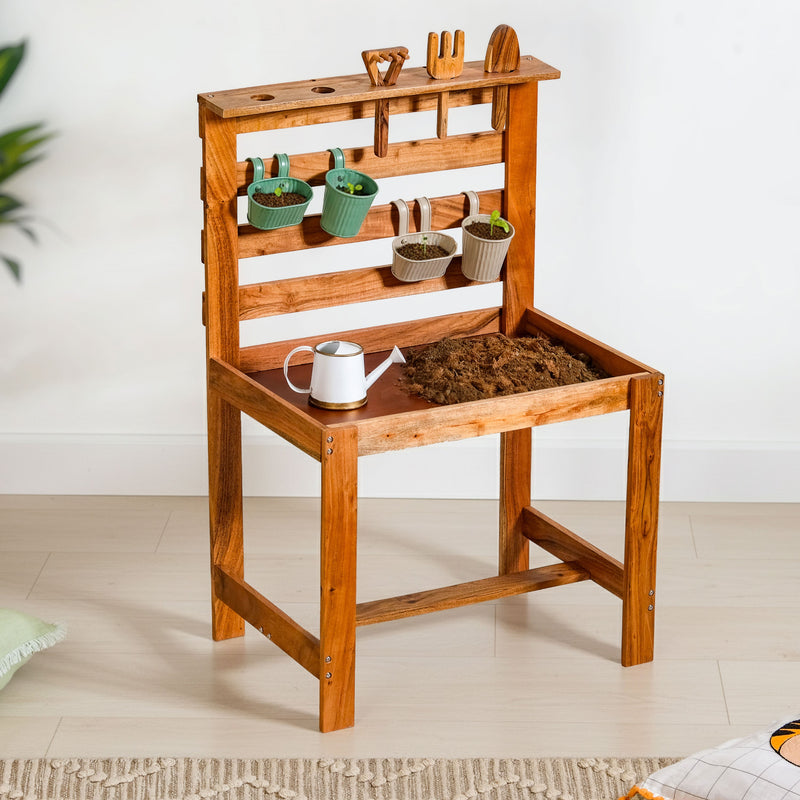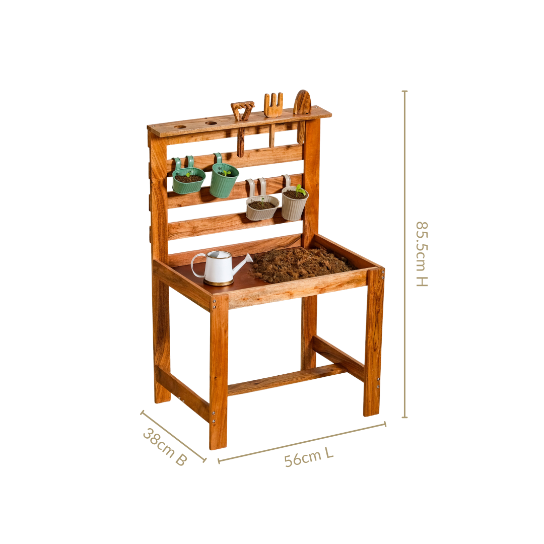 Design: The play set features a sturdy wooden gardening stand with a waterproof base, neatly holding planters, tools and accessories. Thoughtfully sized for children, it includes metal planters, a watering can, wooden tools and a soft waterproof and stain-resistant apron in cheerful, earthy colours.