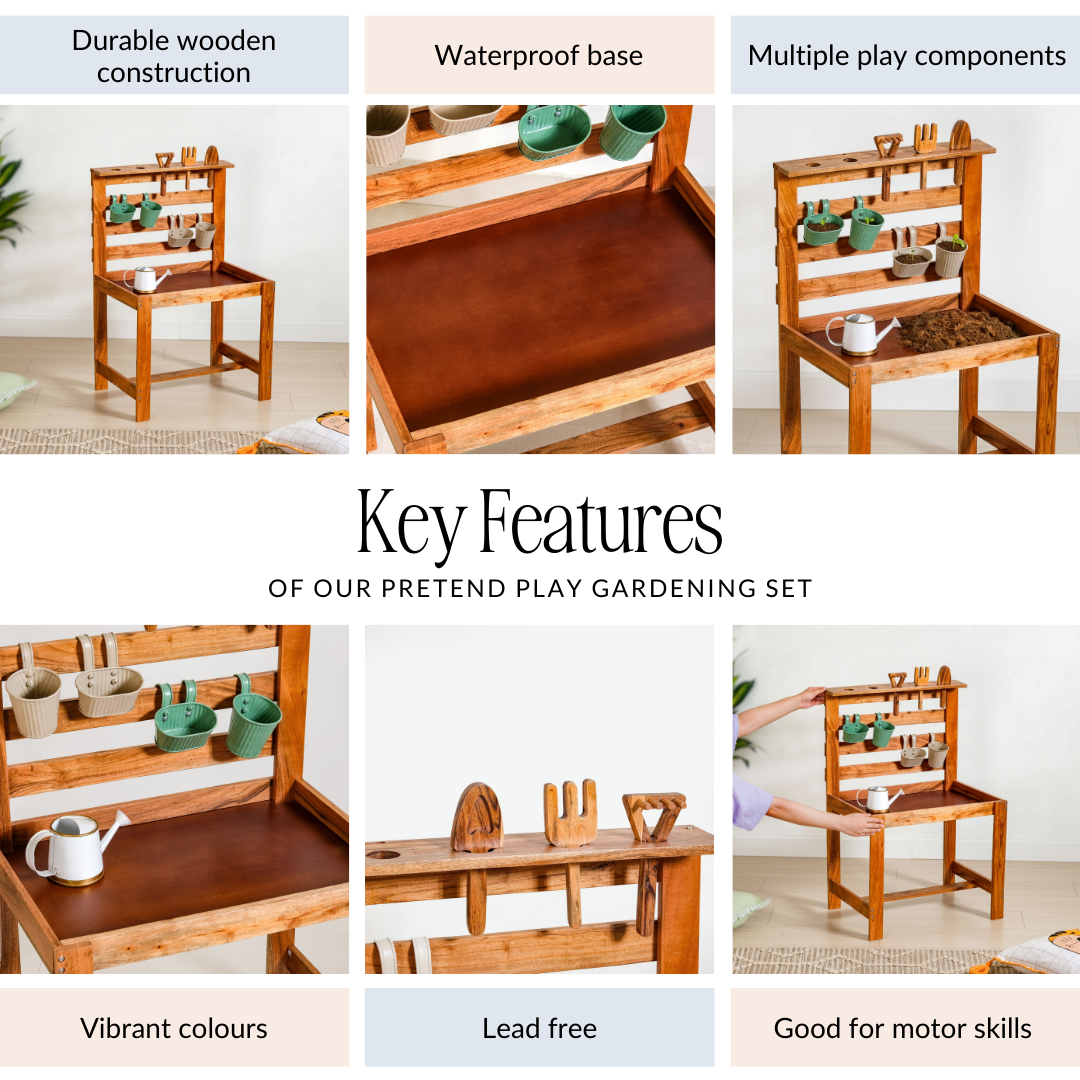 Benefits: Made with durable wood and lead-free, non-toxic materials, this pretend play set is safe for kids and built to last. The multiple components encourage motor skill development, coordination and imaginative play while introducing basic gardening concepts.