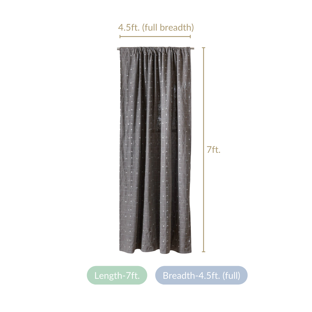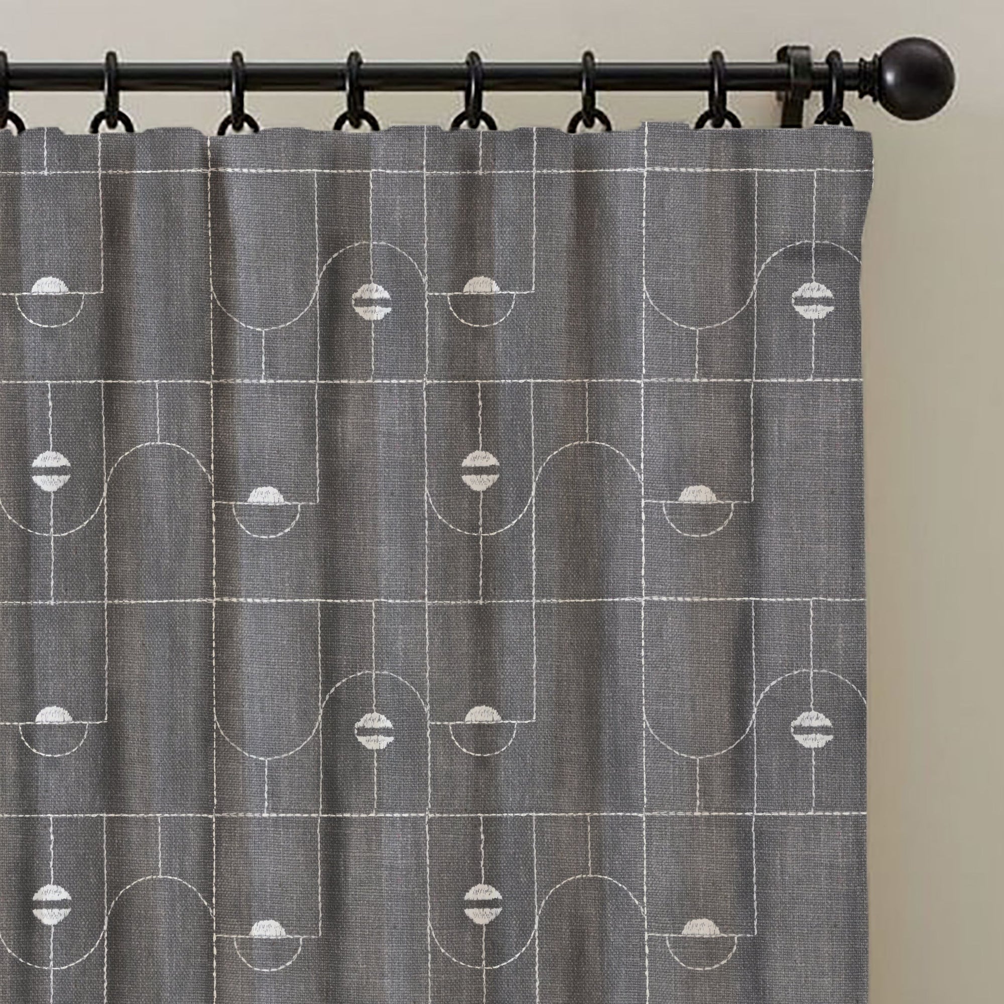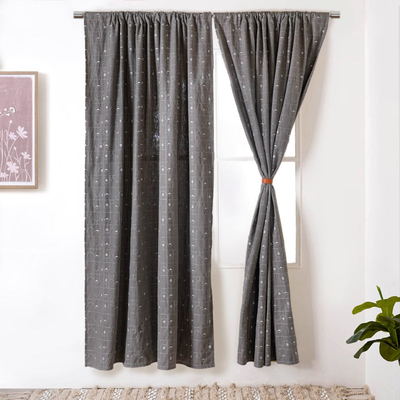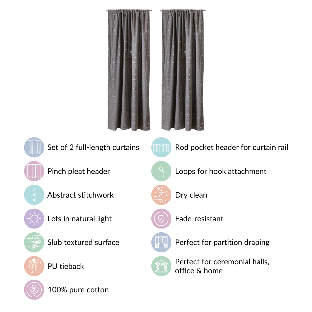 The unique blend of grey colour, abstract stitchwork, and textured surface exudes a modern elegance that can perfectly accentuate any contemporary interior. Whether used in an office environment, a banquet hall, or at home, the pure cotton curtain instantly lends a dynamic look to the space.