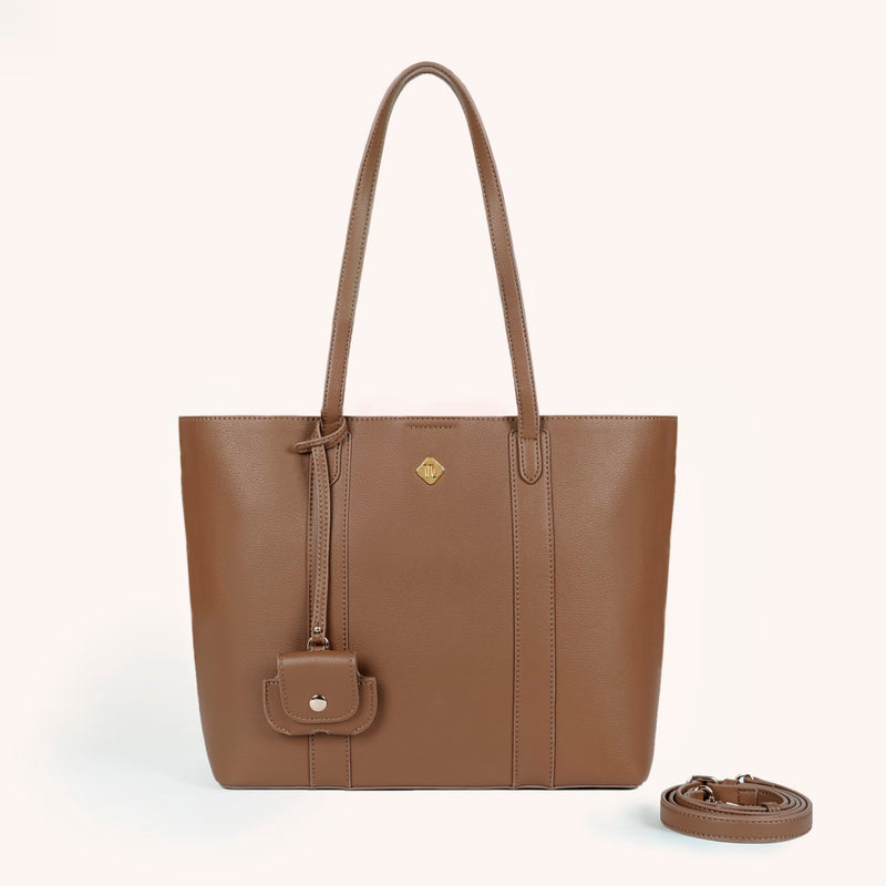 Design: Made from high-quality PU leather, the Nara tote bag's sleek design and rich, earthy brown colour exude timeless elegance. This shoulder bag isn't your ordinary tote bag. Featuring a spacious main compartment secure with a button closure, you'll find a detachable water-resistant pouch on the inside. This allows the bag to turn into a versatile shopper bag when needed, providing ample room. Furthermore, the pouch includes a side pocket and an additional zippered pocket for extra security, keeping you organized and your belongings protected. A practical key holder ensures you keep your keys in check, while the two sturdy over-the-shoulder handles and adjustable, detachable sling strap offer flexible carrying options.