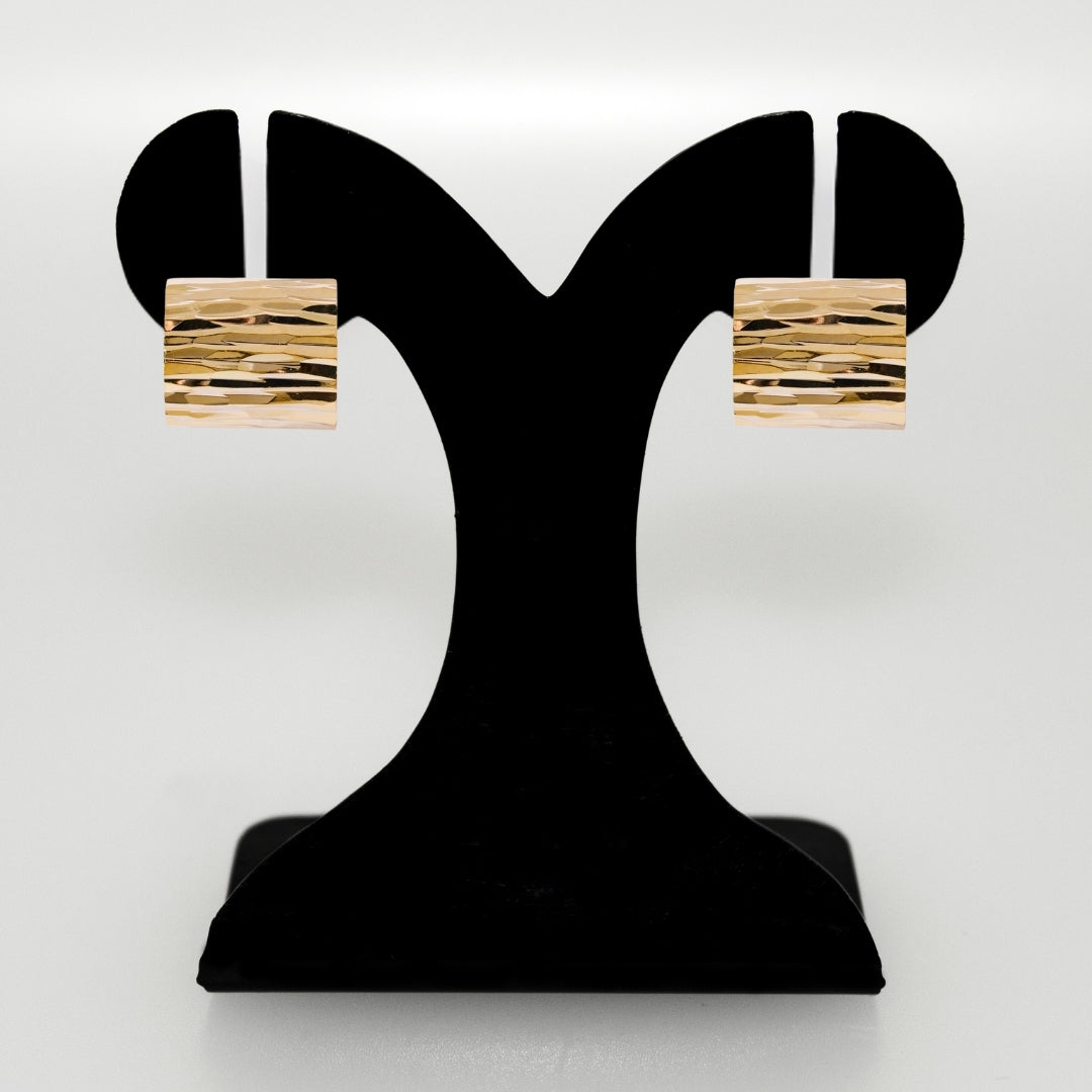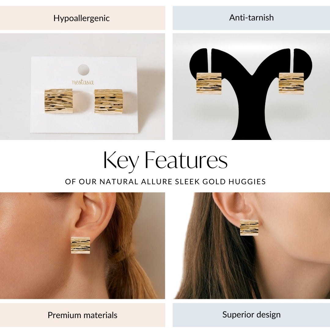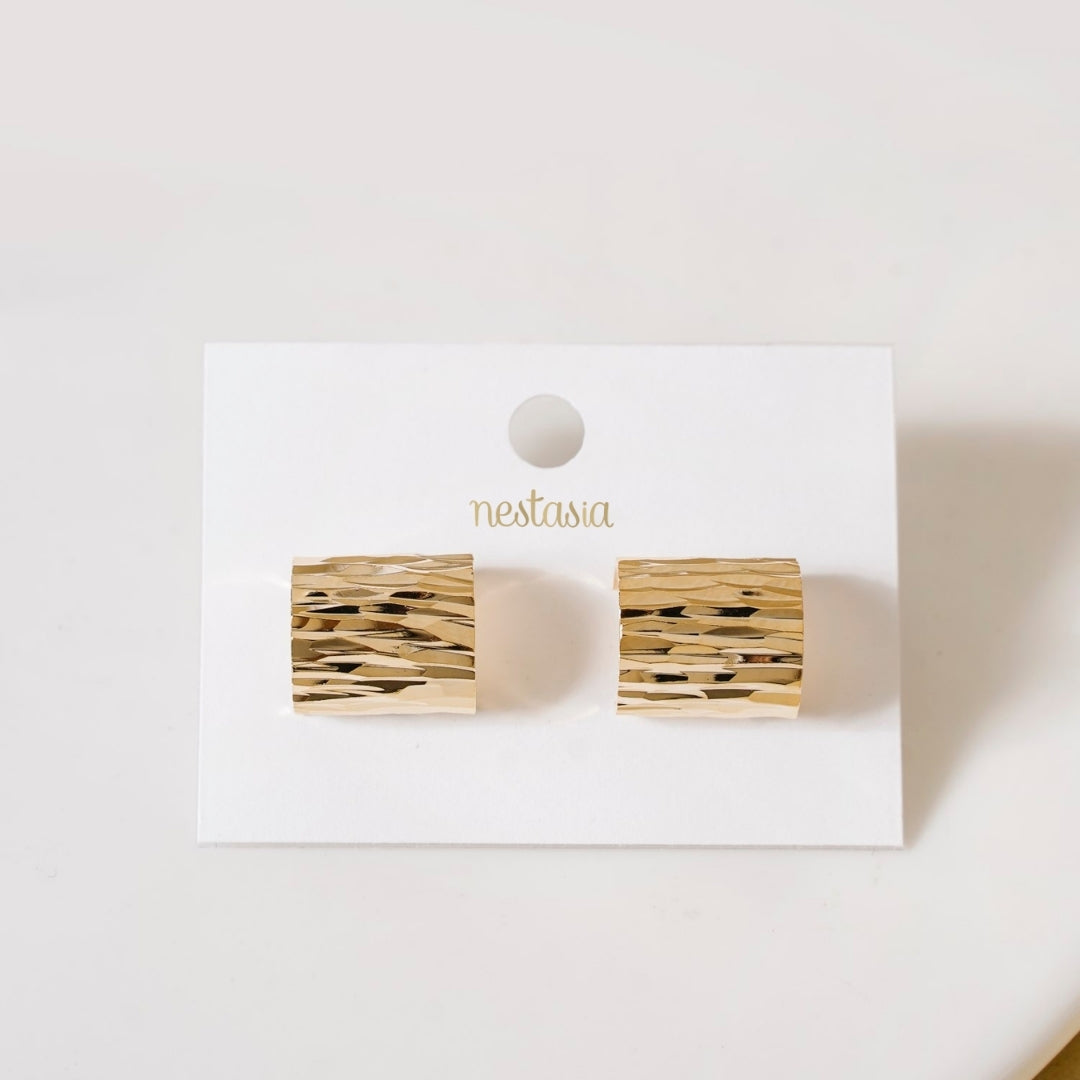 Nature’s artistry meets modern elegance in this pair of gold-toned huggie earrings. These earrings boast a textured design reminiscent of the intricate patterns found on wooden log bark, lending a rustic yet refined charm. Drawing inspiration from the organic beauty of forest landscapes, these earrings celebrate the harmony of natural elements and contemporary style. Lightweight and versatile, they’re perfect for casual outings or special occasions, offering a comfortable fit and a timeless aesthetic that complements any outfit.