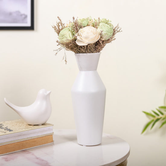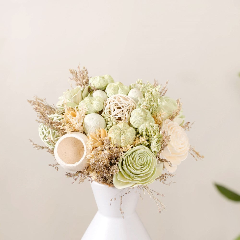 Infuse your space with tranquillity and sophistication with our ethereal dried flower bouquet. Delicately curated with a mesmerizing blend of pastel mint green and light beige tones, this enchanting flower arrangement features a harmonious composition of dried bell cups, star grass, sola flowers, lata vine balls, and charming dried flower pods. Bound together thoughtfully with rustic jute, this handcrafted bouquet creates a graceful display that radiates the allure of nature. With its fragrance-free, eco-friendly attributes and versatile charm, this naturally dried flower bouquet becomes a timeless adornment to your home decor.