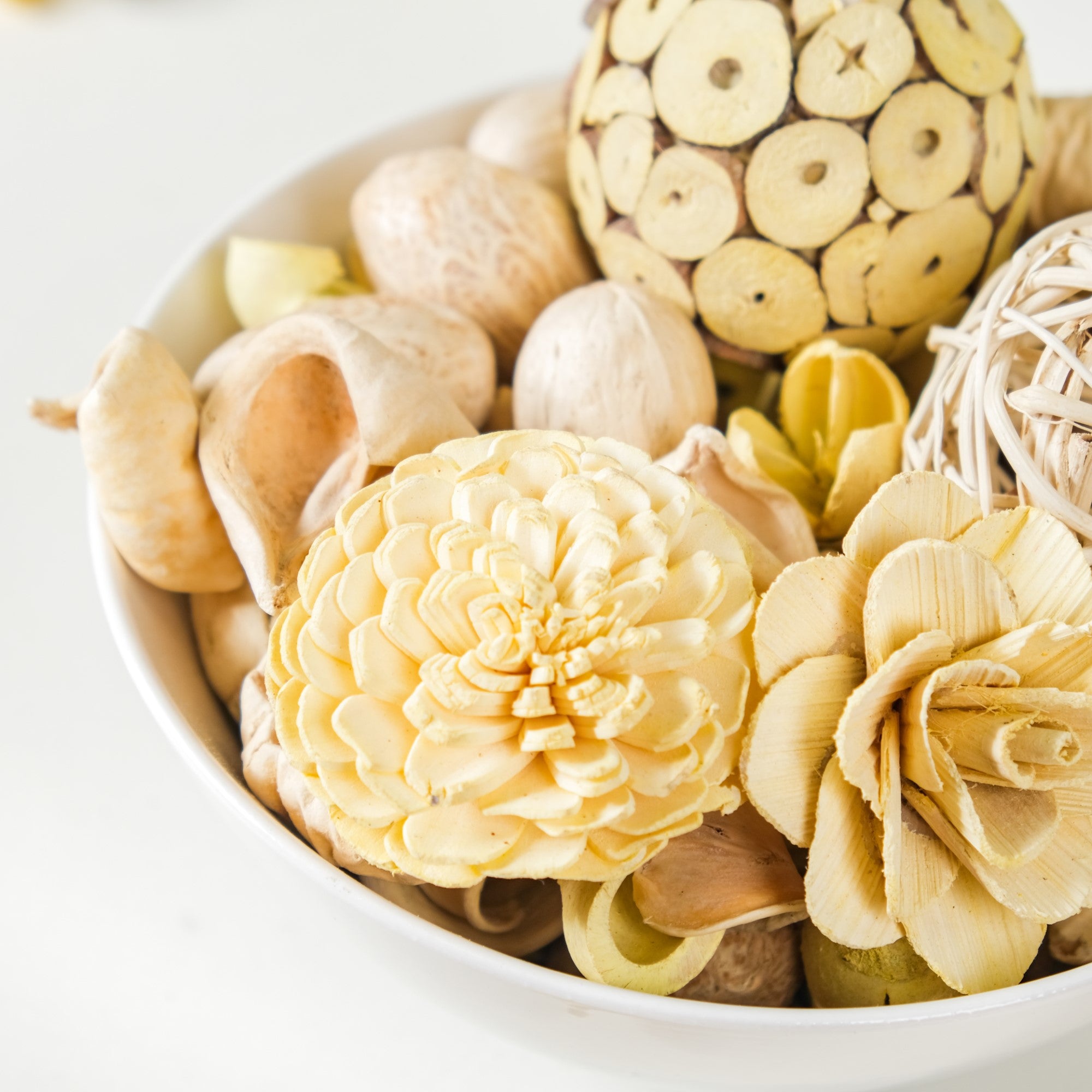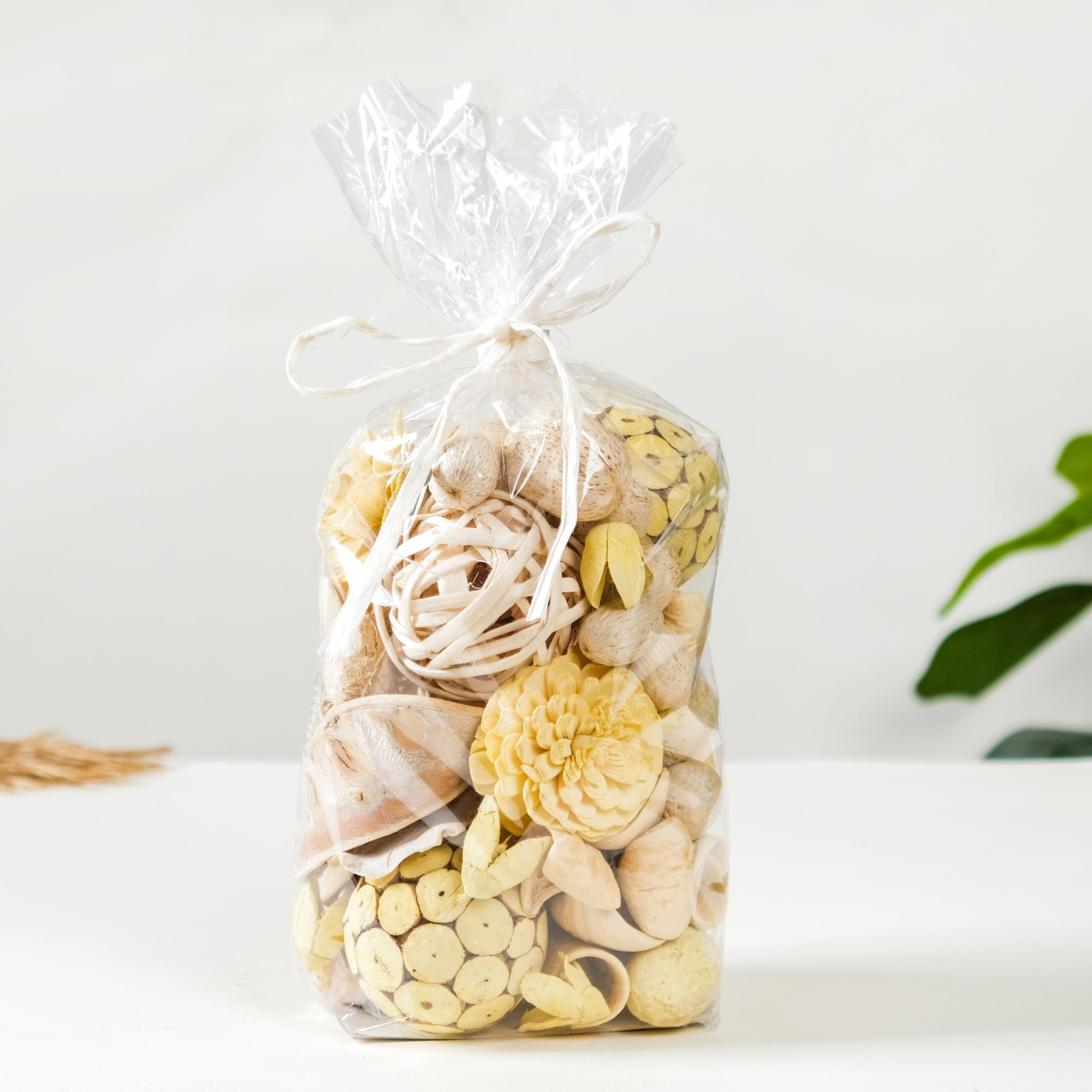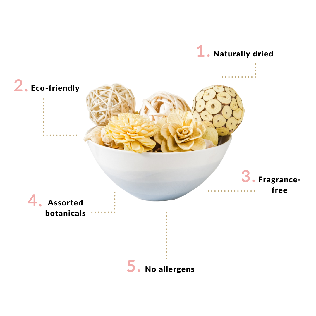 Embrace nature's splendour with the delightful potpourri pack, a captivating fusion of handcrafted and naturally dried elements in serene hues of subtle yellow and beige. The dried flower potpourri includes the enchanting beauty of nature with a delicate blend of dried flowers, pods, and charming sola balls, meticulously curated to create a harmonious and calming atmosphere in any space. Unlike traditional potpourri, this fragrance-free assortment focuses on the visual allure, allowing you to appreciate nature's simplicity in its purest form. Elevate your living spaces with this eco-friendly, versatile home decor.