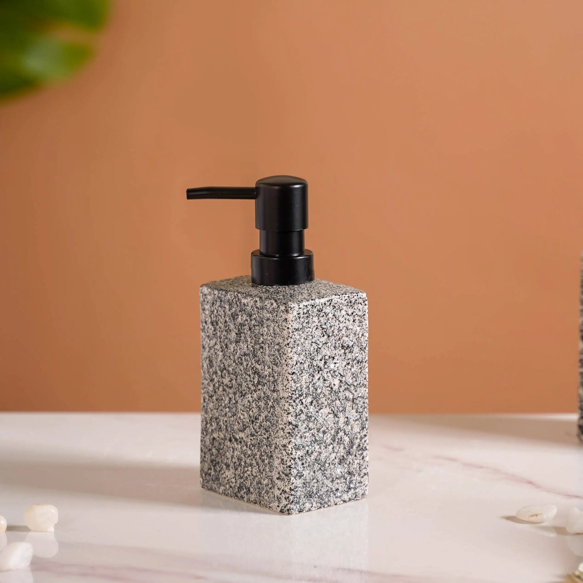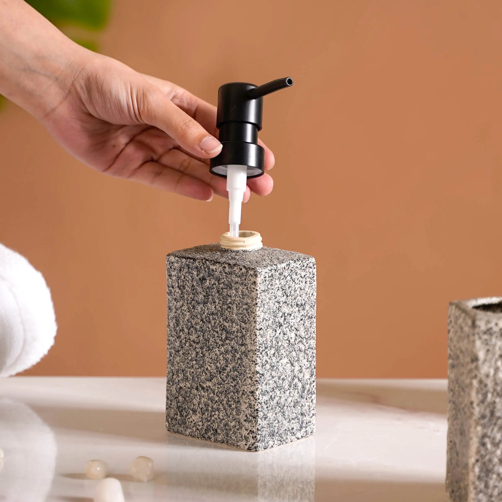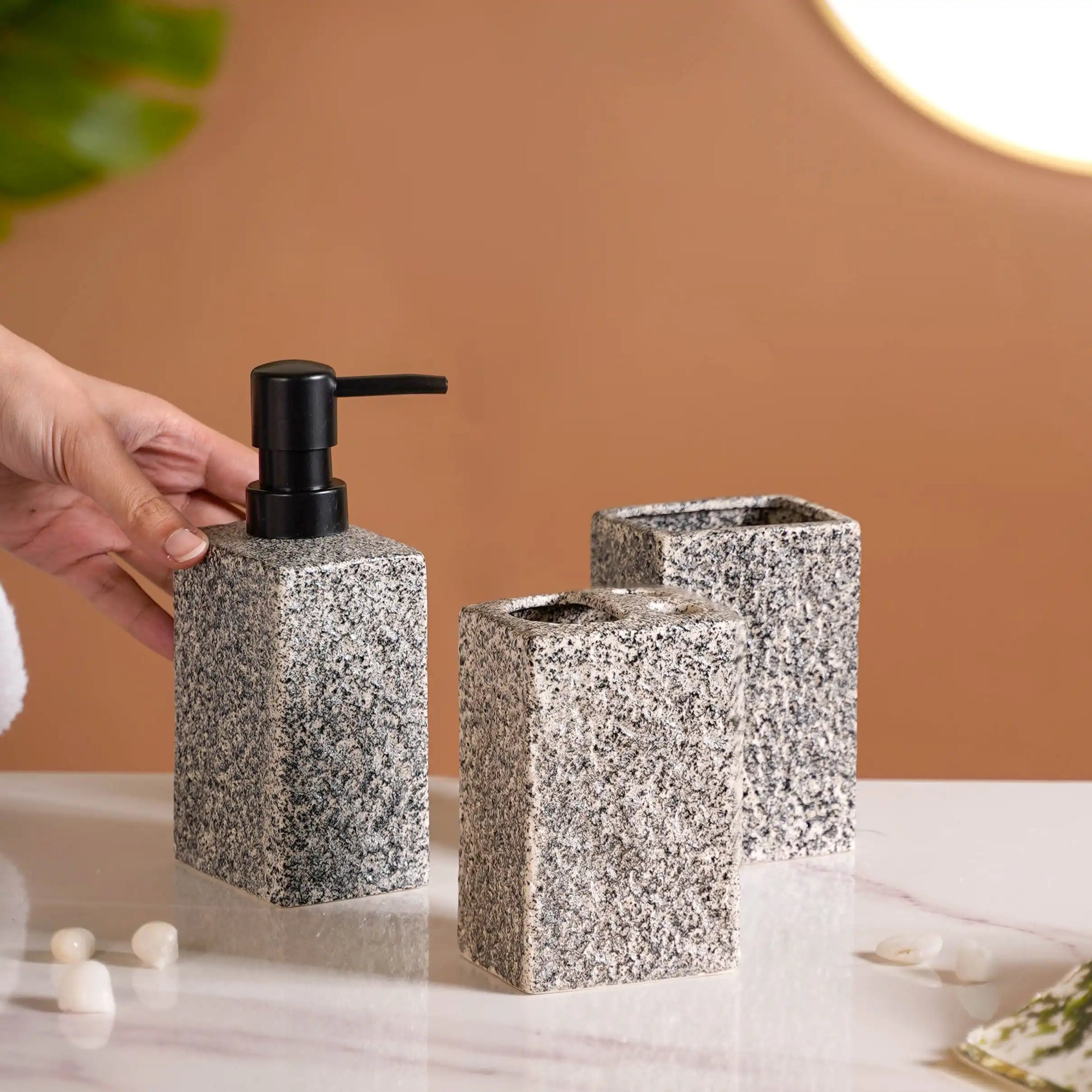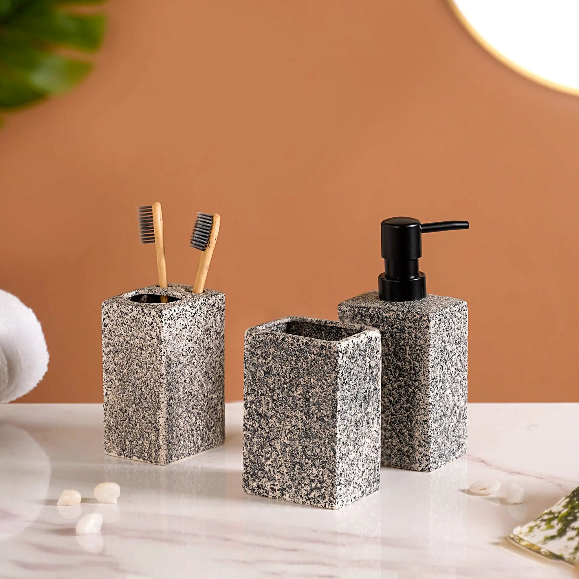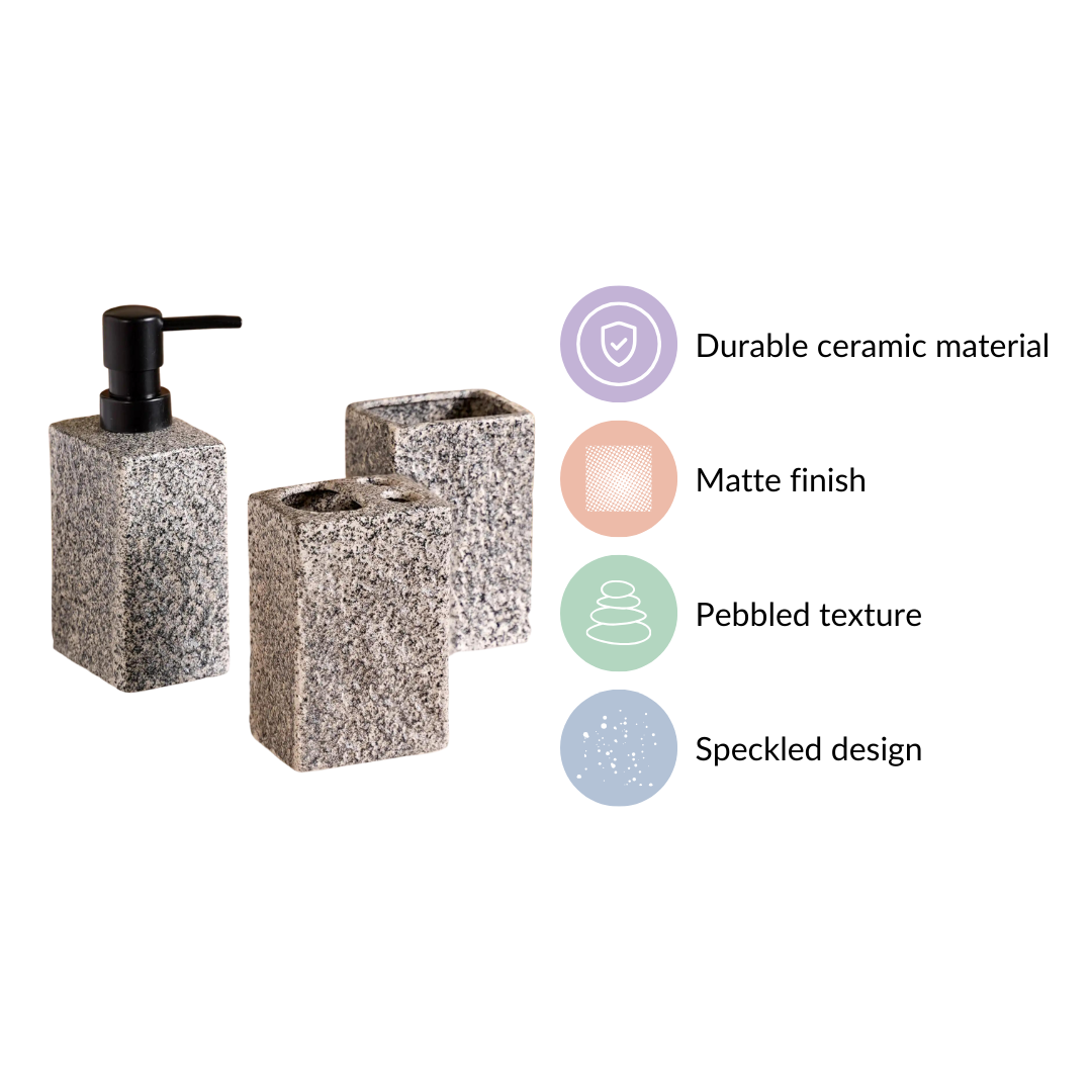 Elevate your bathroom decor with our ceramic bathroom set. Crafted with expert precision, the bath set includes three essential pieces: a refillable soap dispenser with a sturdy nozzle pump, a ceramic tumbler, and a toothbrush holder with divided sections for superb organisation. The durable ceramic material ensures longevity, while the smooth matte finish, pebbled texture, and speckled design add a touch of sophistication to your space. Easy to maintain and ideal for bathroom organisation, the bathroom accessories set combines functionality and style seamlessly. Upgrade your bathroom with this expertly crafted accessory ensemble for a more organised and hygienic bathroom experience.