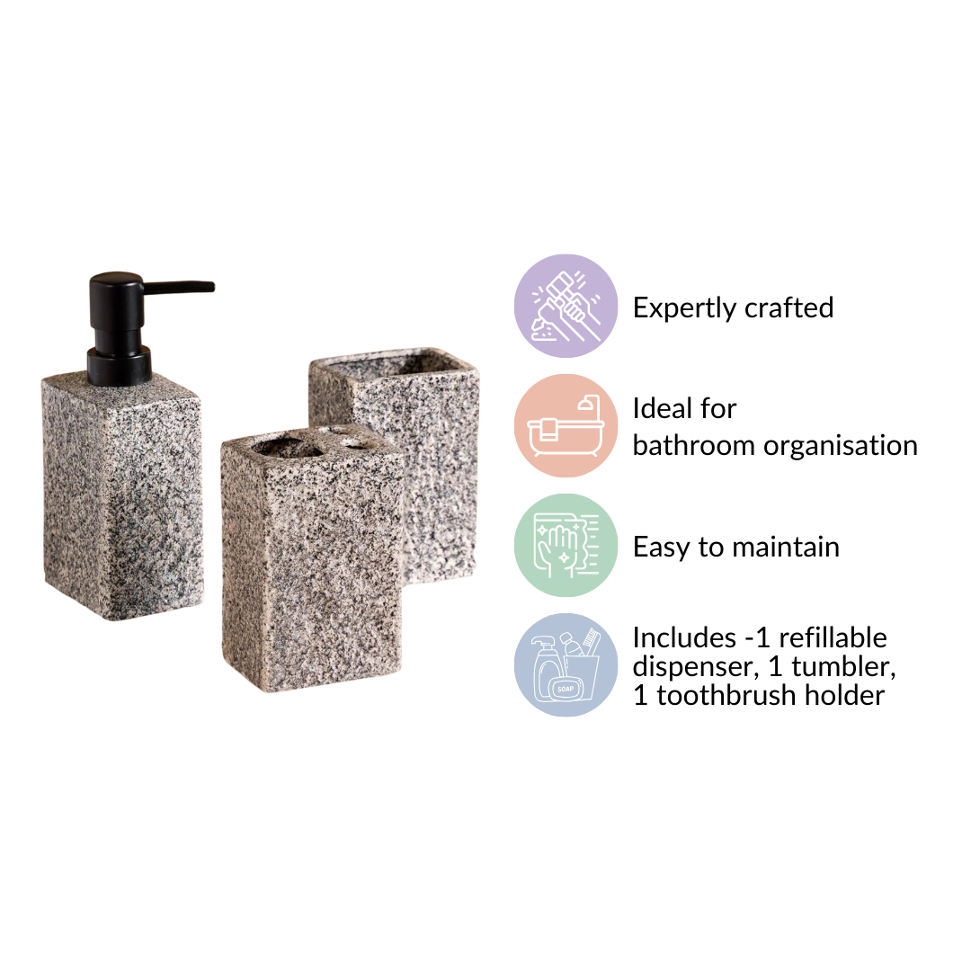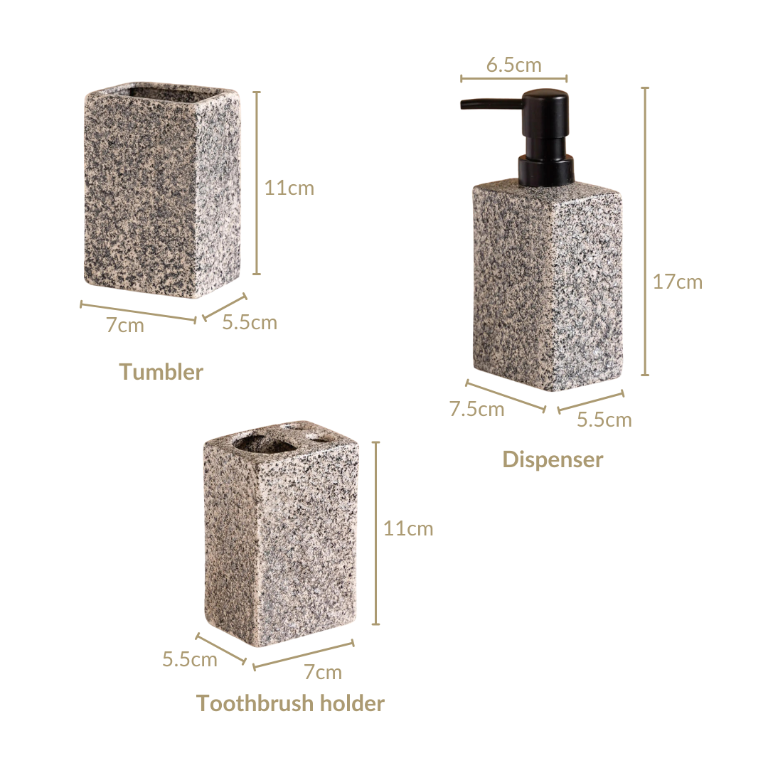 Includes - 1 refillable dispenser, 1 tumbler, 1 toothbrush holder