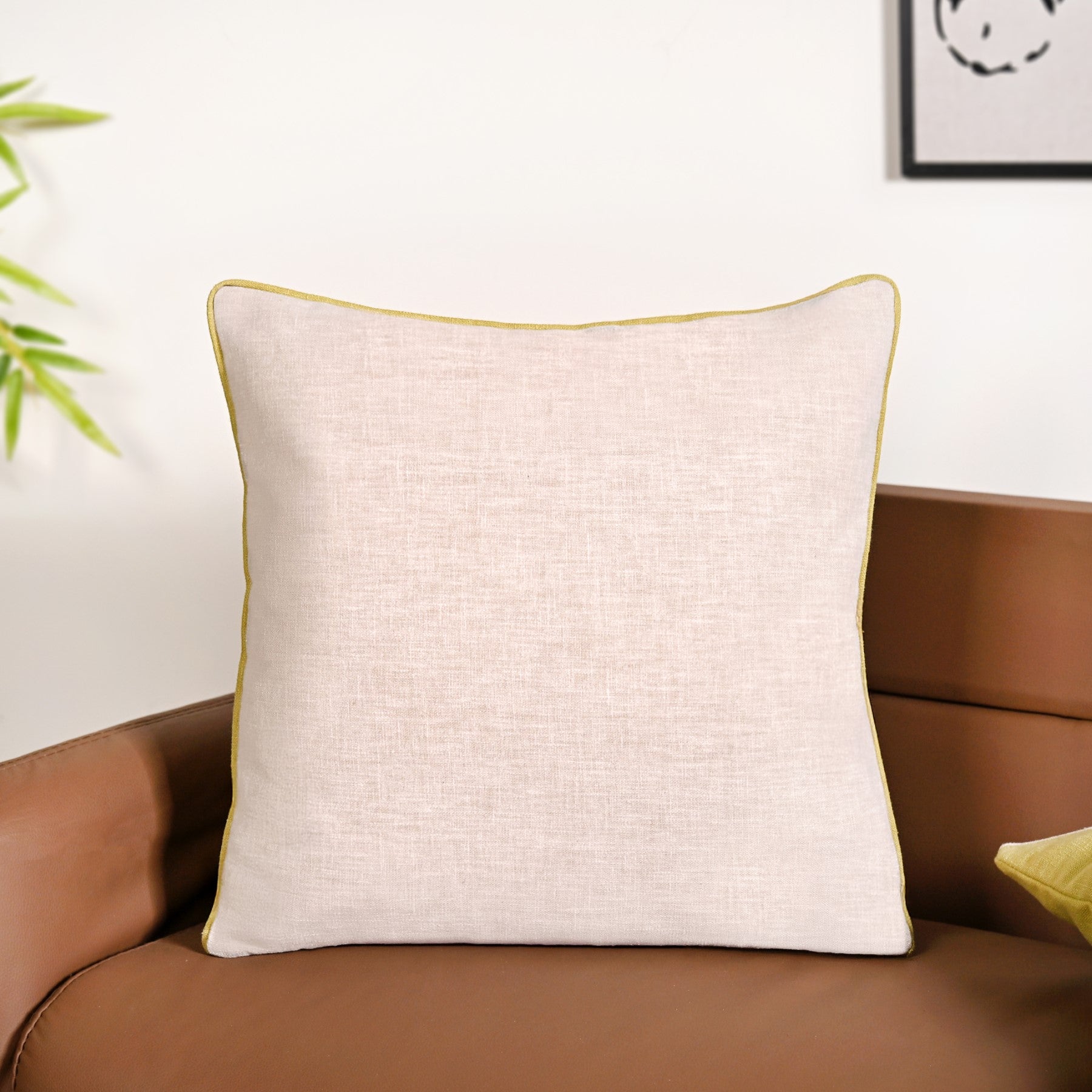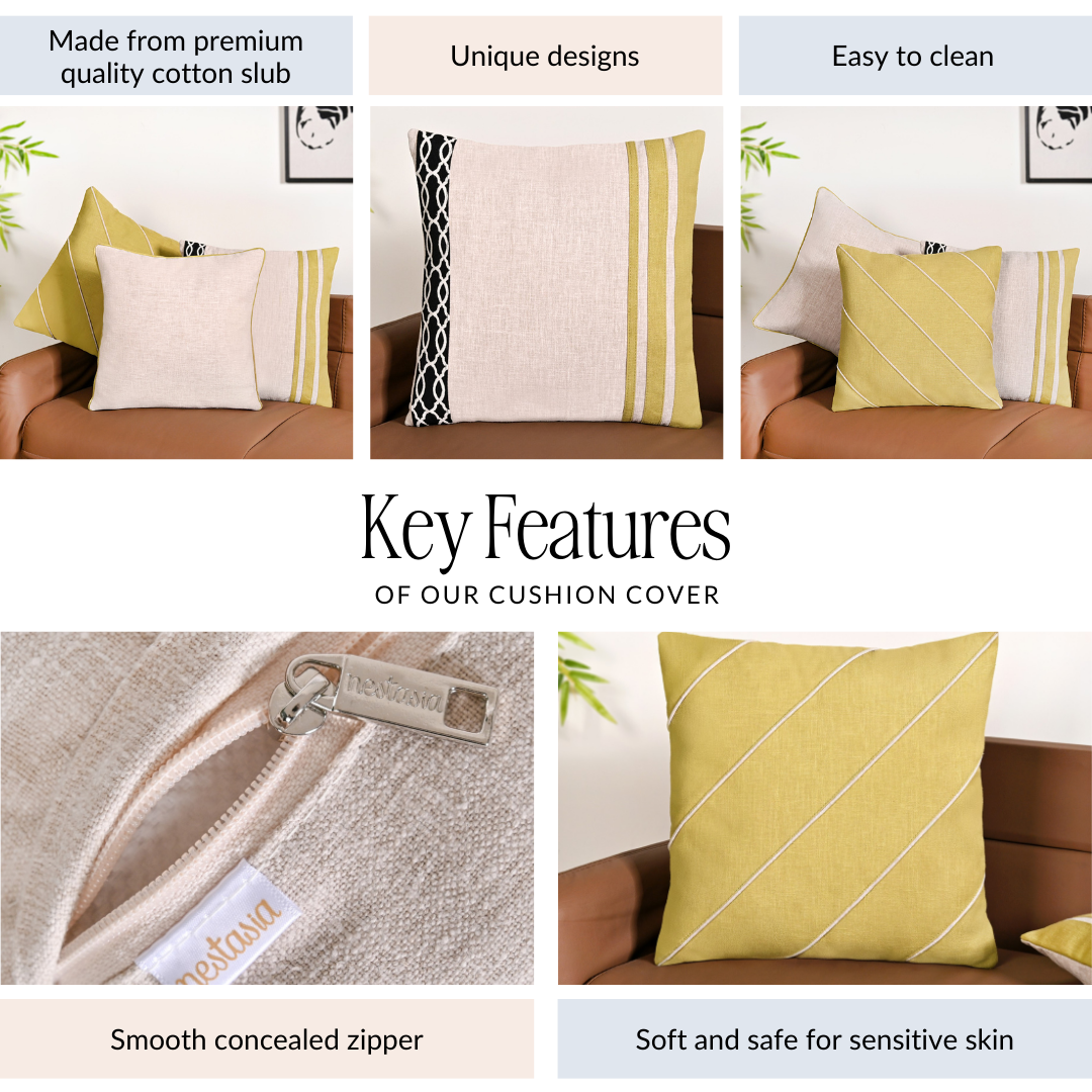 Design: Made from premium cotton slub, this cushion cover set includes three uniquely styled yet perfectly coordinated pieces. One cover features a solid beige base with neat green piping, and another has a rich, solid green body with diagonal beige piping running through the body. The third piece pairs a beige backdrop with a green side panel and a striking black-and-white patterned accent for added character.