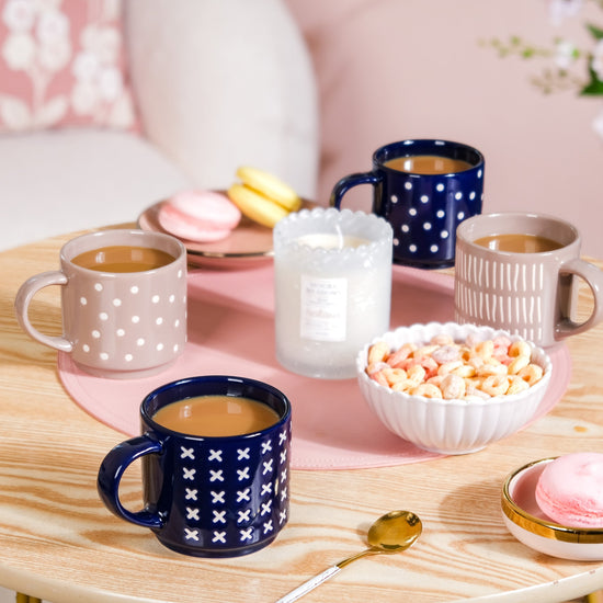 Introducing our black and white stackable cups set of 4, where style meets practicality. Crafted from premium ceramic with meticulous attention to detail, each cup features a unique design, from elegant linear patterns to playful polka dots and whimsical moon and star motifs, all silk-screen printed for enduring beauty. What truly sets these mugs apart is their stackable design and that this set comes with a convenient stand for effortless storage and display. These cups are robust and chip-resistant while offering a secure grip. Being microwave and dishwasher-safe, they simplify your daily routine.