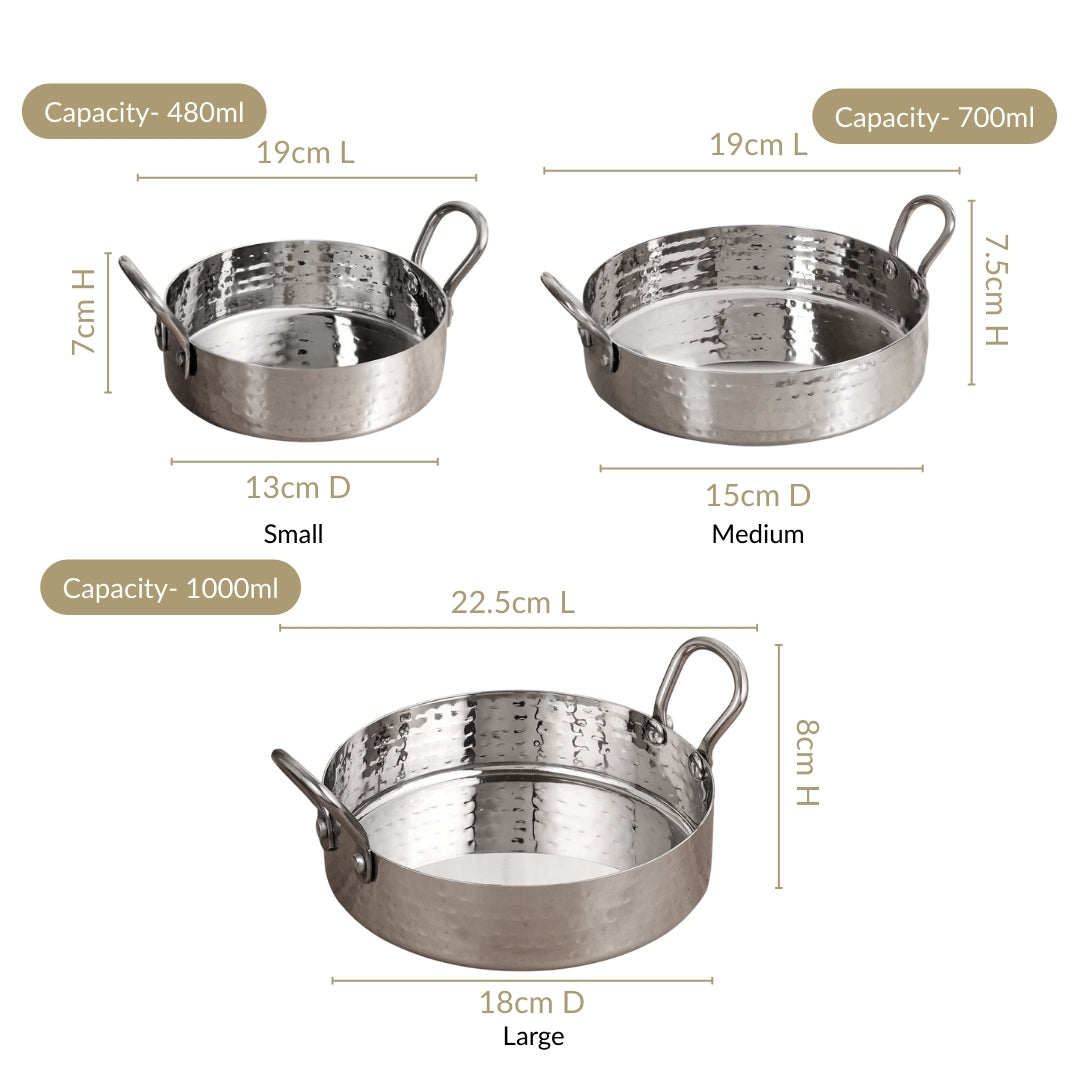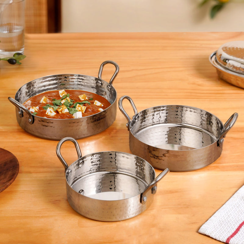 Design: Featuring a hammered finish on the outside and a shiny inner base that reflects light beautifully, each kadai in the set brings elegance to the dining table. The polished interiors add a glossy contrast to the textured exteriors, while the deep, round shape offers ample space for serving mains, gravies, or even festive desserts. Designed in three different sizes, the kadais combine traditional charm with a modern twist.