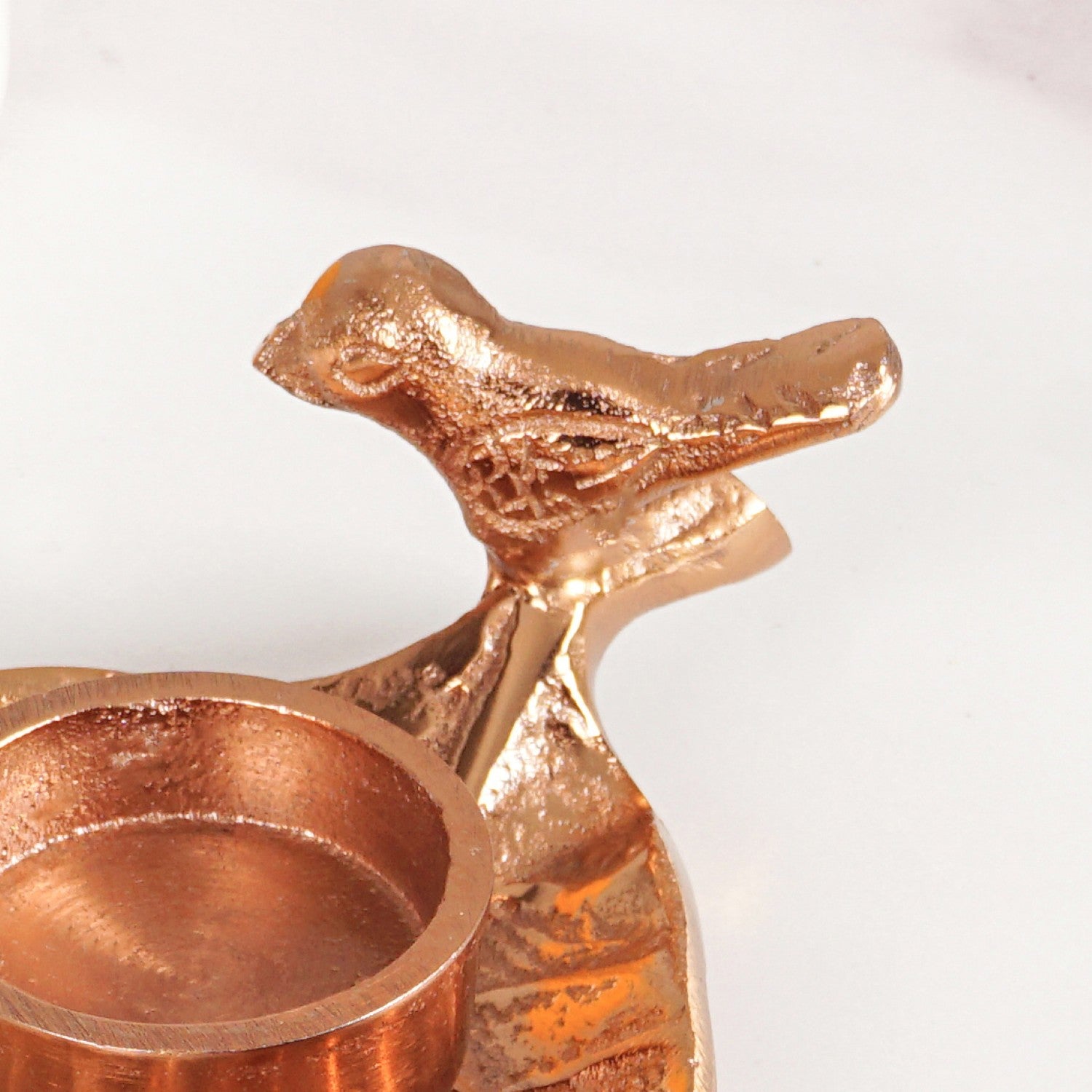 Design: Crafted from premium aluminium, this tea light holder set comes with a polished rose gold finish that radiates elegance. The textured surface adds a subtle metallic sheen, making it stand out in any festive décor. Designed in the shape of a leaf, the base is detailed with vein patterns, while a perched bird figure at the top lends a graceful, artistic touch. At the centre, a raised circular holder provides a perfect fit for tealights, creating a nature-inspired accent.