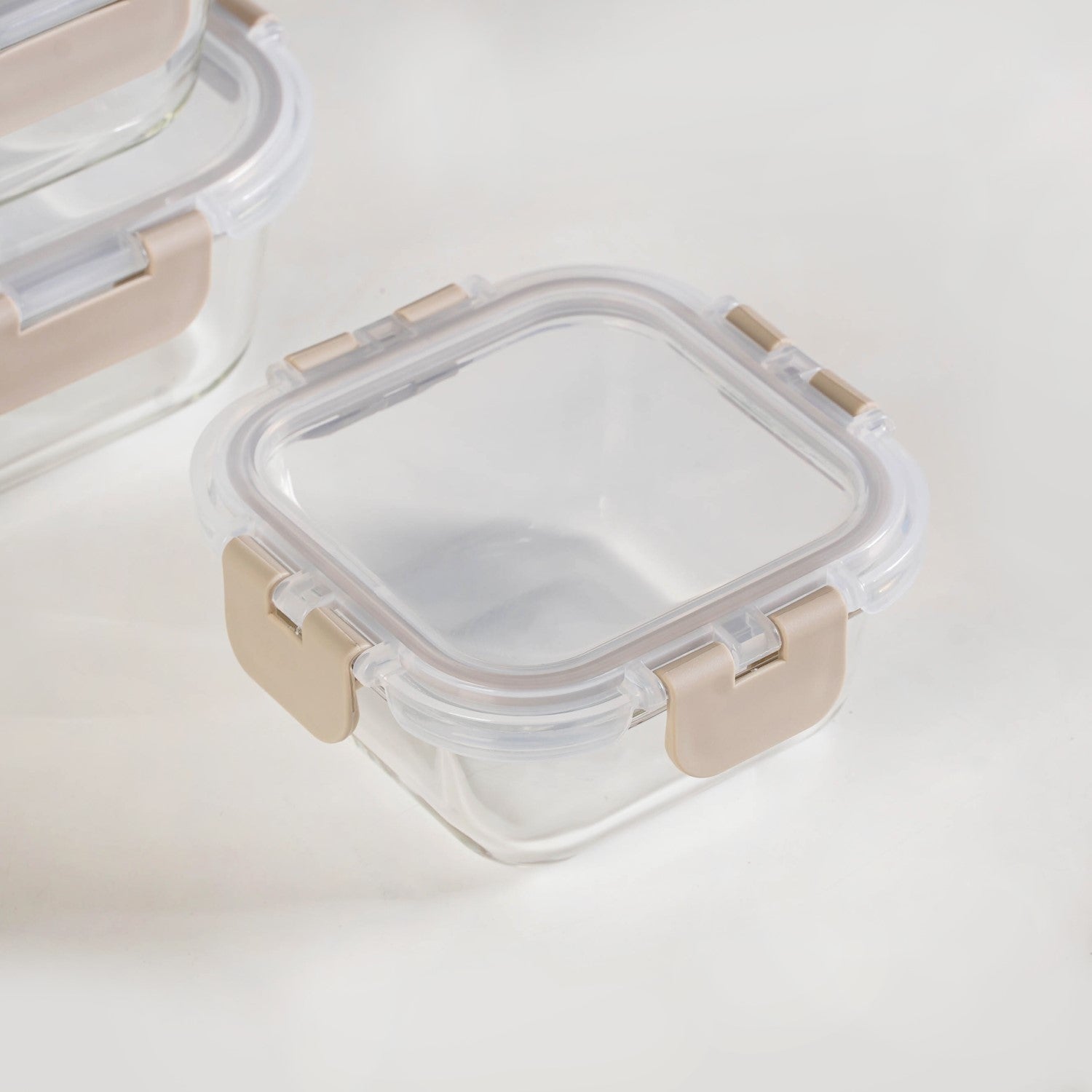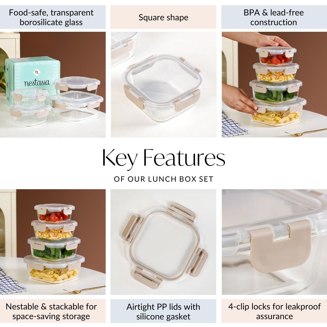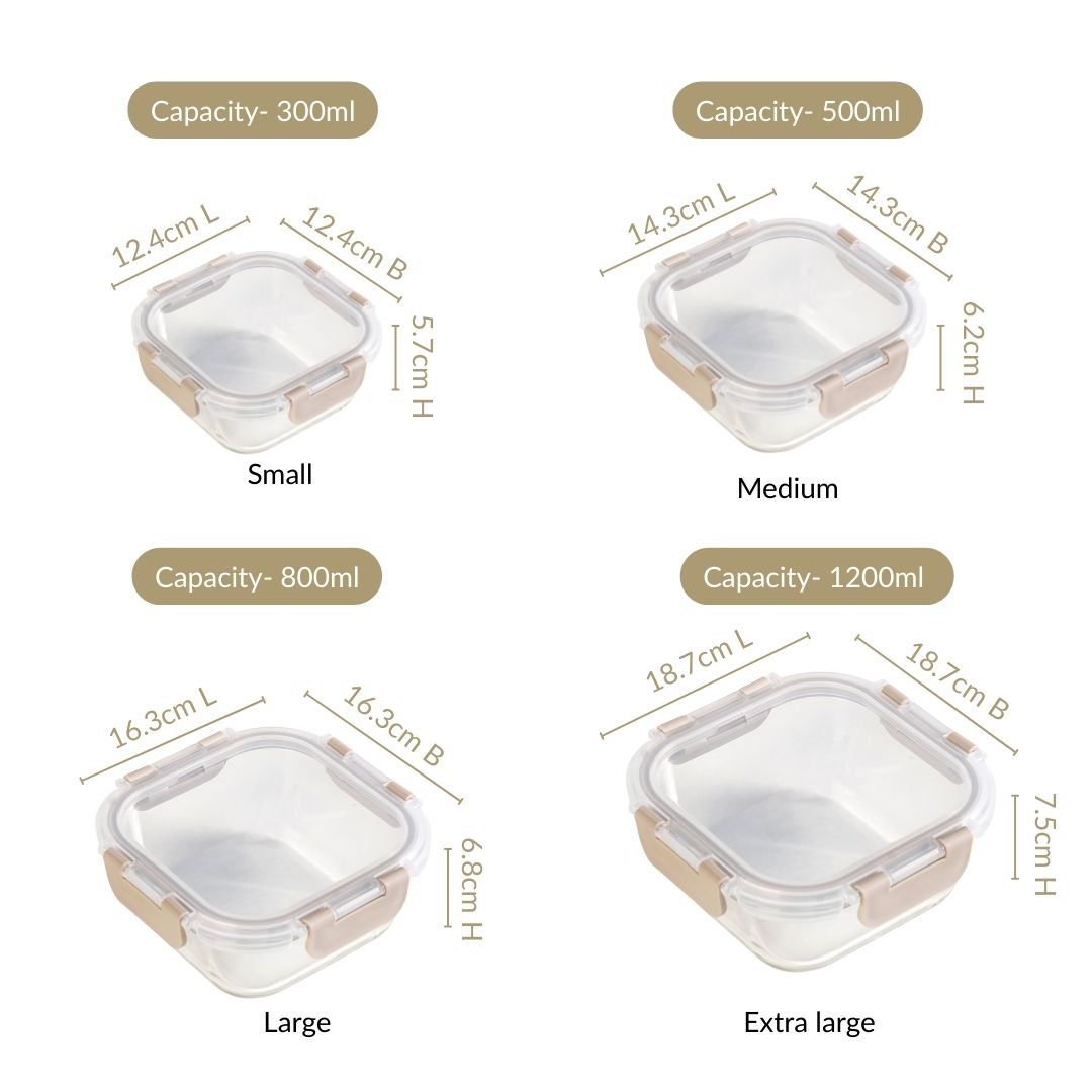 Design: This set's modern aesthetic is defined by its clean, square shape. Each container is made from premium, transparent borosilicate glass, featuring a transparent PP lid with subtle beige clips for a touch of color. A robust 4-clip lock system ensures a strong, secure seal. When not in use, the containers' nestable design allows them to be placed inside each other, and when full they can be stacked vertically.