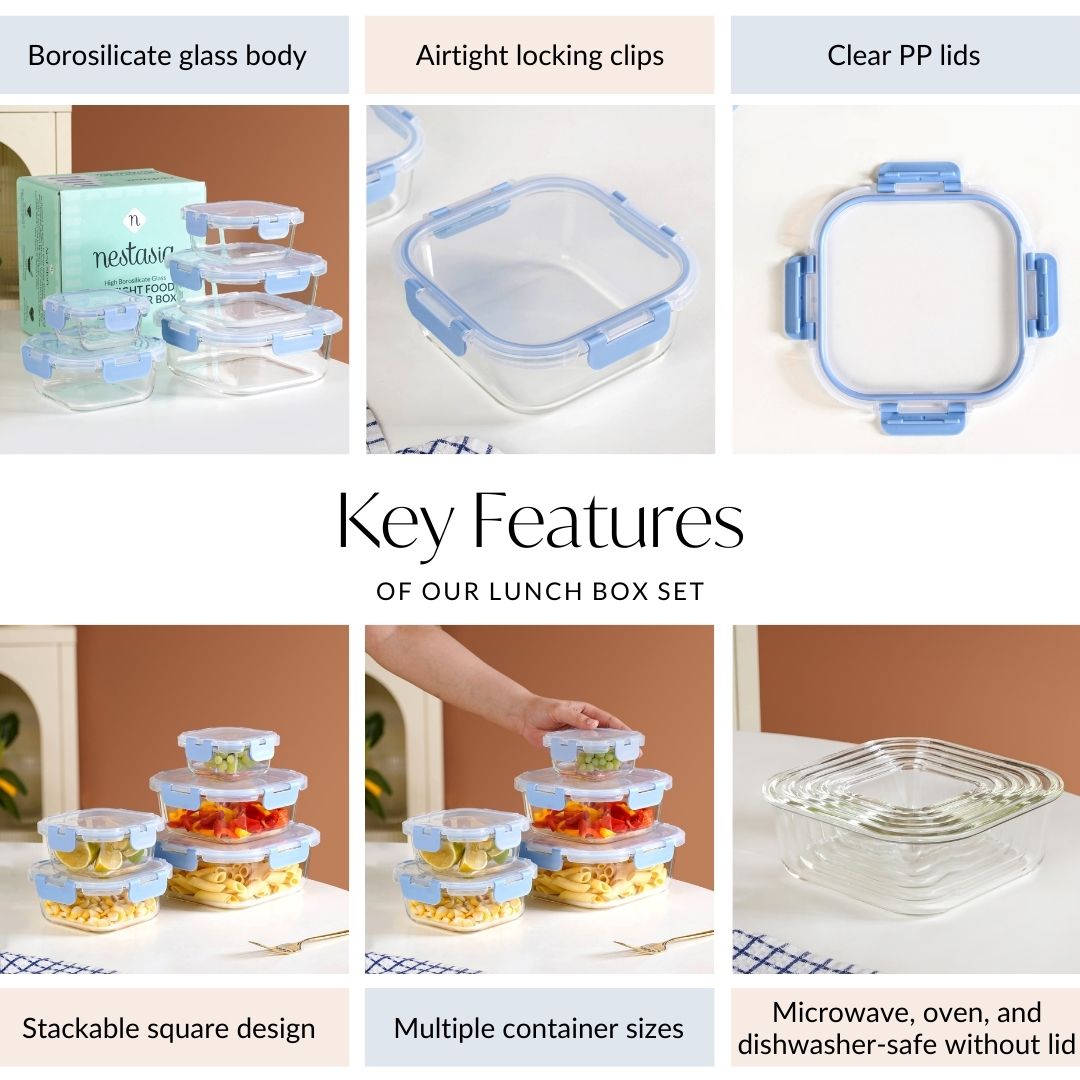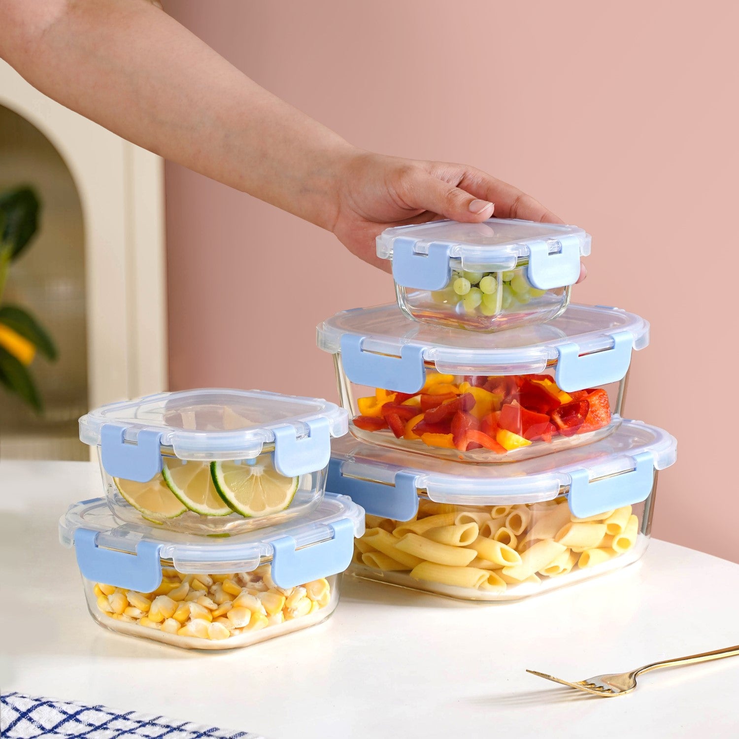 Design: Made from high quality borosilicate glass, this set of 5 containers features a transparent body for effortless content visibility. The blue airtight locking clips pair with clear Polypropylene (PP) sealing lids to prevent leaks and lock in freshness. Each piece is designed to be stackable, making cupboard and fridge organisation simple. The containers come in varying sizes to suit different portion needs. Thick durable walls offer strength, while BPA-free components ensure safe everyday use. Oven safe without lids, the set is built for versatile kitchen tasks.