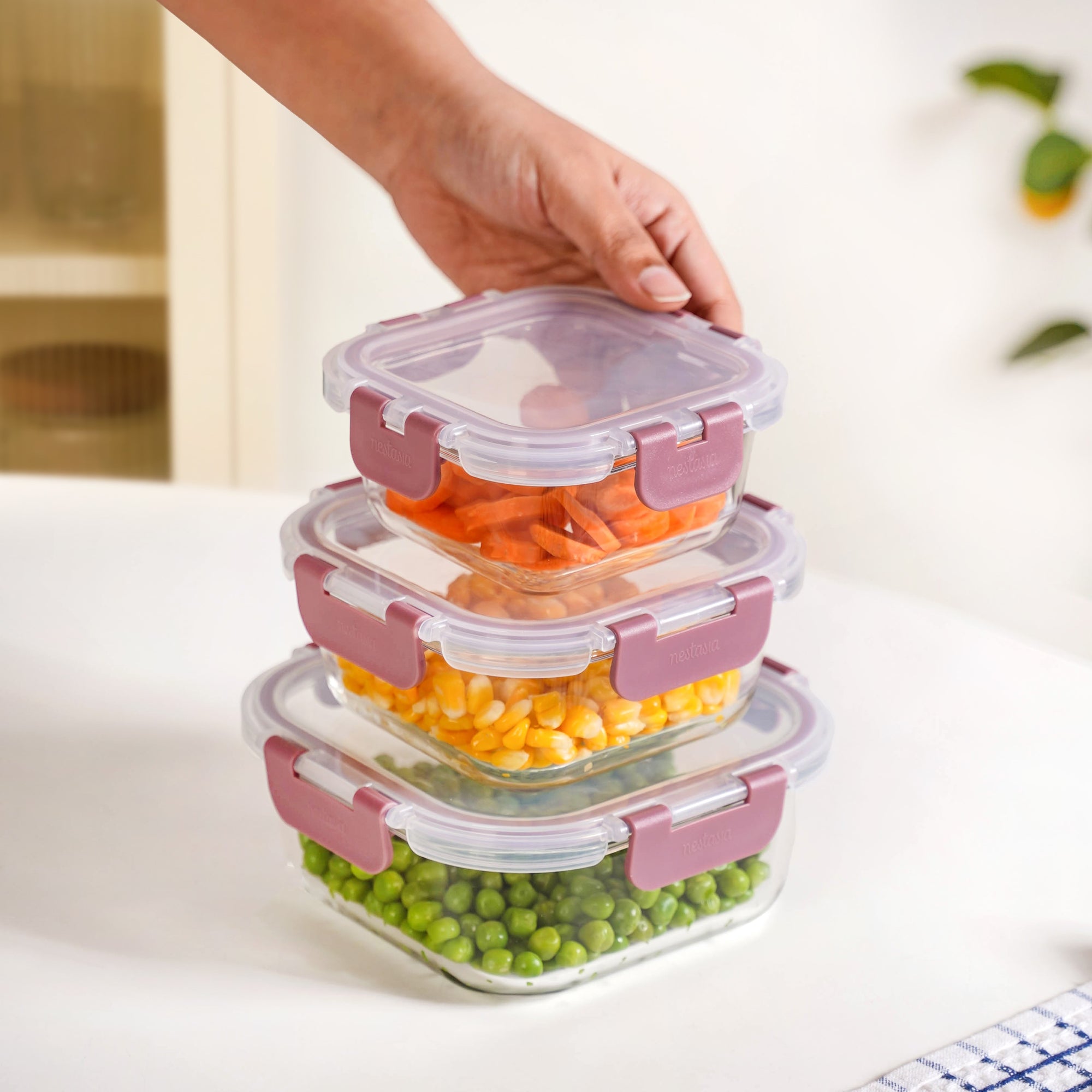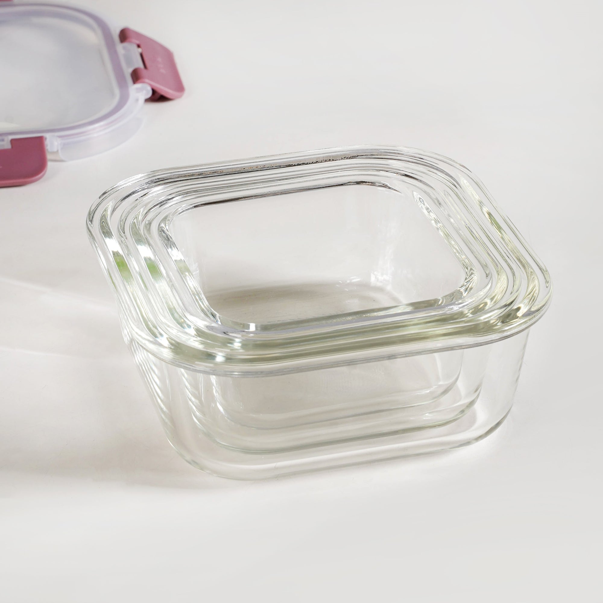 Design: This set features square high borosilicate glass containers with transparent bodies for a clean, modern kitchen aesthetic. Each container has a mauve PP lid with a silicone gasket for secure, airtight closure. Subtle grooves at the base prevent slipping, and the containers come in varying capacities for versatile storage. Stackable design maximizes cupboard, fridge, and pantry space, combining durability, clarity, and refined style in every piece.