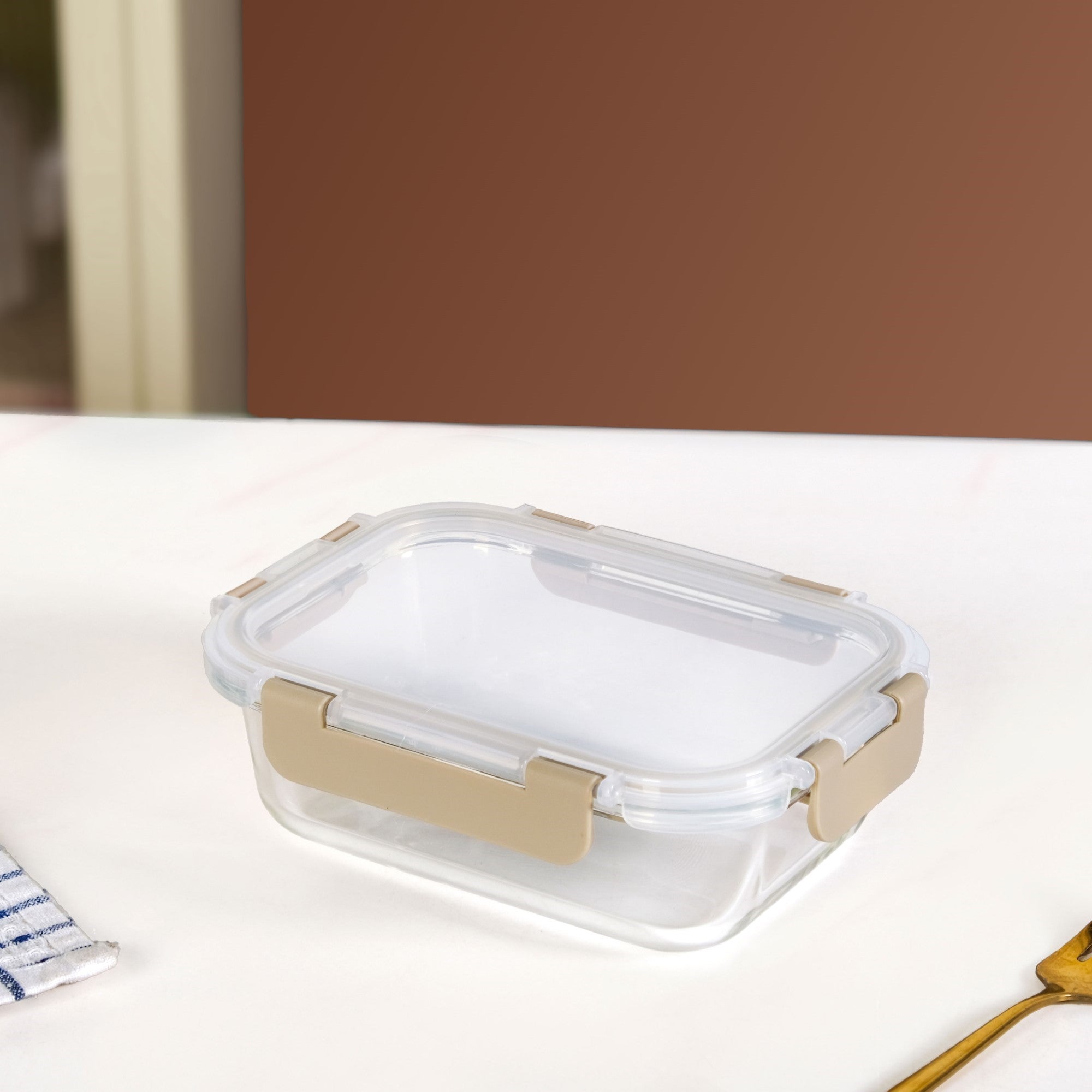 Design: This versatile borosilicate glass set is designed with a sleek, rectangular shape that maximizes space. Each container is made from premium, transparent borosilicate glass and features a transparent PP lid with a subtle beige rim and matching 4-clip locks. These clips create a strong, secure seal, while the nestable and stackable design ensures the containers save valuable cabinet space when not in use.
